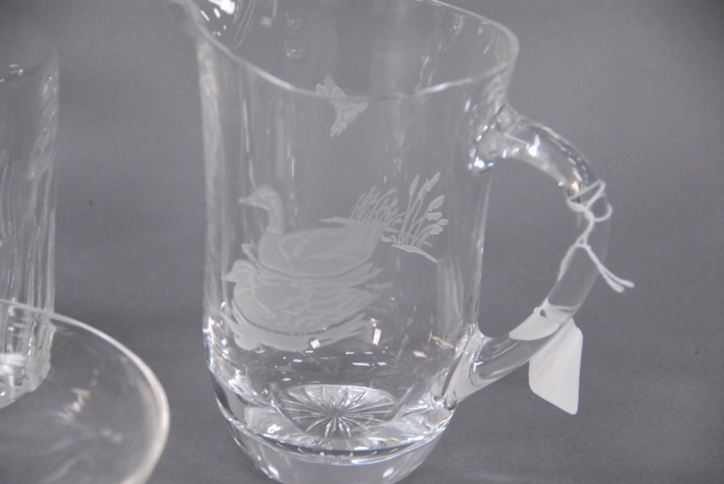 Five piece lot of crystal Bacarat steeple, Bacarat decanter, Stueben whale lg. 5, Stueben bowl, and cut crystal pitcher with etched ducks.