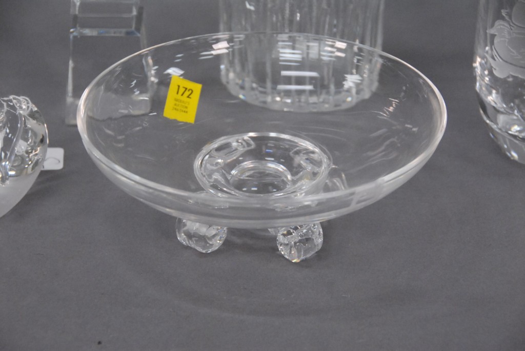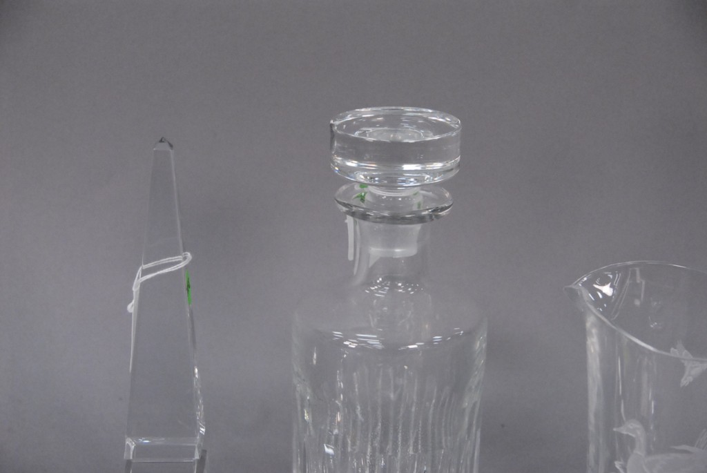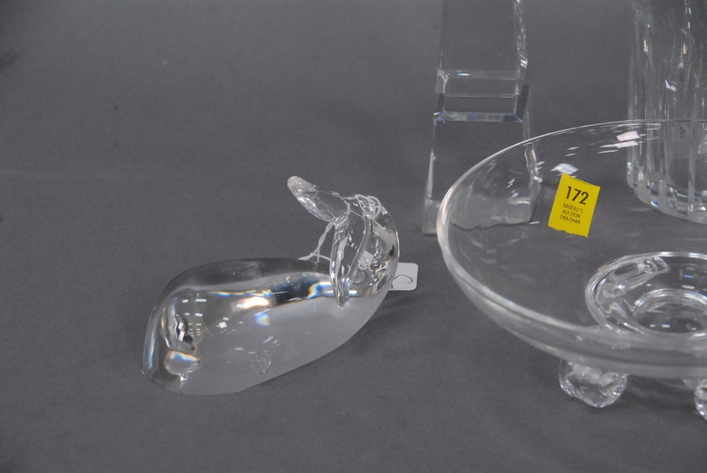 Lot 172: Five piece lot of crystal Bacarat steeple, Bacarat decanter, Stueben whale lg. 5, Stueben bowl, and cut crystal pitcher with etche…