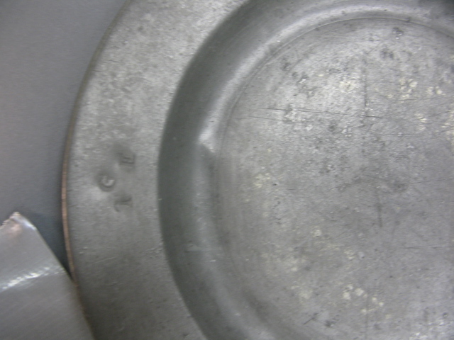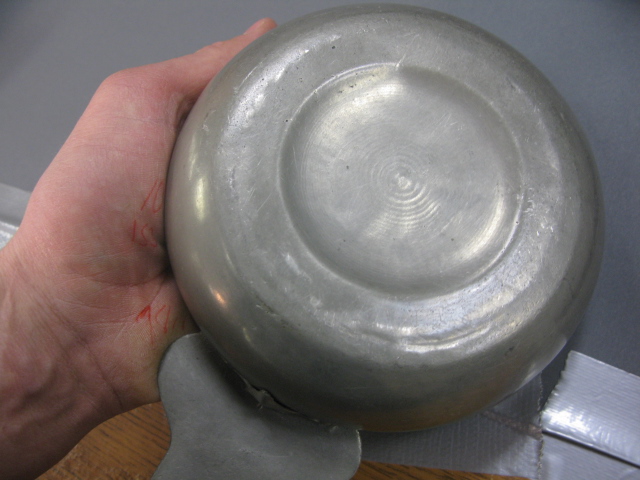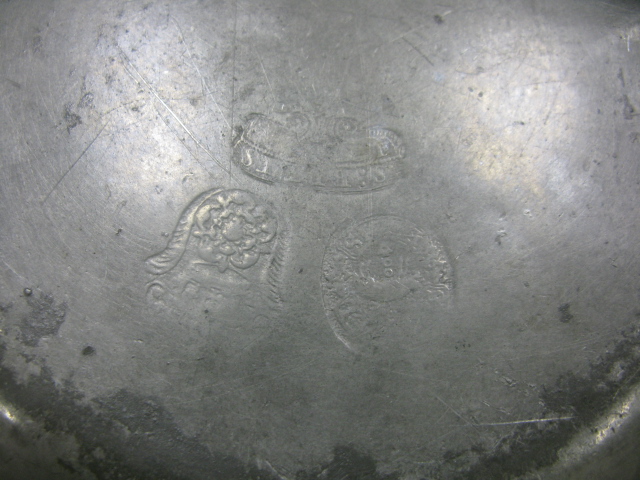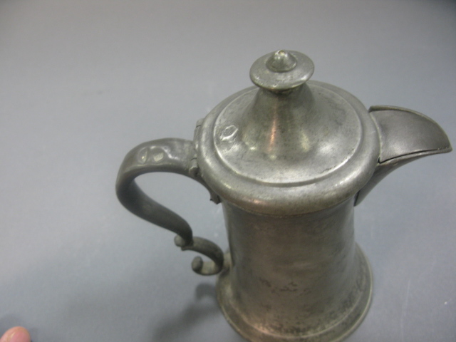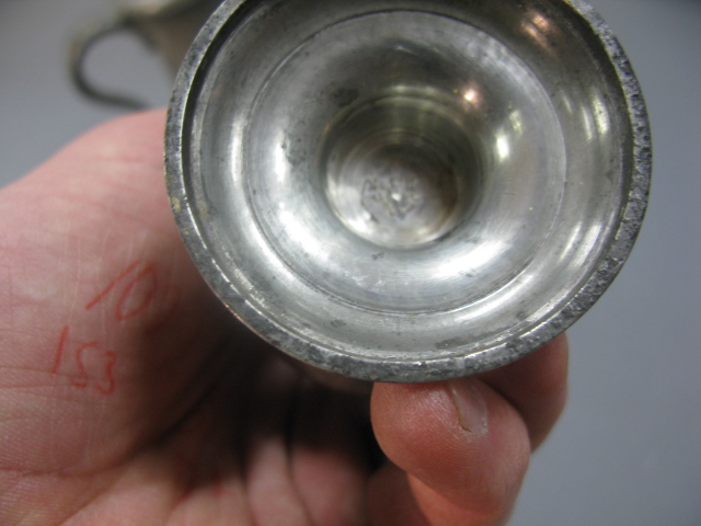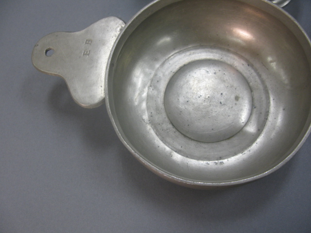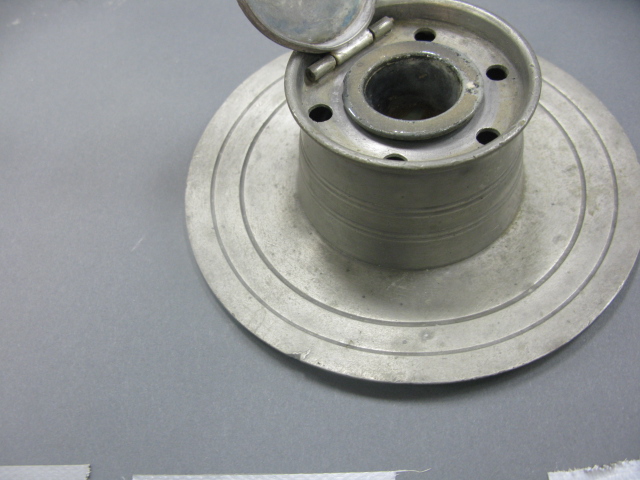 Five piece primitive pewter lot including porringer, small caster, teapot, plate and inkwell.