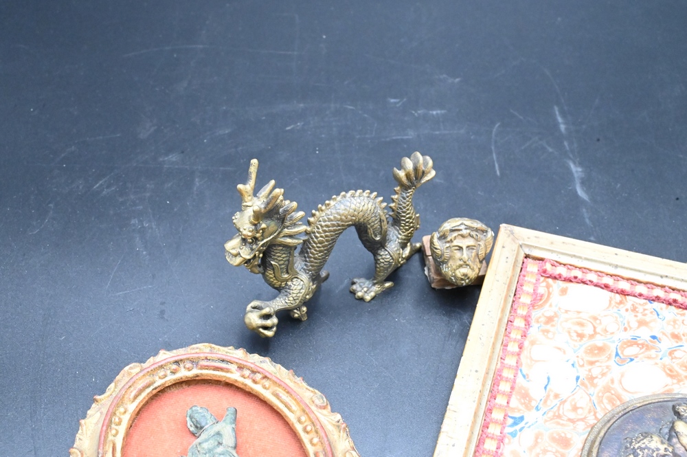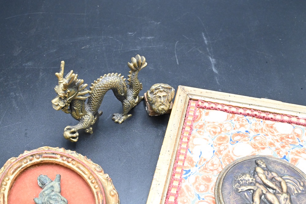 Four Bronzes, to include an early round plaque of a lion fighting Hercules, diameter 3 1/8 inches; a small bronze head; ancient bronze figure; along with a bronze dragon. Provenance: Estate of Wallace Bradway, New Haven, CT