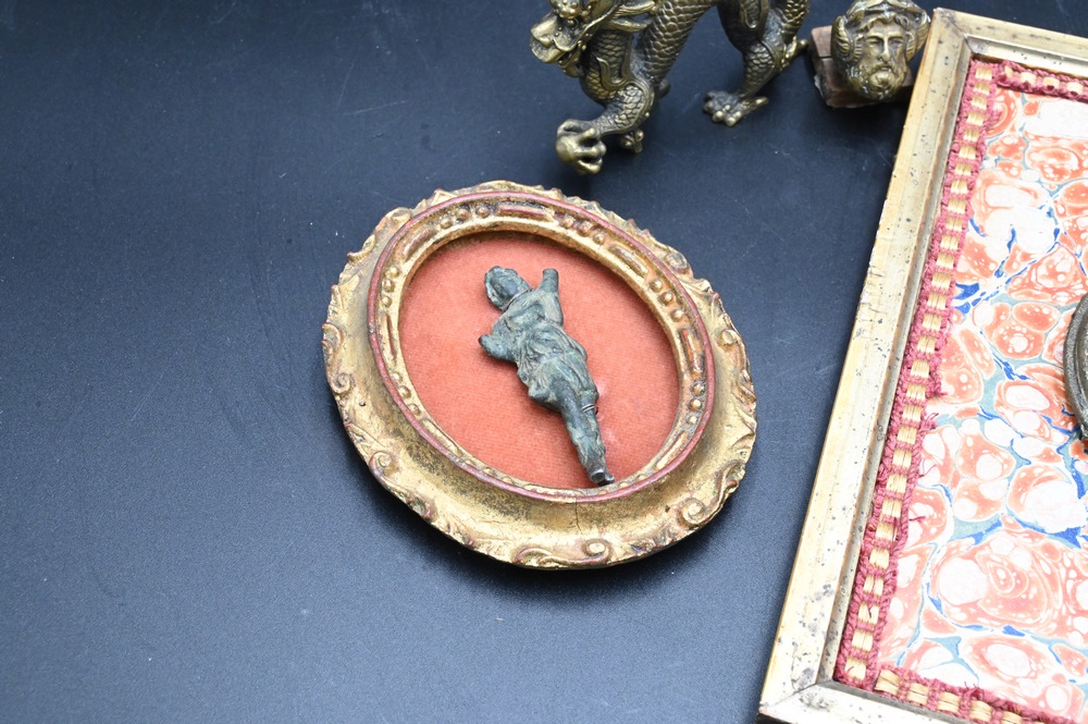 Lot 172: Four Bronzes, to include an early round plaque of a lion fighting Hercules, diameter 3 1/8 inches; a small bronze head; ancient bronze figure; along with a bronze dragon. Provenance: Estate of Wallace Bradway, New Haven, CT