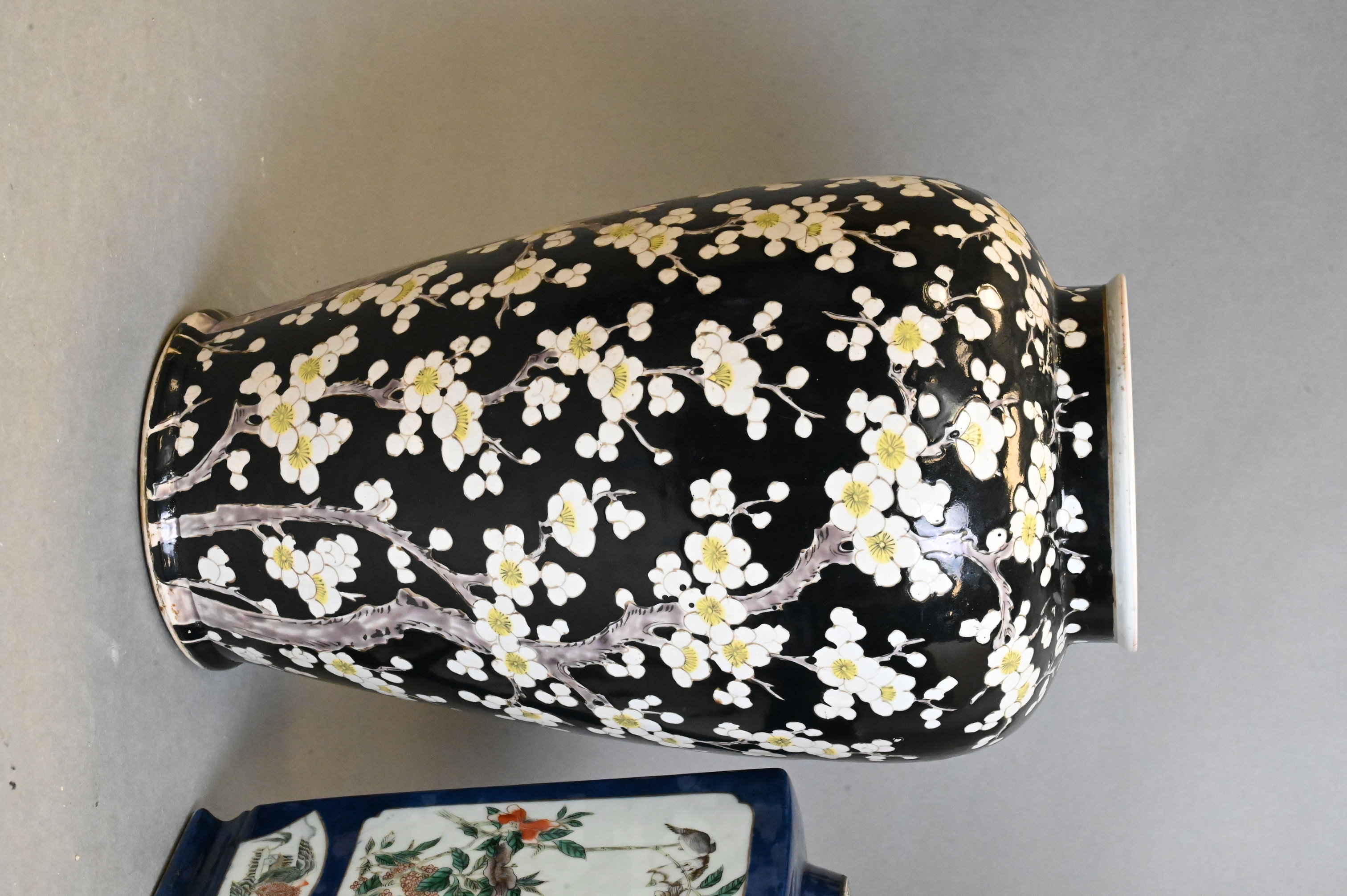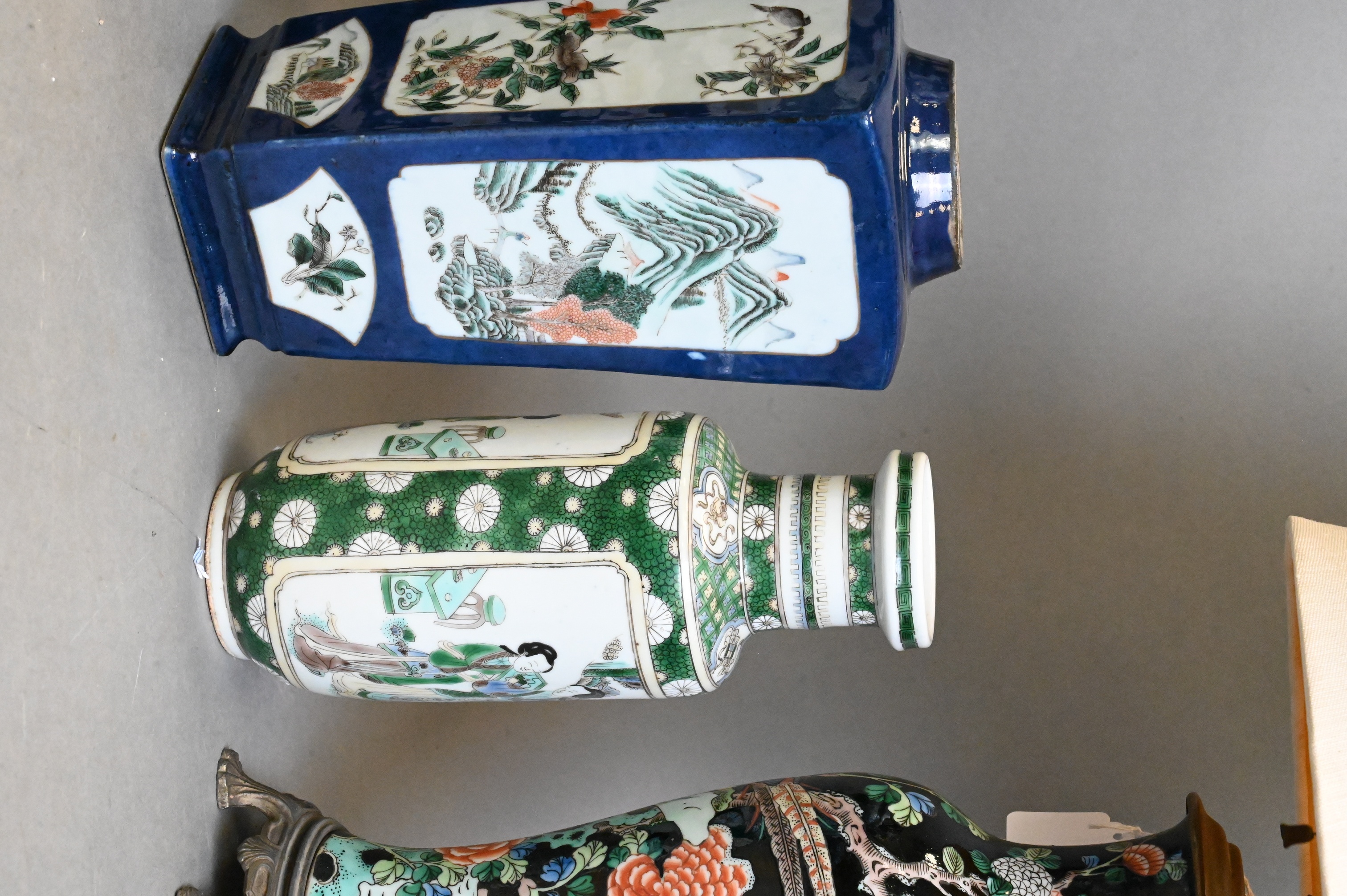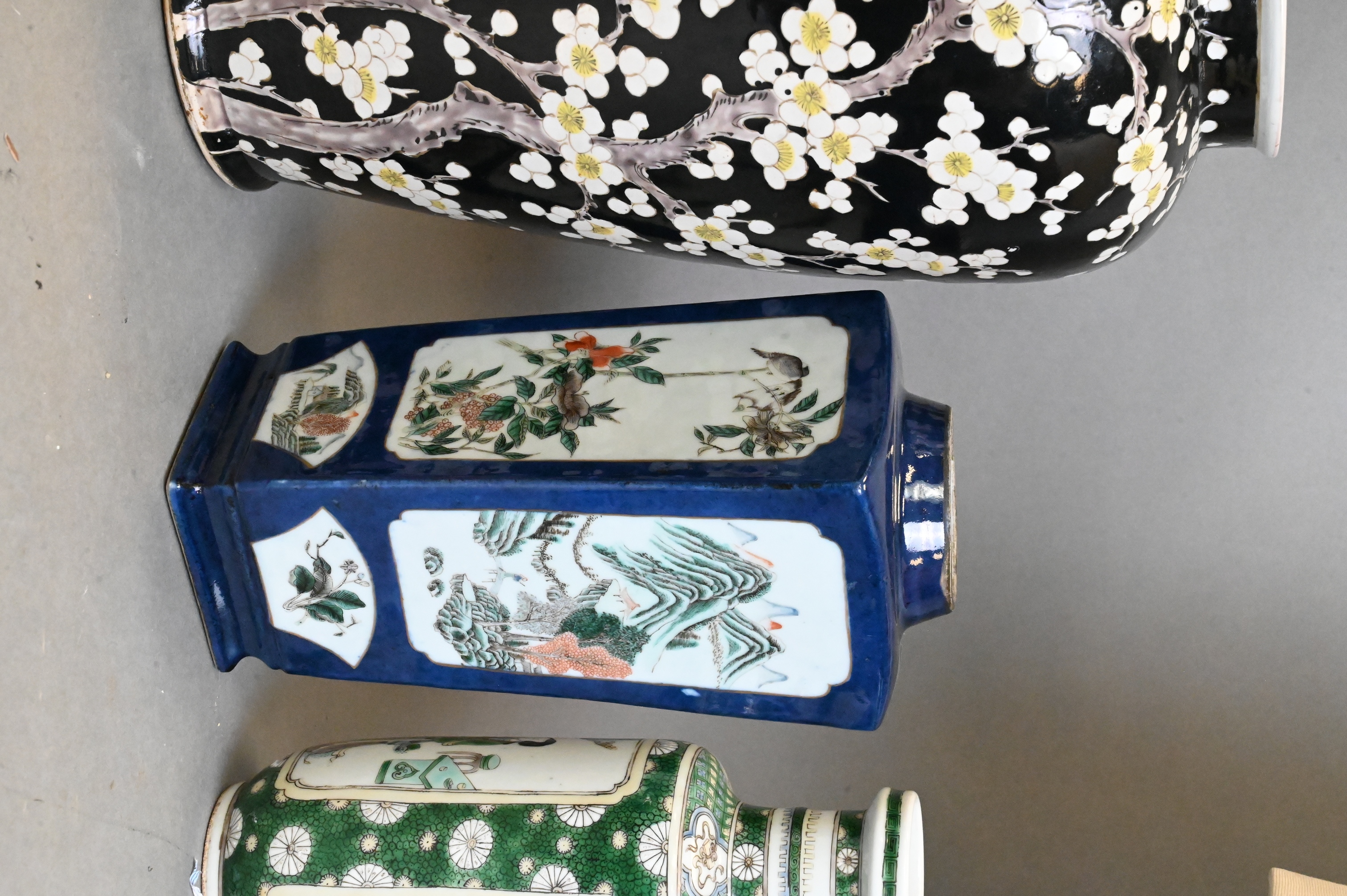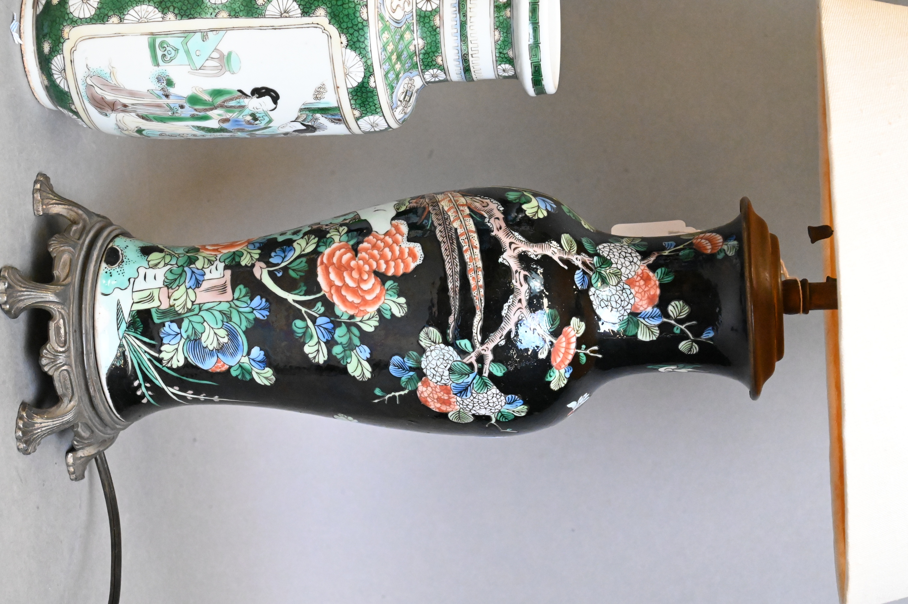 including a famille verte baluster vase decorated with figures in a garden setting, a rectangular cobalt-ground vase with famille rose panels of flowers and landscape scenes, a black-ground vase with flowering prunus branches, and a similar example mounted as a table lamp with polychrome floral and bird decoration