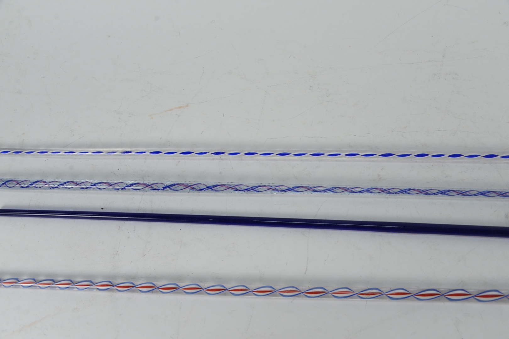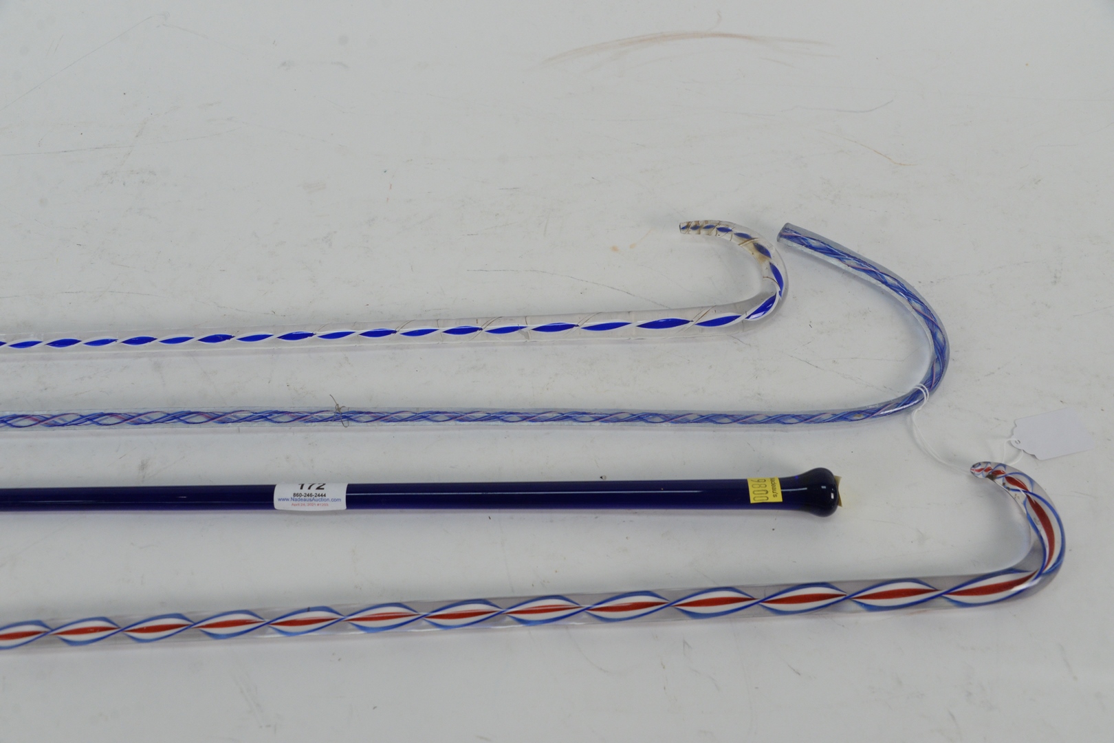 Lot 172: Four Piece Group of Glass Nailsea Canes and Walking Sticks, two having twist in red, white and blue one with blue and white twist, and the other cobalt blue, tallest 51 inches.