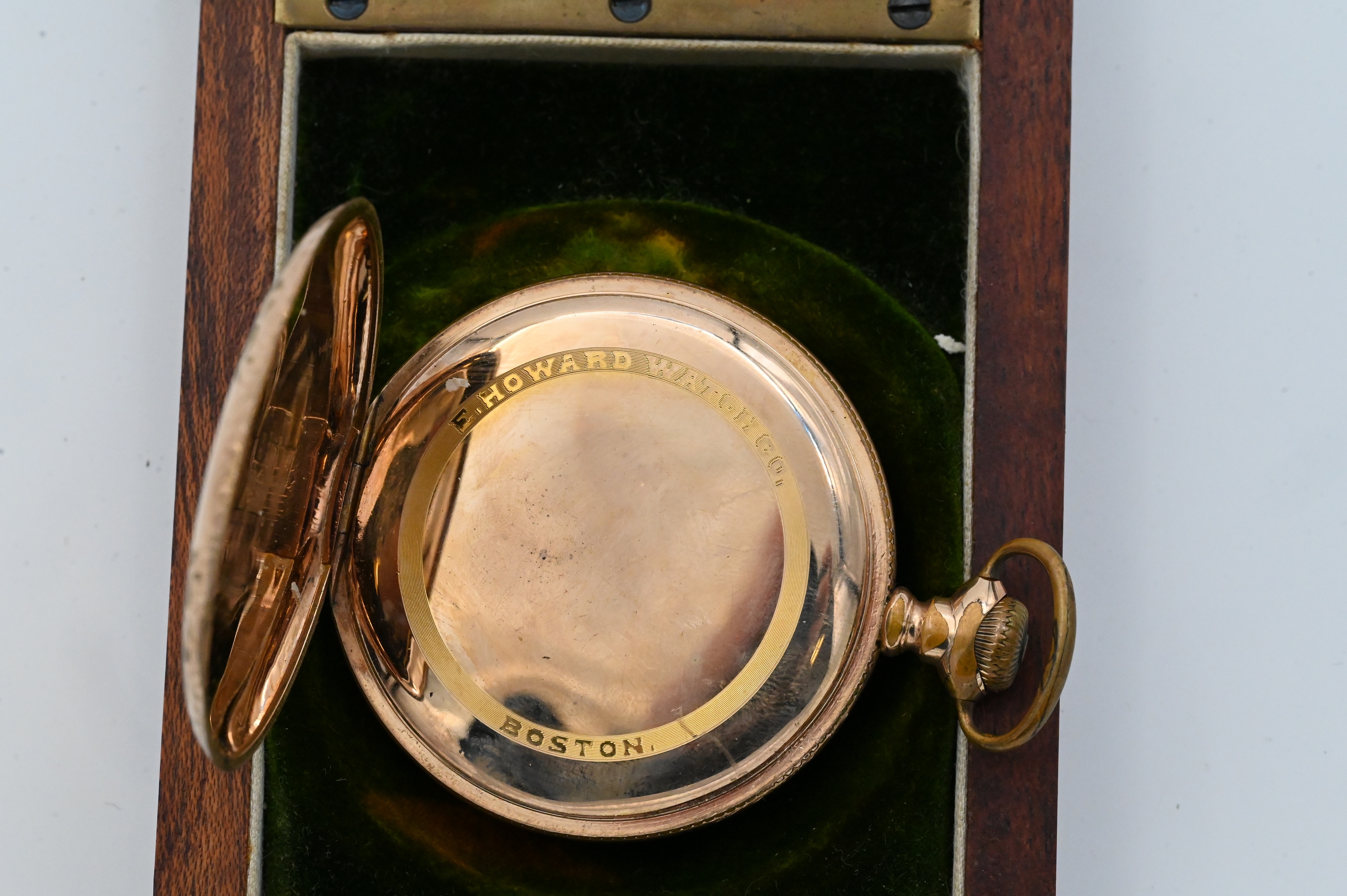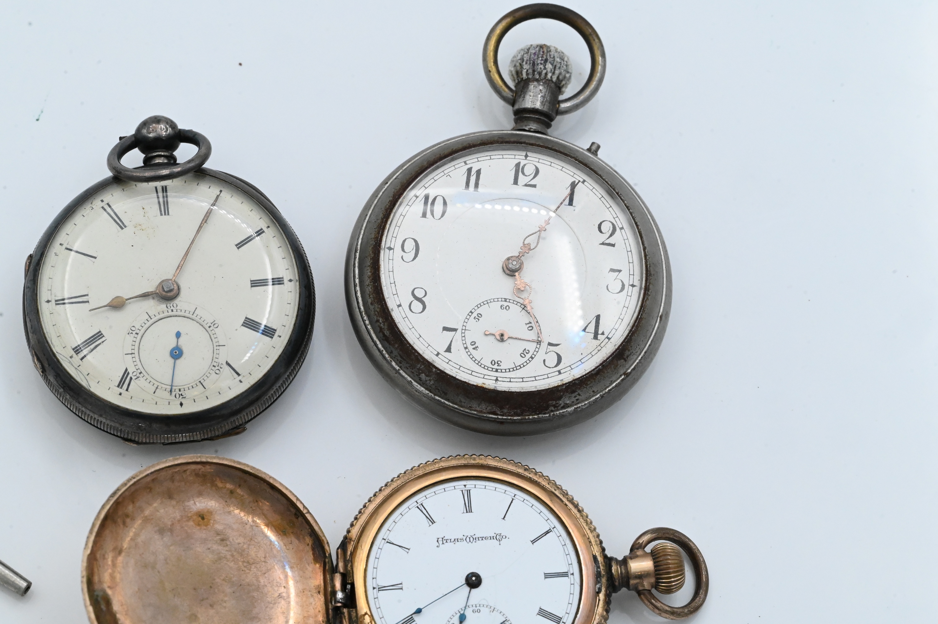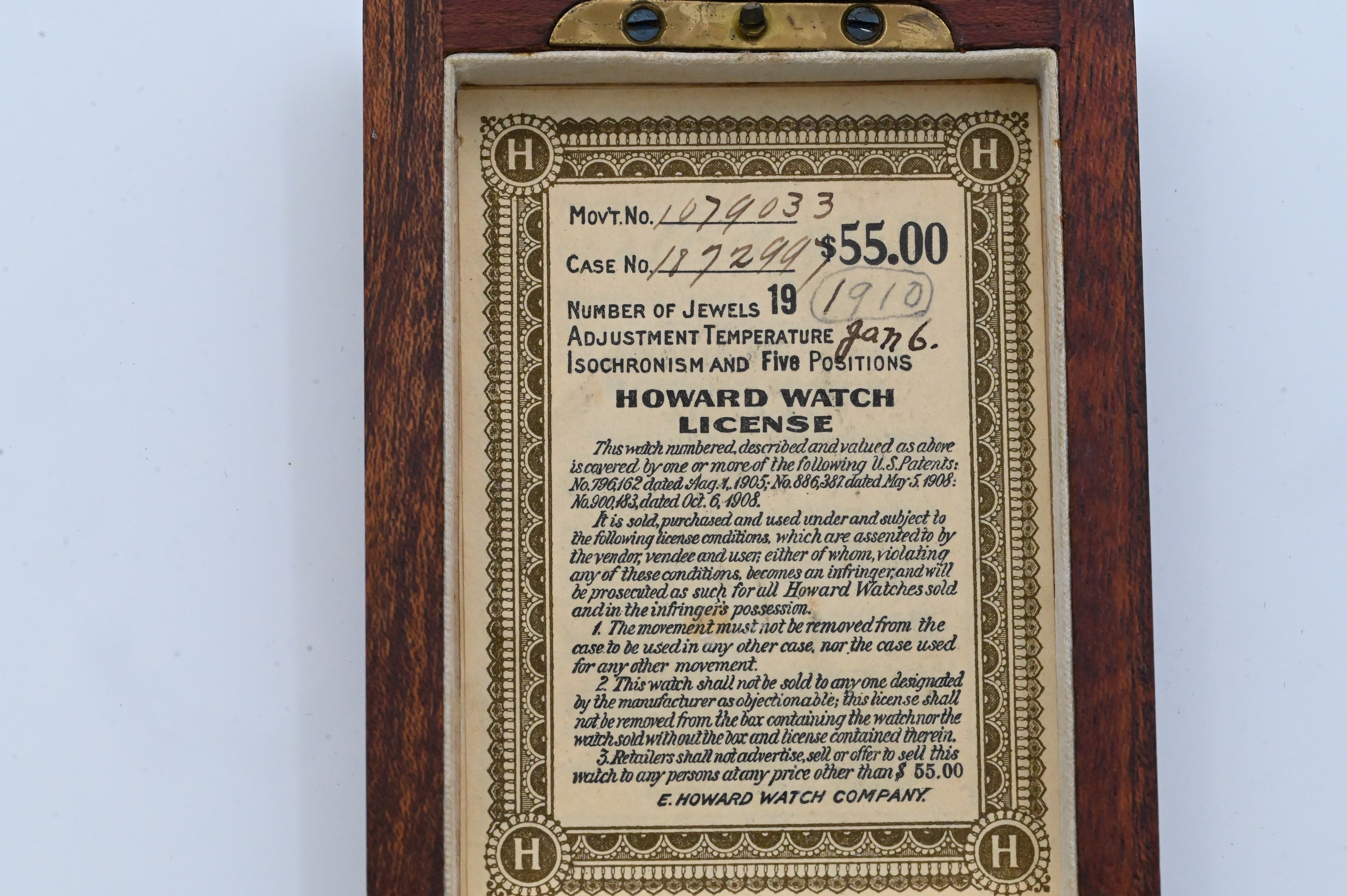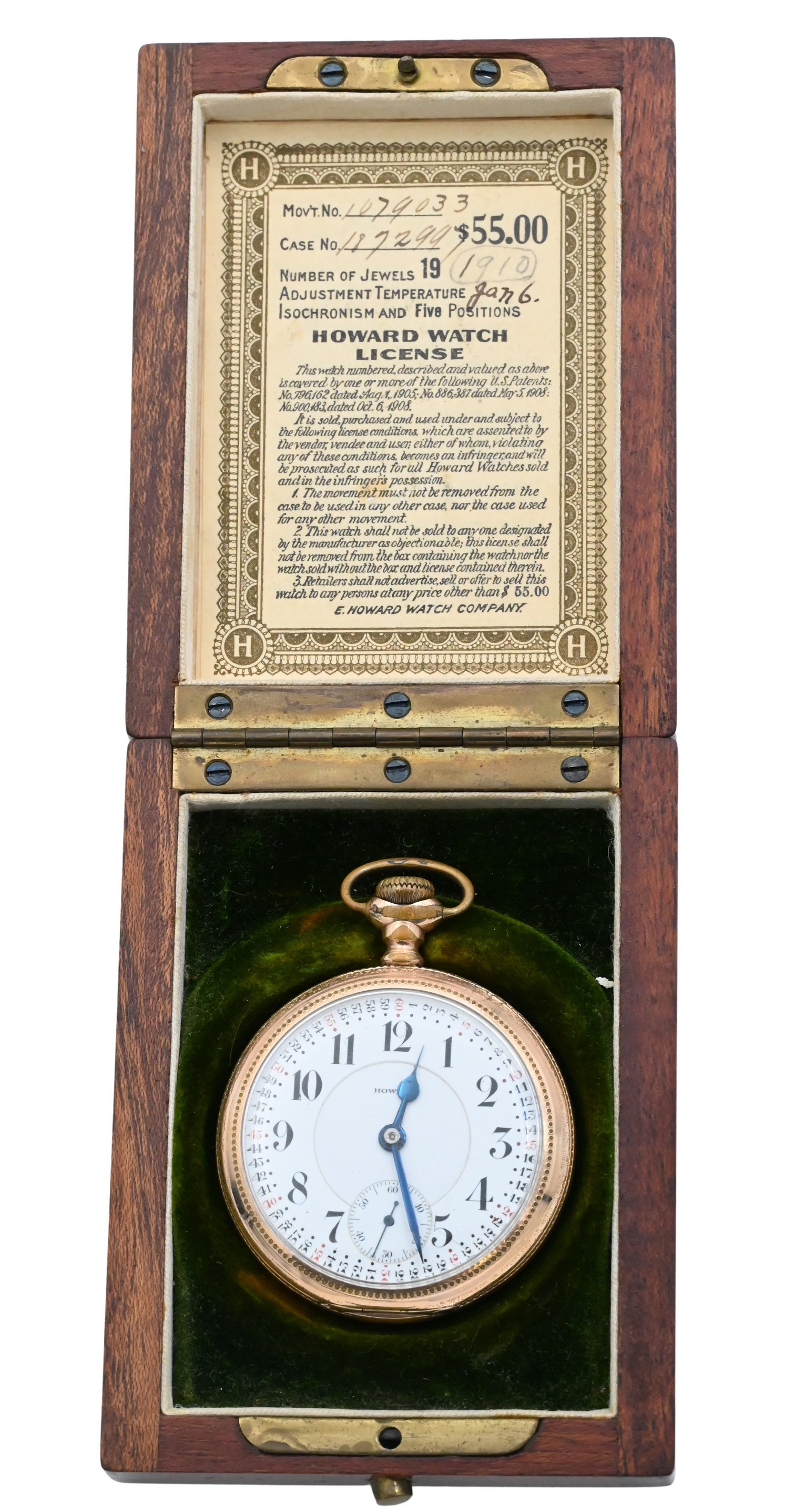 Including an E. Howard Watch Co. 19-jewel open-face pocket watch, serial number 1079033, in fitted wood box with original paper license dated 1910; one W. Pitt English silver pocket watch, hallmarked and labeled “Watch & Clockmaker, Epworth”; one Atlas Watch Co., Chicago open-face pocket watch, movement no. 1789469, case marked B&B Regal 14K 10 Years; and one Kriegs Modelle nickel pocket watch with engraved back and brass movement. Diameter of largest 55 mm.