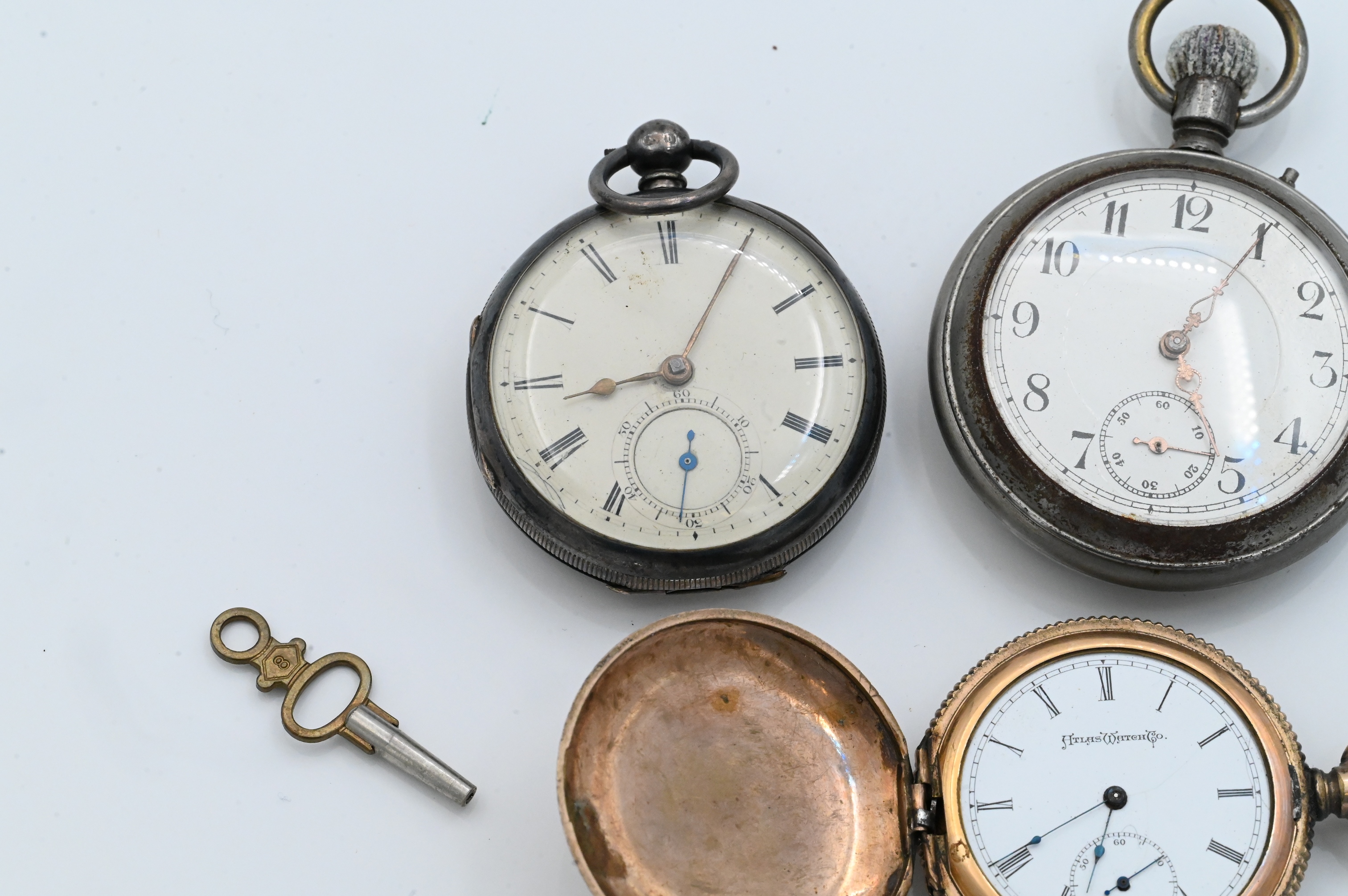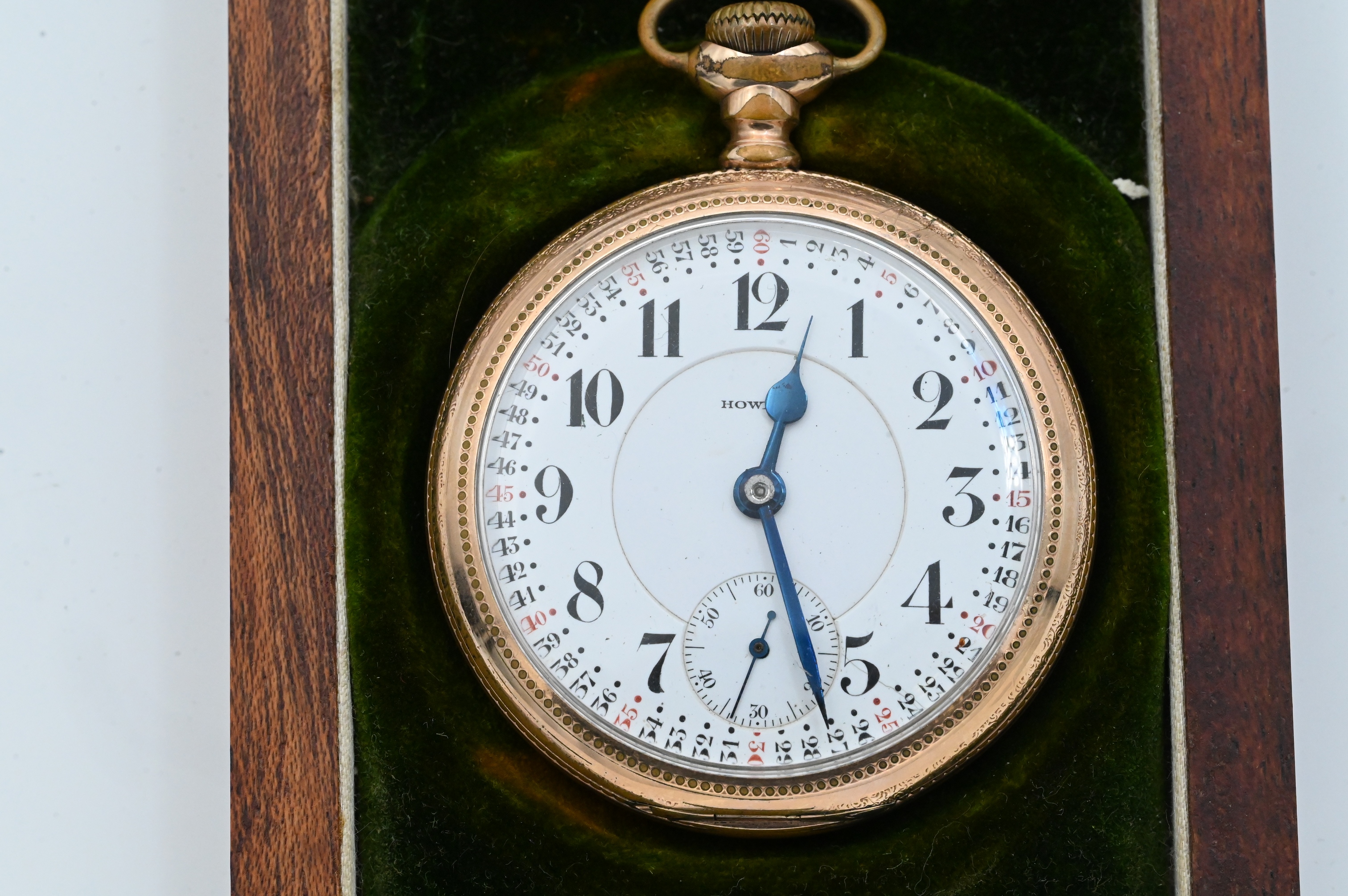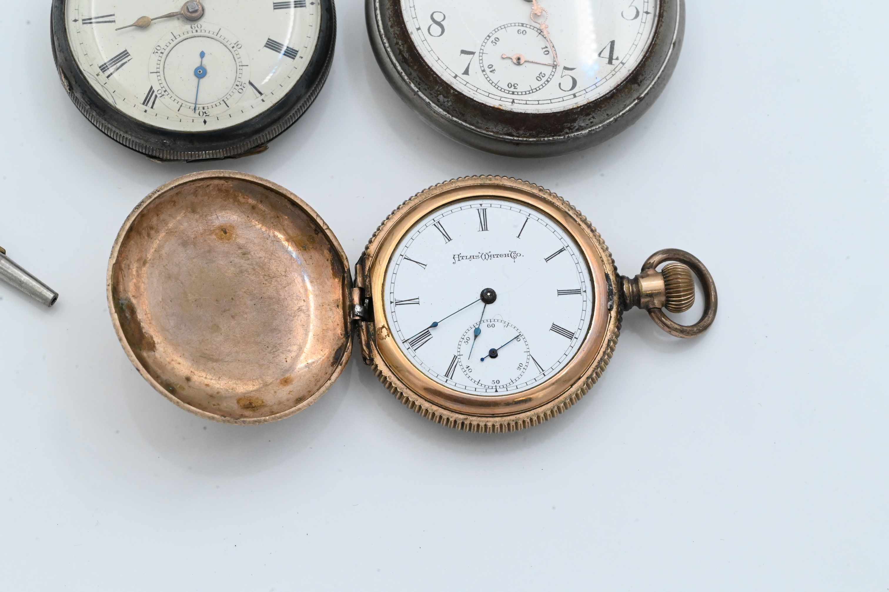 Including an E. Howard Watch Co. 19-jewel open-face pocket watch, serial number 1079033, in fitted wood box with original paper license dated 1910; one W. Pitt English silver pocket watch, hallmarked and labeled “Watch & Clockmaker, Epworth”; one Atlas Watch Co., Chicago open-face pocket watch, movement no. 1789469, case marked B&B Regal 14K 10 Years; and one Kriegs Modelle nickel pocket watch with engraved back and brass movement. Diameter of largest 55 mm.