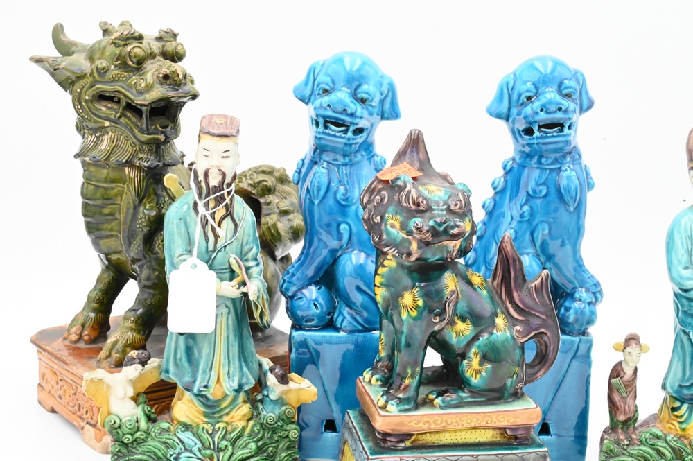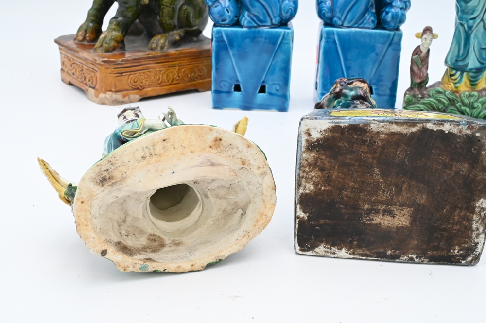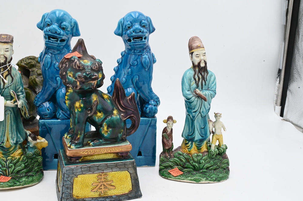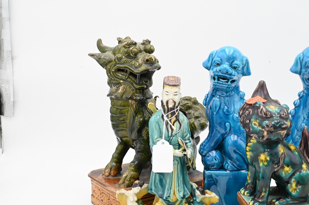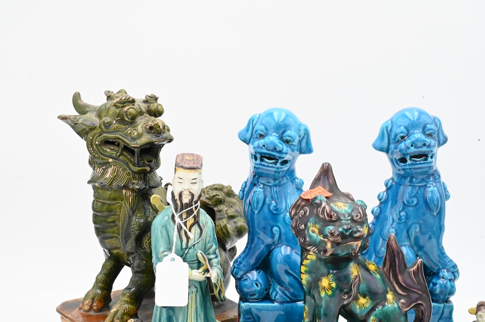 Group of Six Chinese Pieces, to include green and brown glazed terracotta foo dog, pair of blue glazed foo dogs, pair of glazed porcelain figures, along with another foo dog; tallest height 11 inches.
