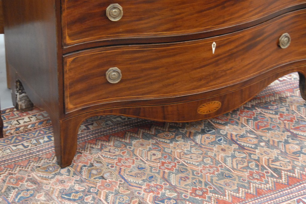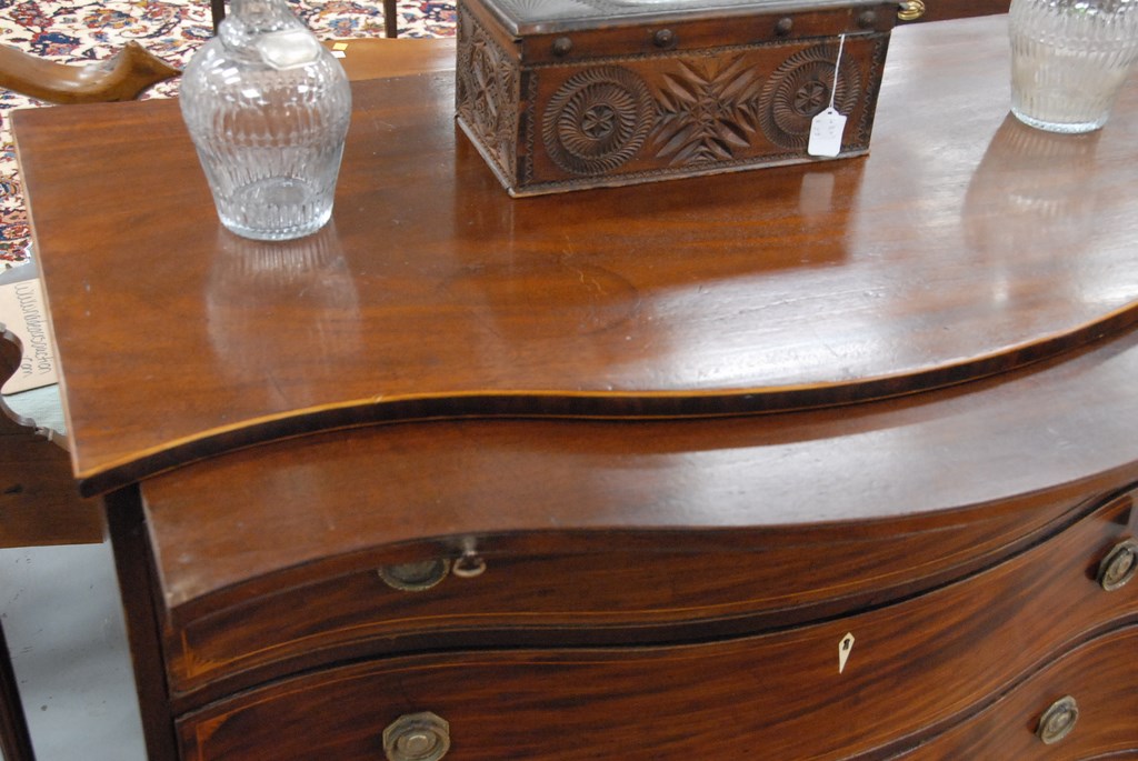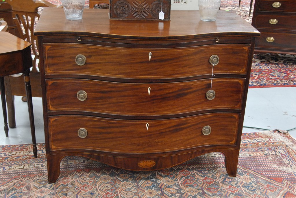 Mahogany chest of three drawers having serpentine top over conforming case with pull out slide over three drawers set on small bracket feet, drawers with fan and line inlays, skirt with oval panel inlay. ht. 36in. wd. 44in.