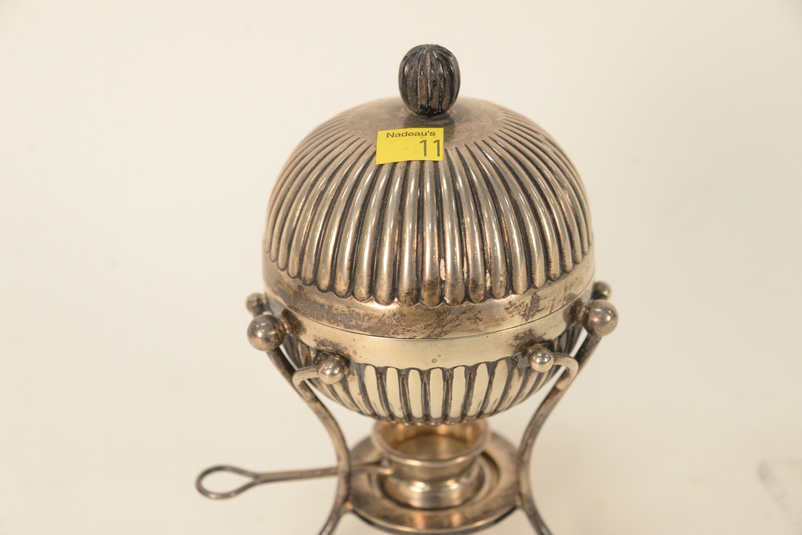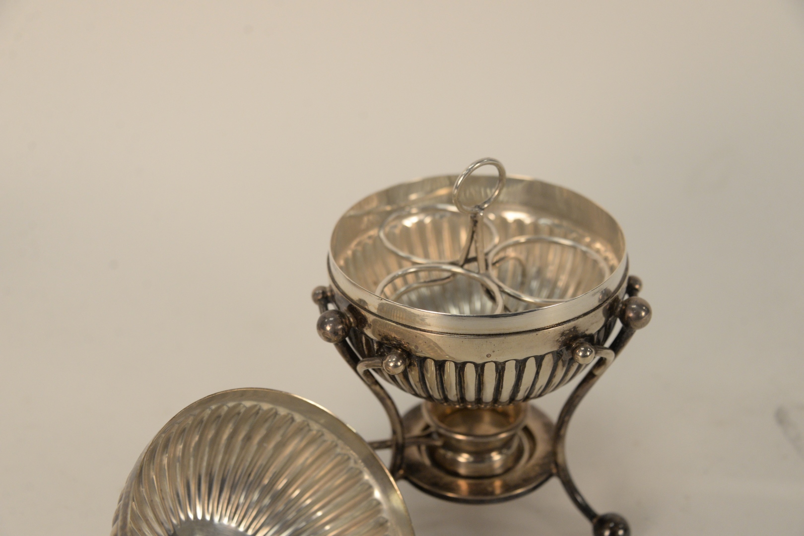 Lot 172: Mappin & Webb Silver Egg Server, complete with three- section egg holder inside, height 7 inches, 17.4 t.oz.