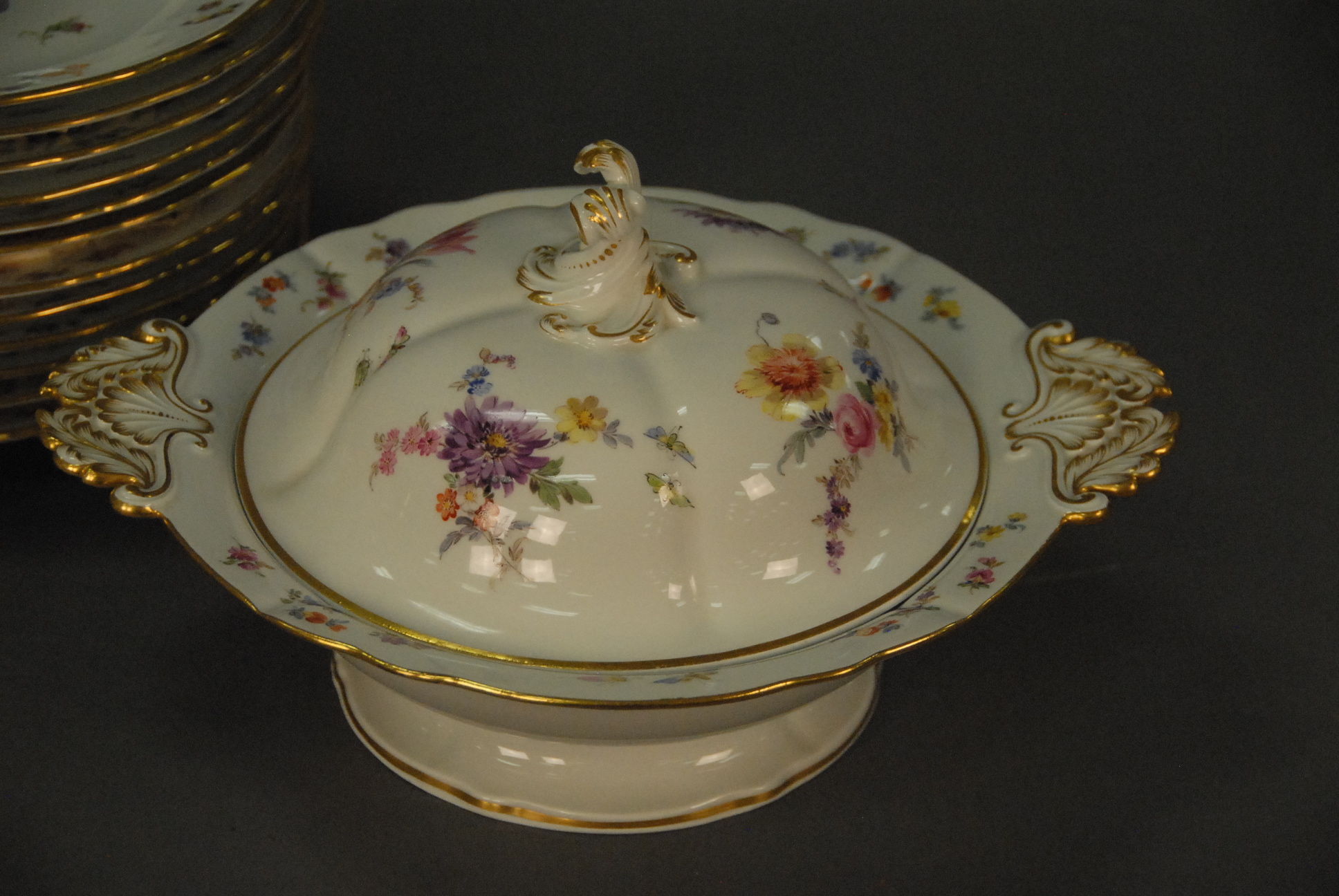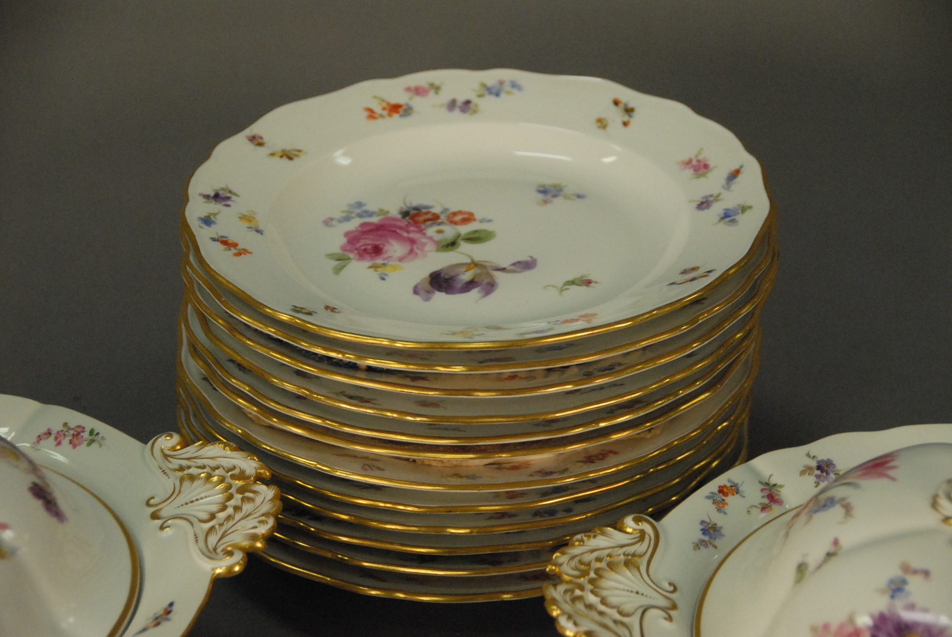 Lot 172: Meissen fourteen piece lot including two covered vegetable dishes with handles and twelve deep plates, all with various hand painted flowers, marked with crossed swords small chips on base of one covered dish. deep plate: dia. 9 3/4in.