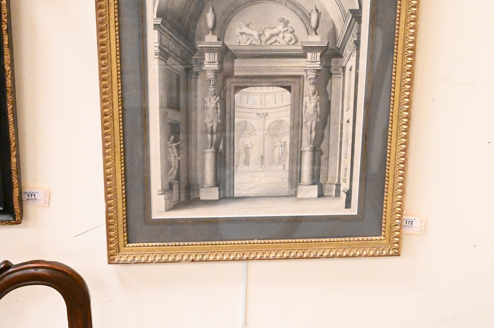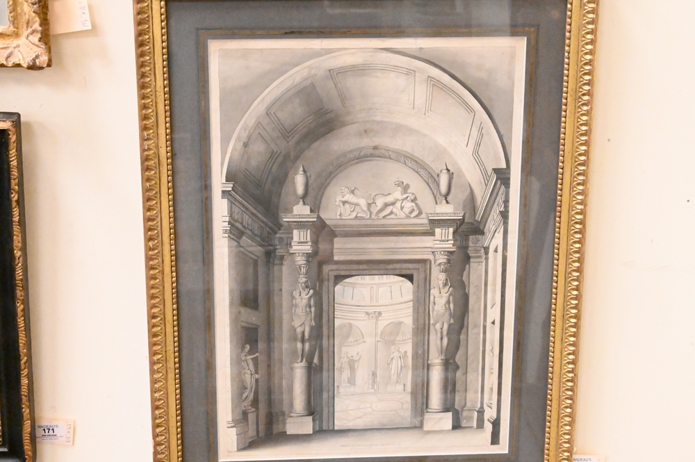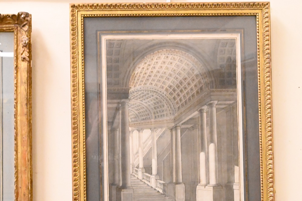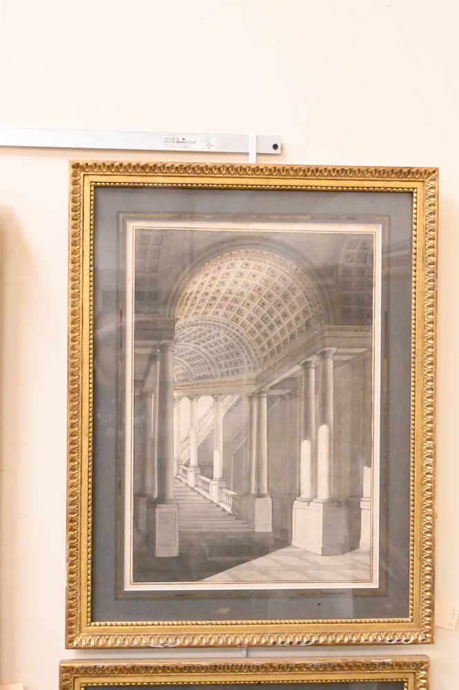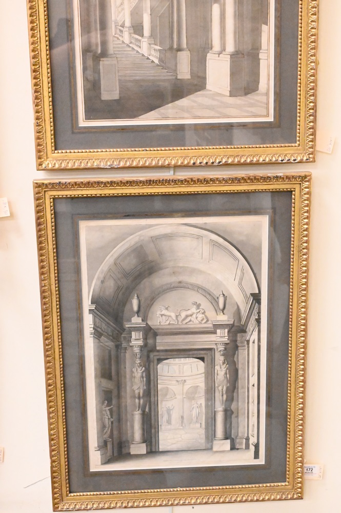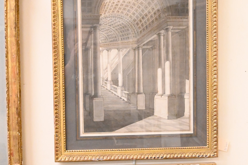 Lot 172: Pair of Italian School Pen and Ink, 18th century, staircase to entrance of Museo Pio Clementino, Vatican; along with a view through a monumental doorway into sculpture gallery, pen and grey ink with grey wash; each 19 1/8″ x 13 1/8″. Provenance: Ex coll: David T. Hersey, Boston. Purchased at Marika’s Antiques, Boston, December 2, 1975, no receipt available.Estate of Wallace Bradway, New Haven, CT.