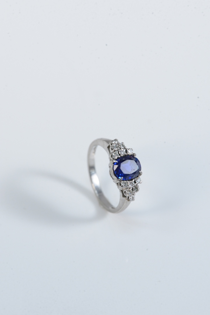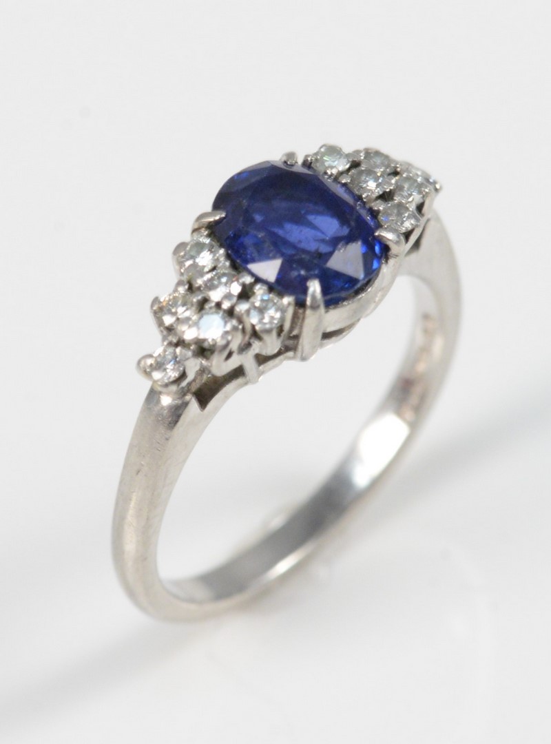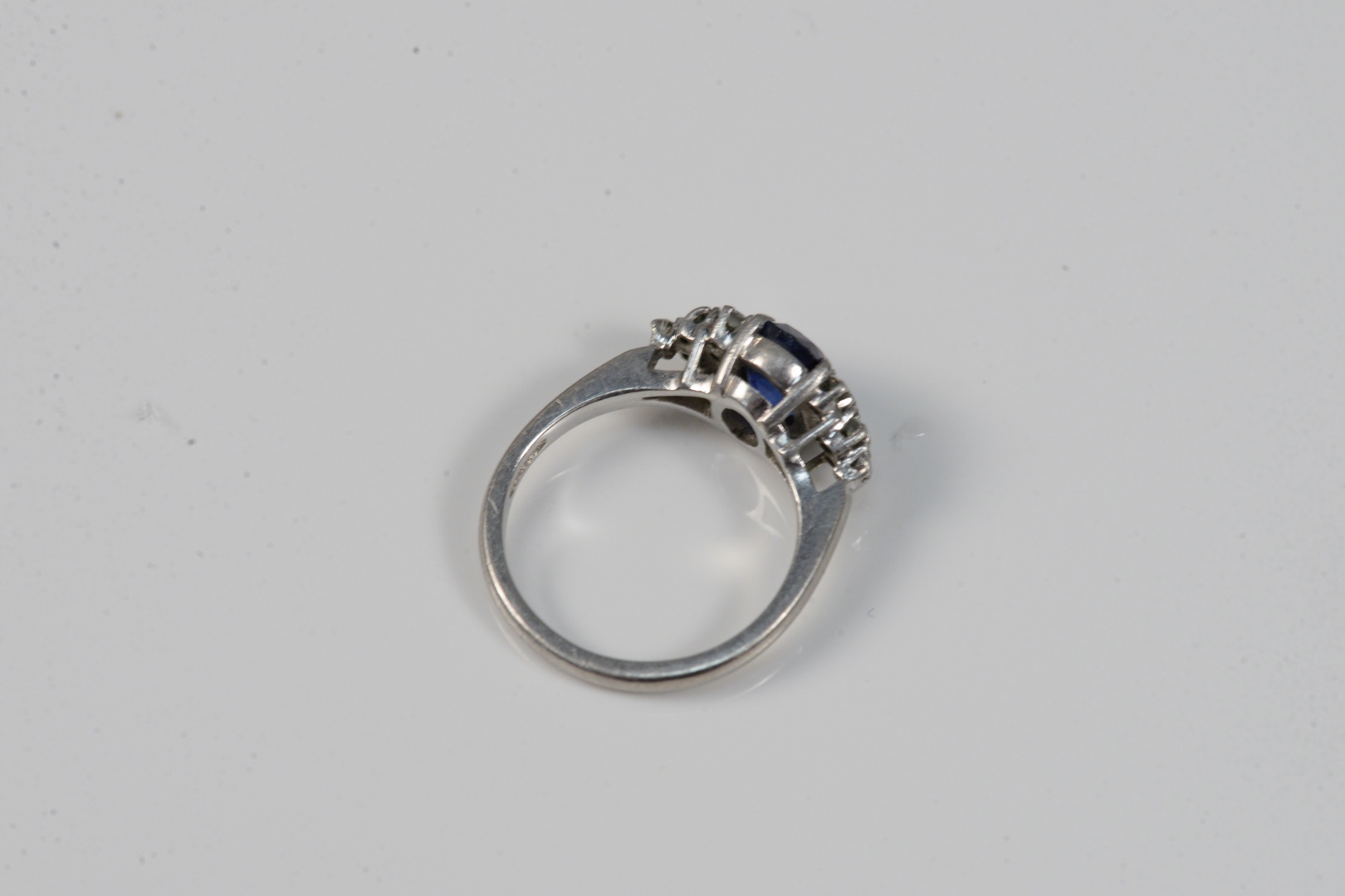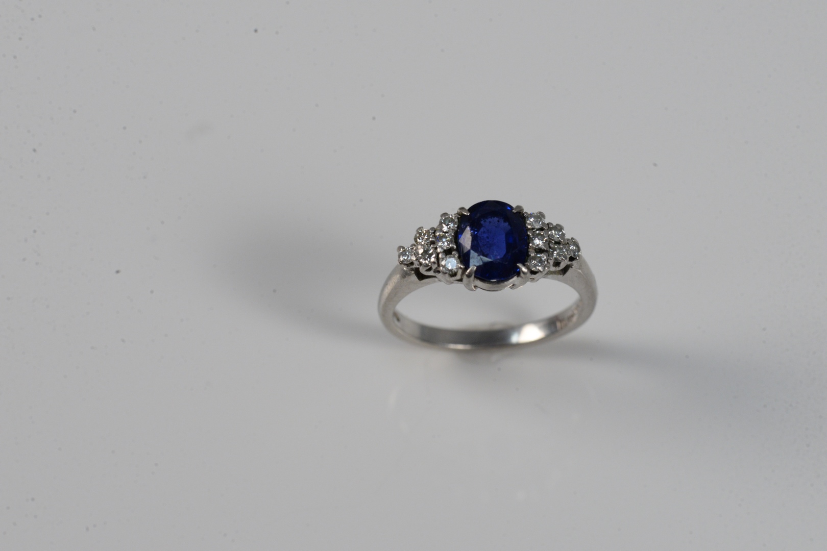 Lot 172: Platinum Ring set with center oval blue stone, flanked by six diamonds on either side size 6