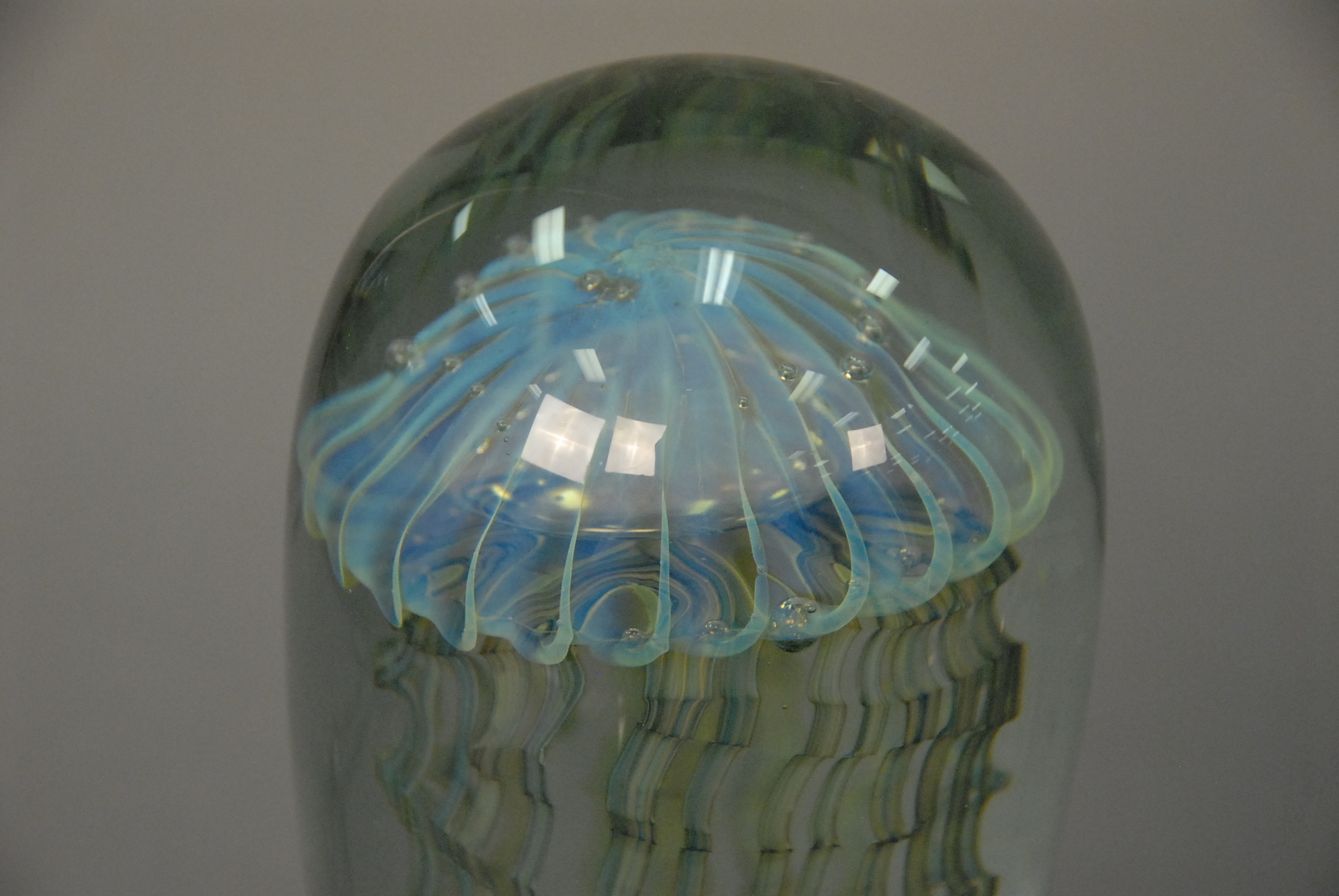 Lot 172: Robert Eickholt art glass jelly fish, opal with bubbles paperweight with light base, ht. 9in.
