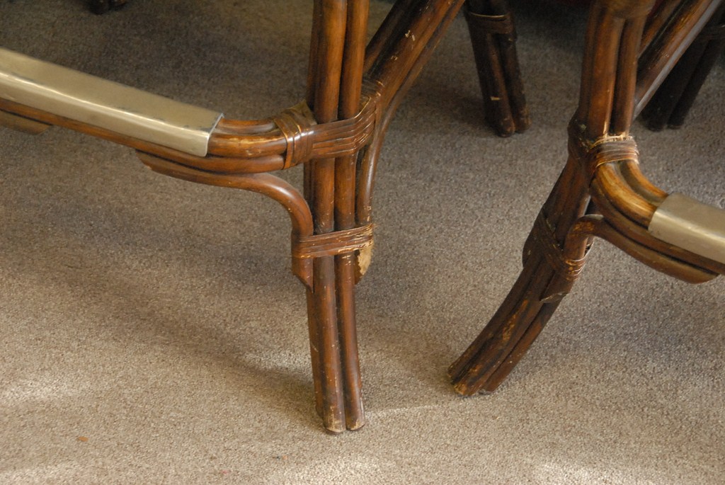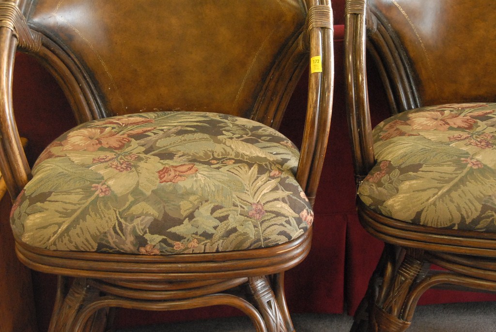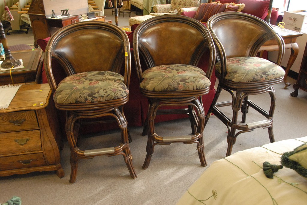 Set of three swivel bar stools, rattan with leather upholstered seats and leather backs.