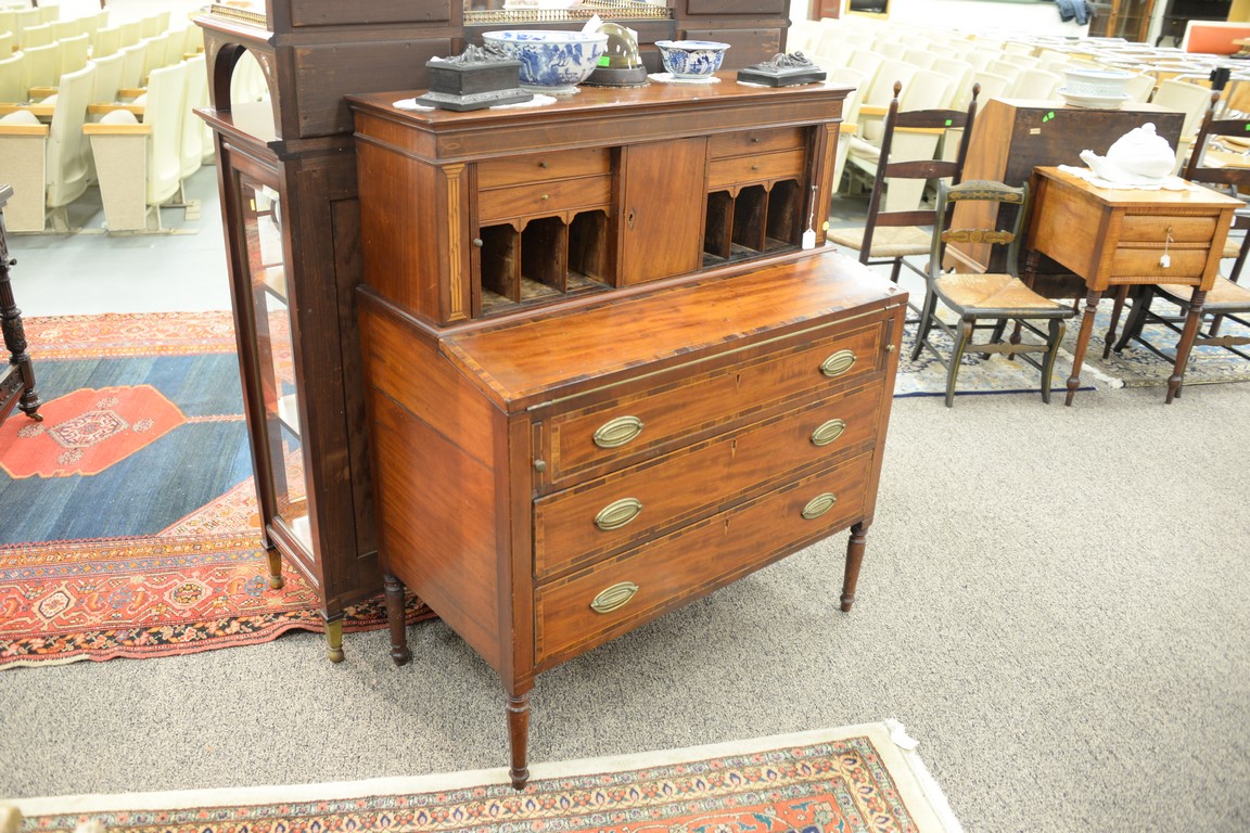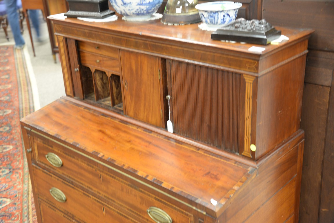Lot 172: Sheraton mahogany tambour desk in two parts set on turned legs, circa 1830. height 47 1/2 inches, width 39 inches, depth 20 inches
