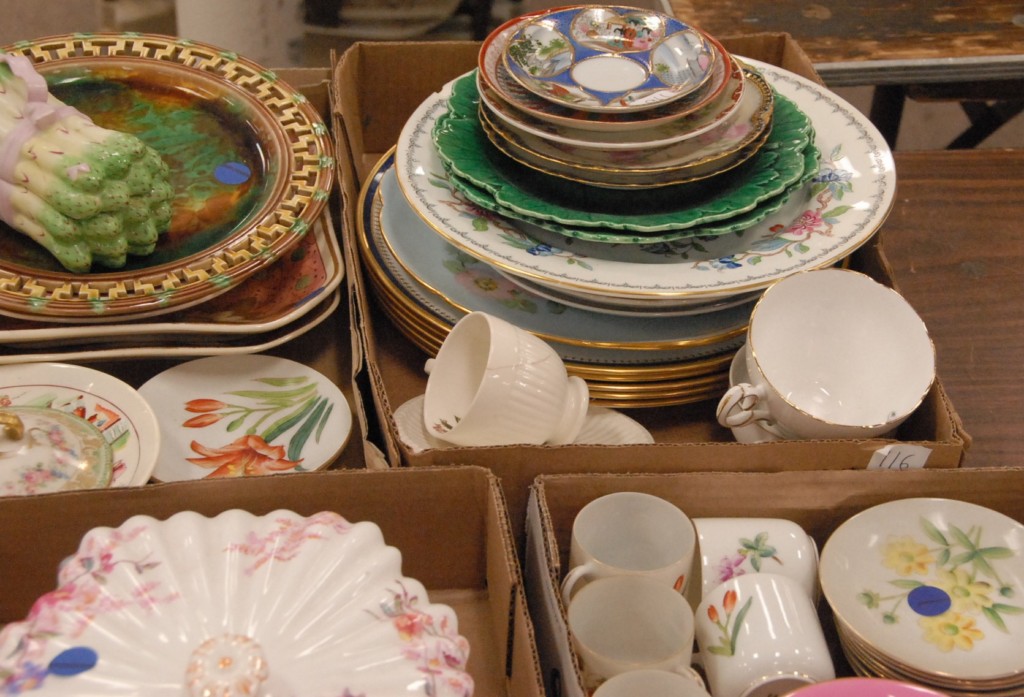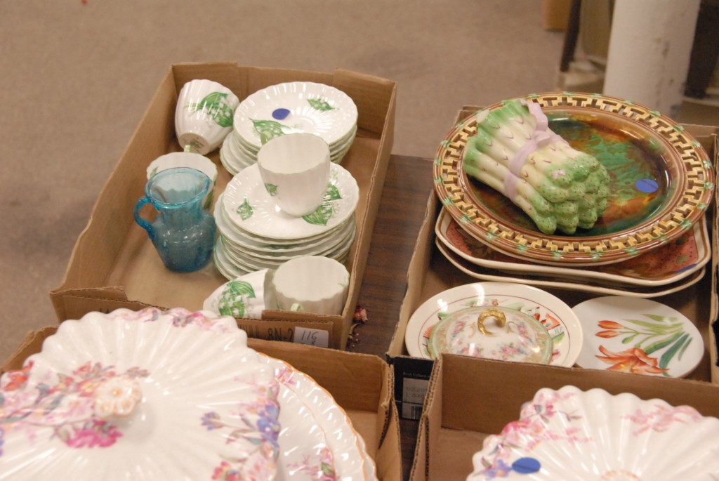 Six box lots Spode covered dishes, platters, hand painted china, Majolica, Shelley cups and saucers.