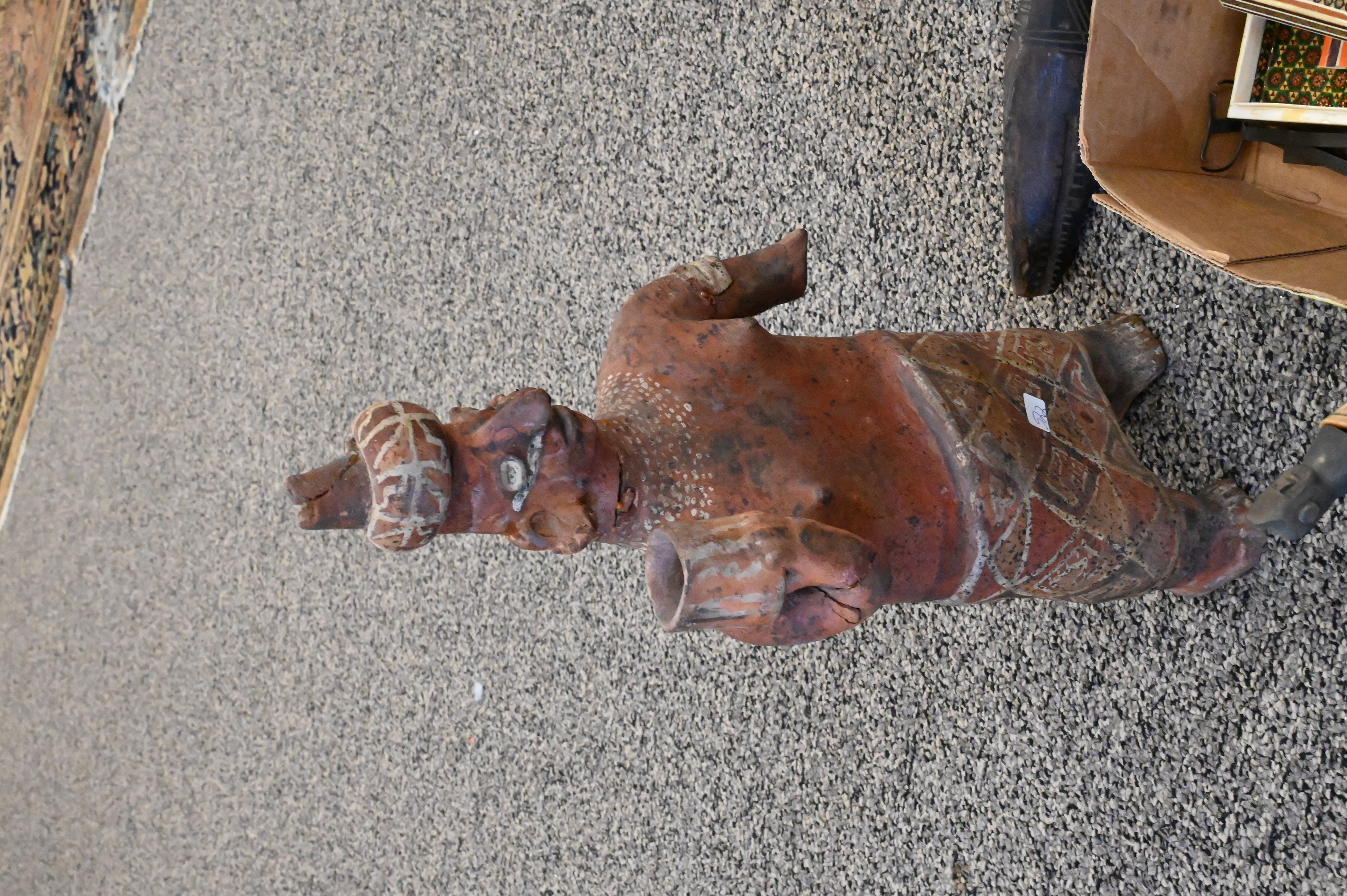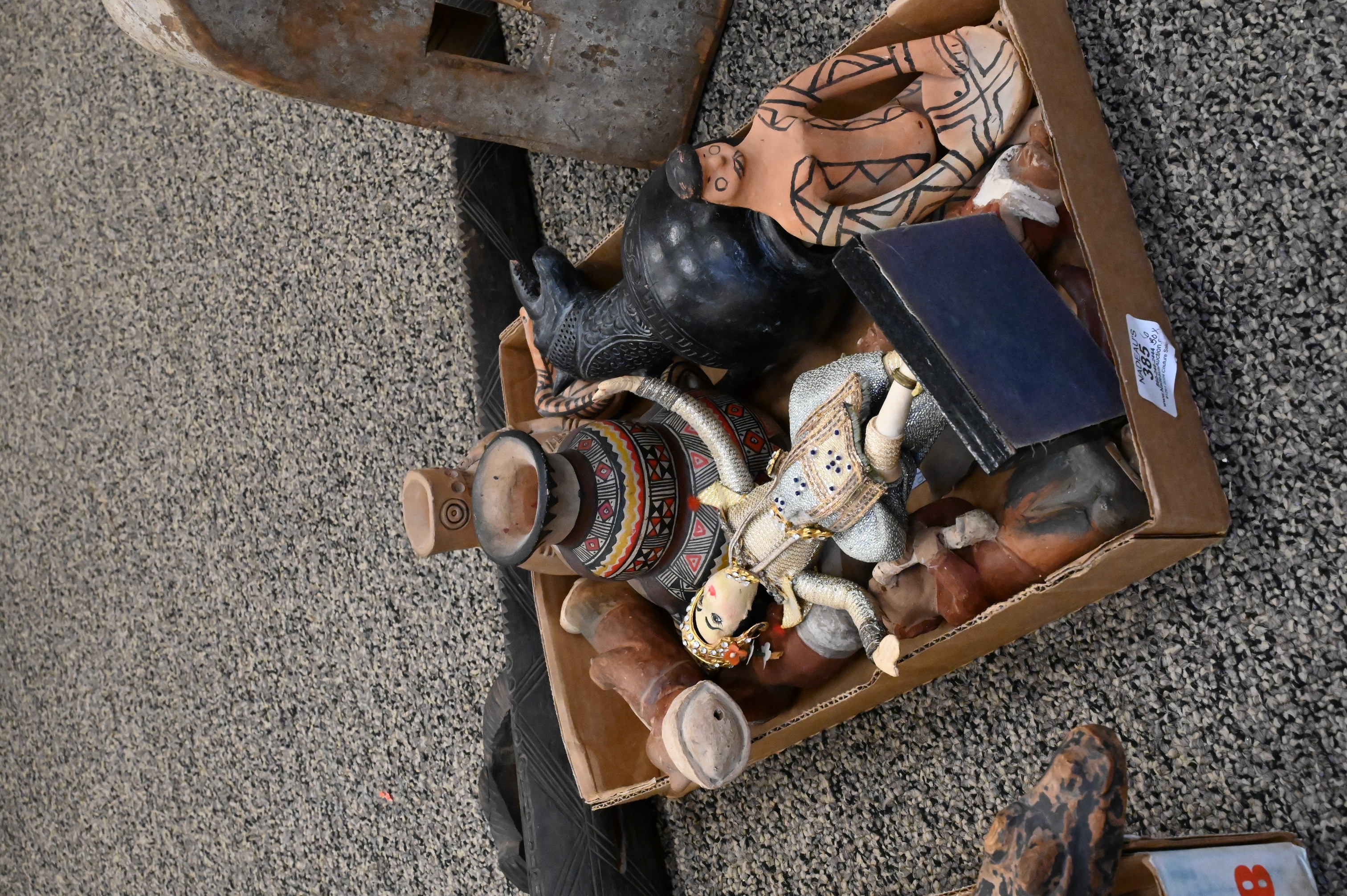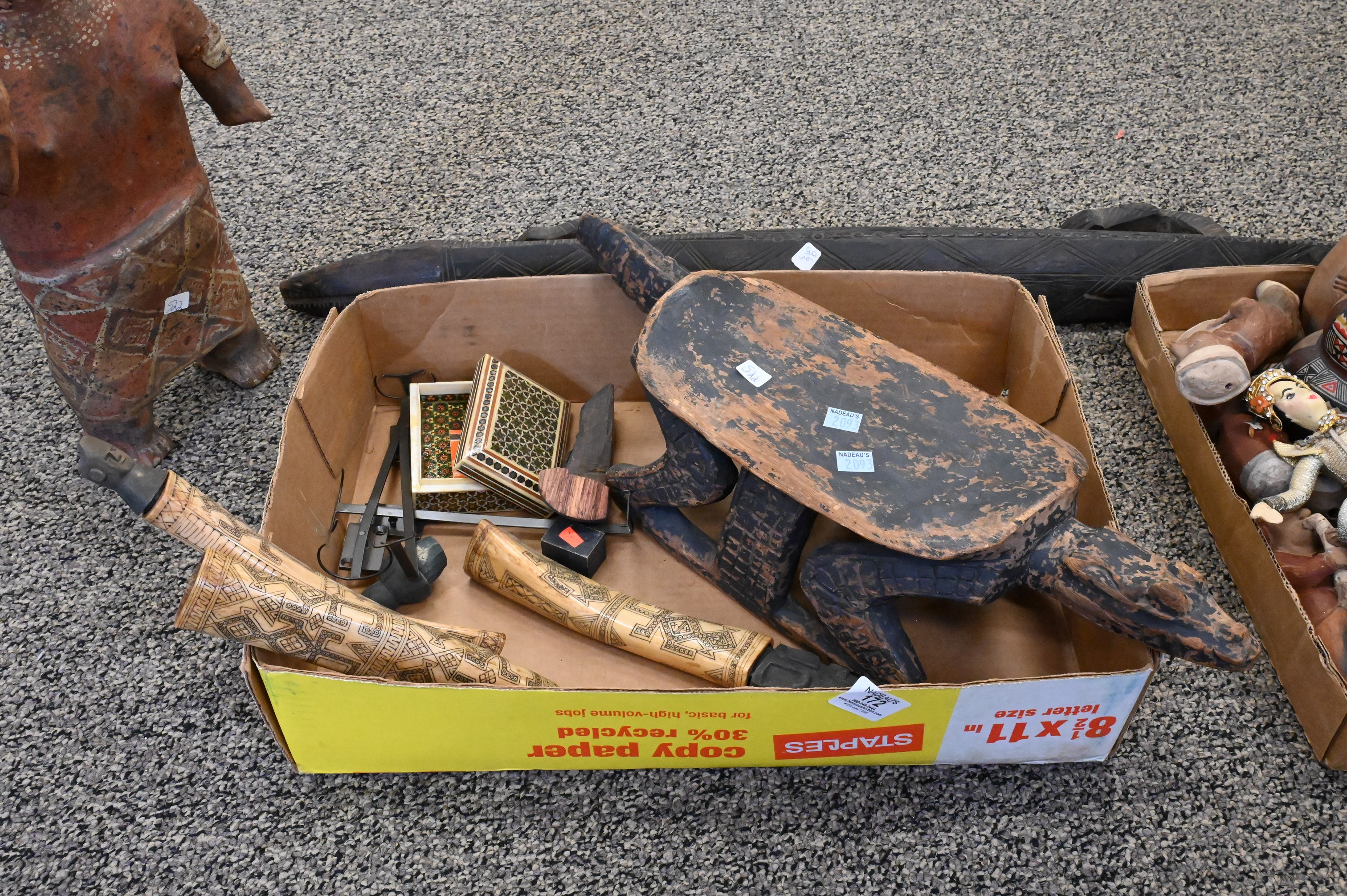Dogon African mask, purchased for $3000 from Vault, carved wood turtle head rest or stool, large Pre-Columbian Nayarit terracotta figure from Mexico, carved bone powder horns or containers, figural whistles, carved zoomorphic stirrup vase etc…