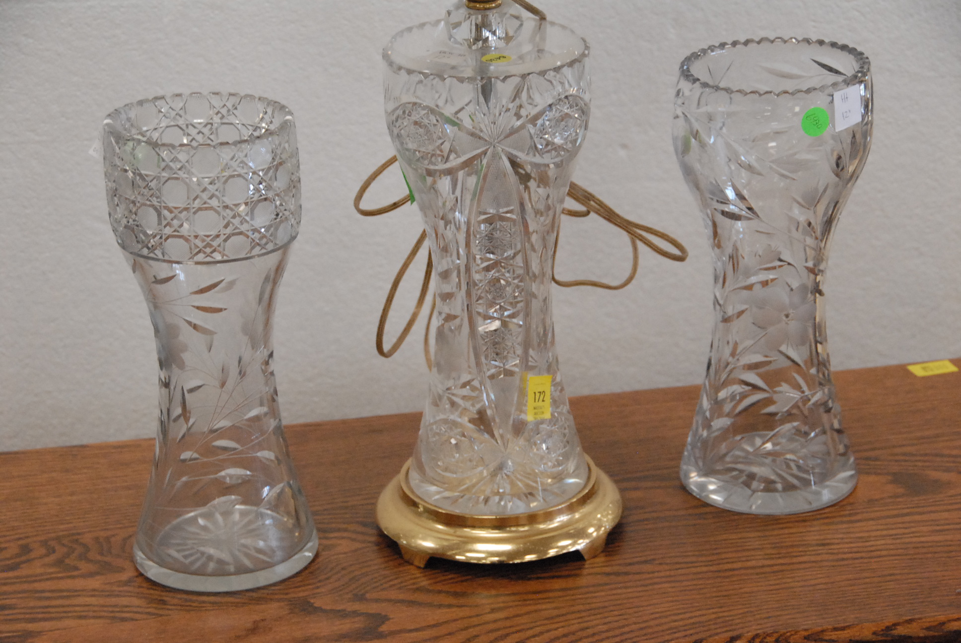 Three cut-glass vases, one made into table lamp.