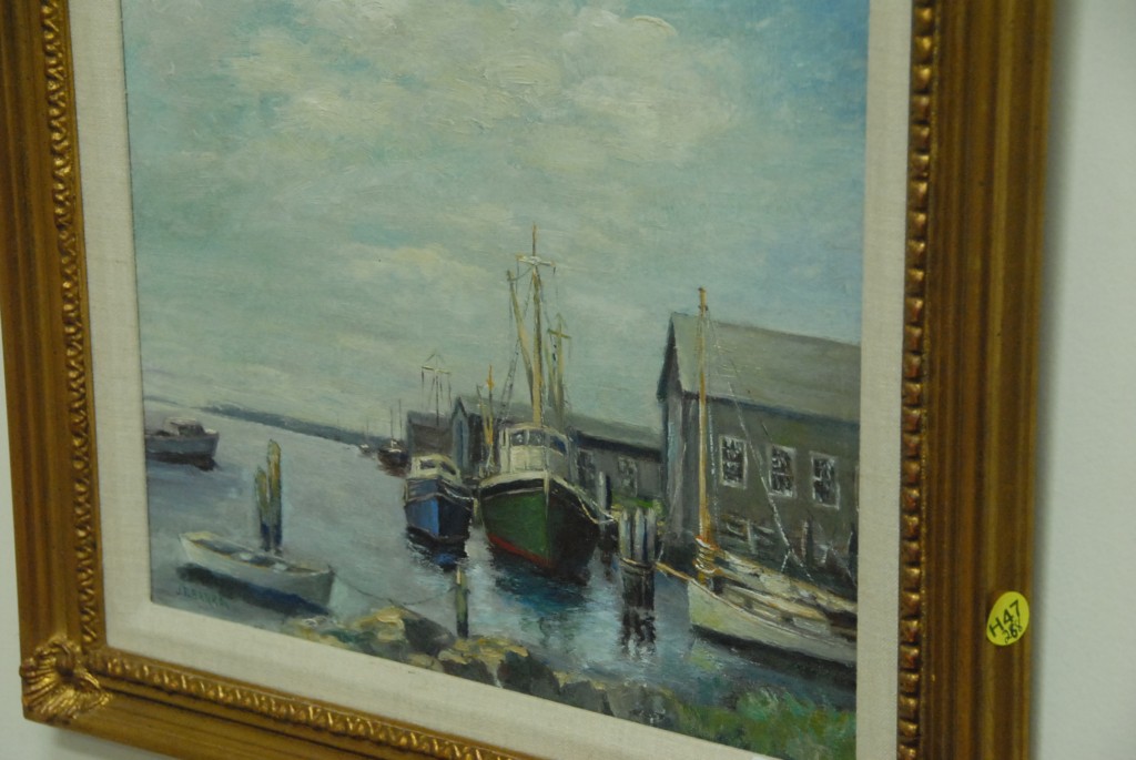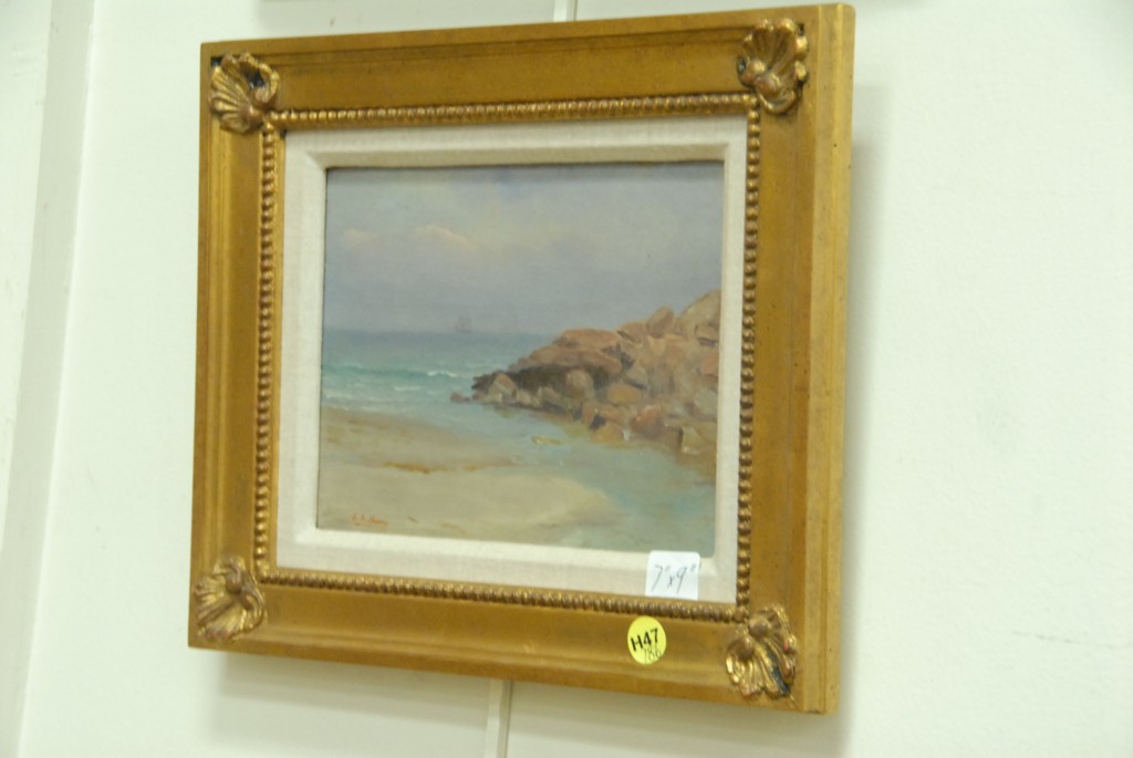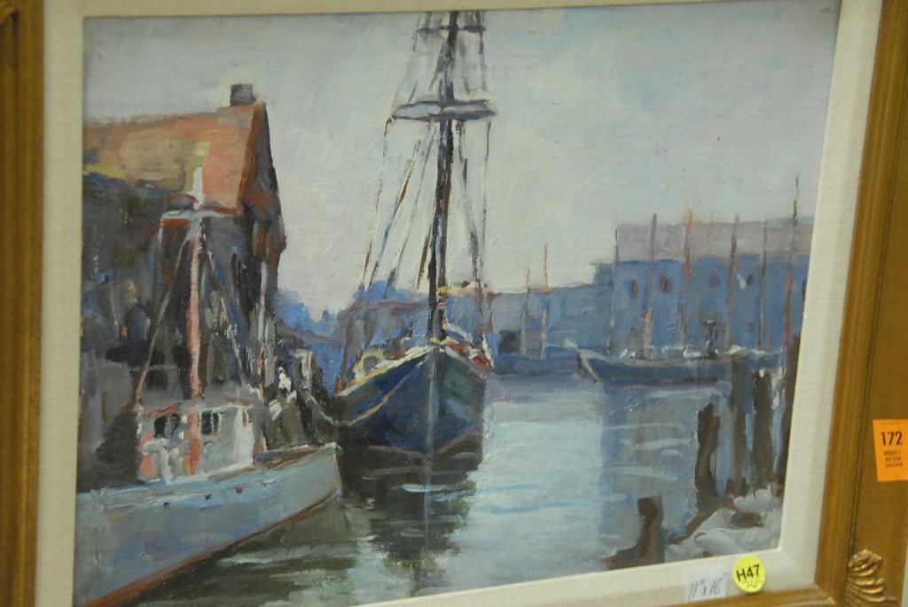 Three paintings oil on board Ship at Dock signed lower left J. T. Barks 12 x 14, unsigned oil on board of ship at dock 11 x 16, and J. A. Numes ocean edge 7 x 9