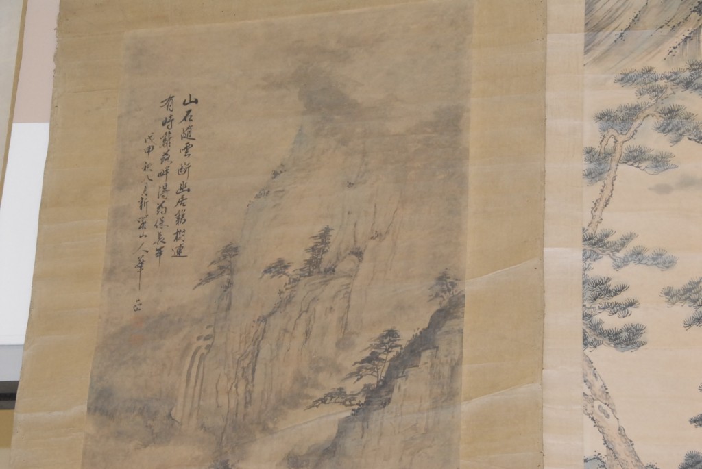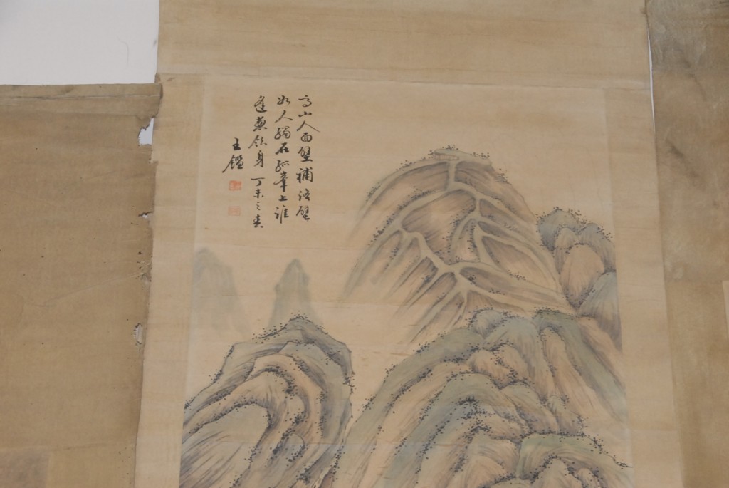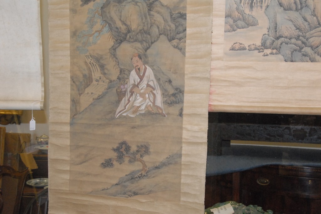 Lot 172: Two Oriental scrolls watercolors on paper seated man with landscape background 67 x 17, mountainous landscape with two figures on…