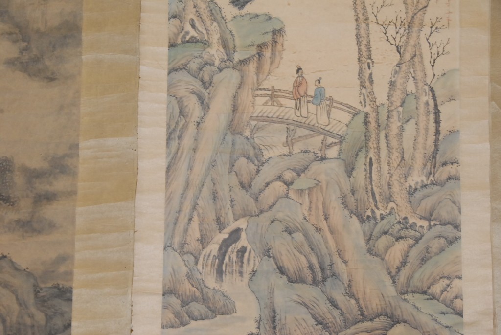 Two Oriental scrolls watercolors on paper seated man with landscape background 67 x 17, mountainous landscape with two figures on bridge 68 x 19.