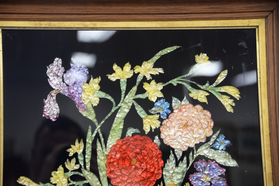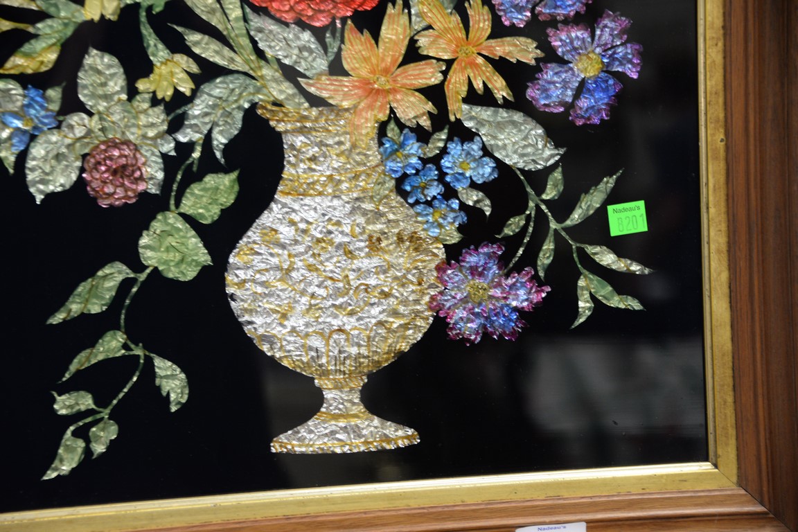 Victorian framed tinsel picture depicting a vase with flowers, 20 x 16.