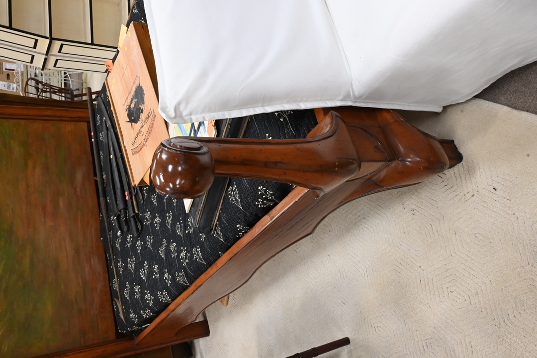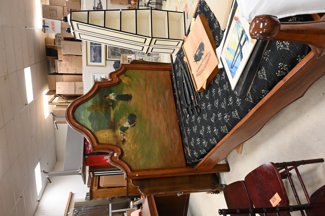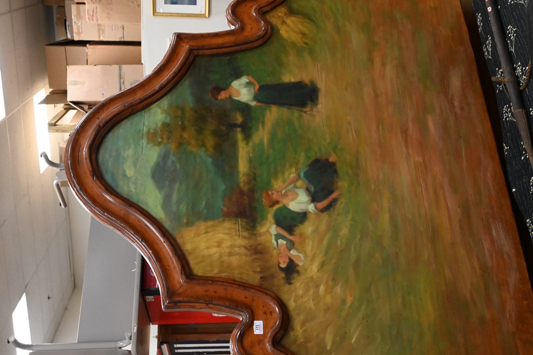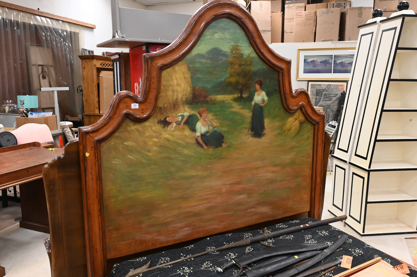 Woodland Furniture Queen Size Bed, having painted headboard depicting three women in a field, height 81 inches, width 68 inches.