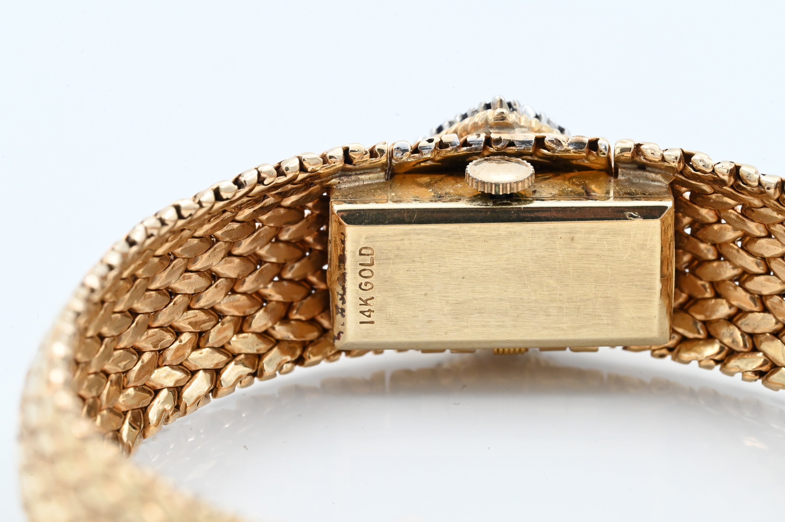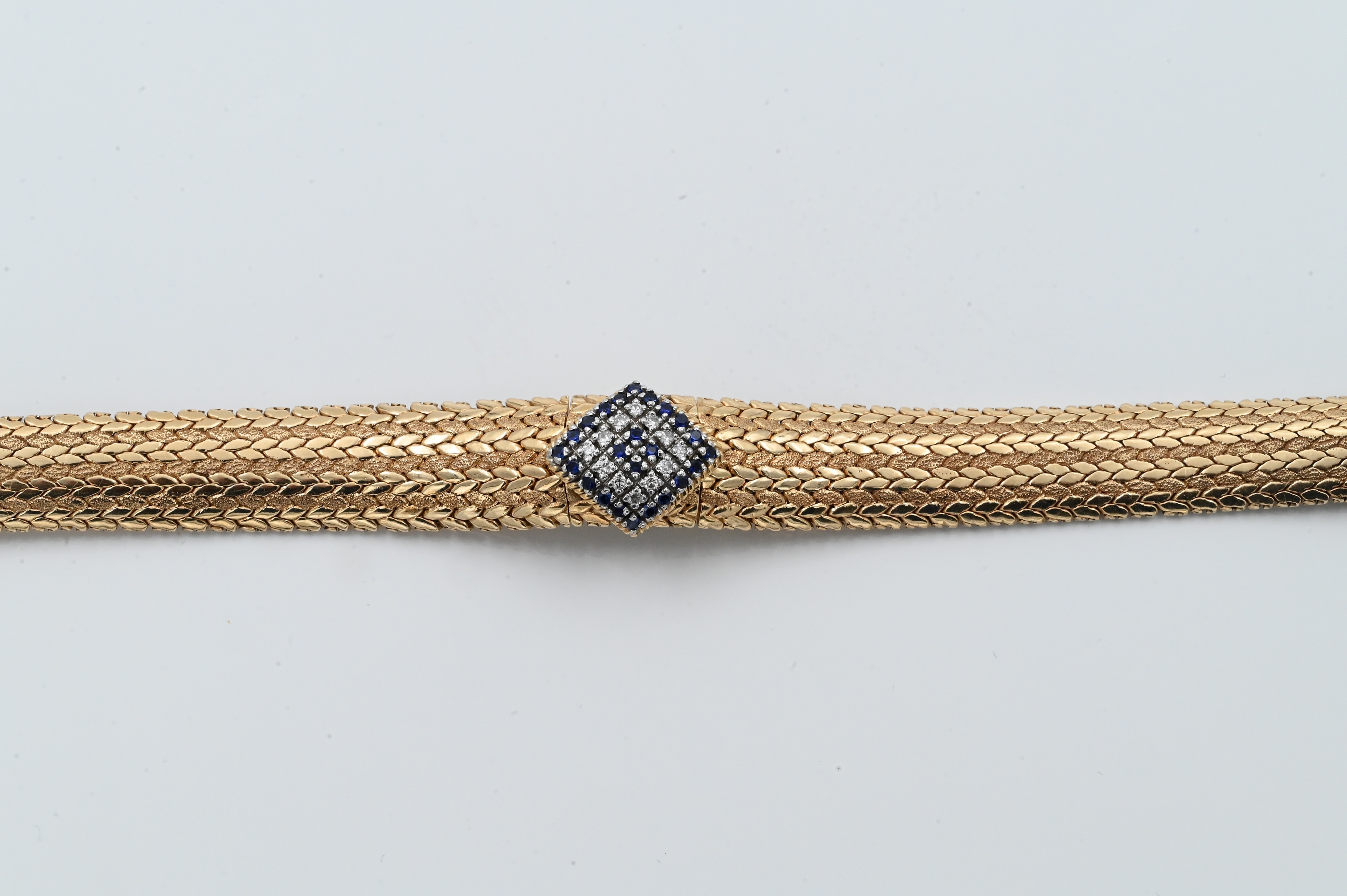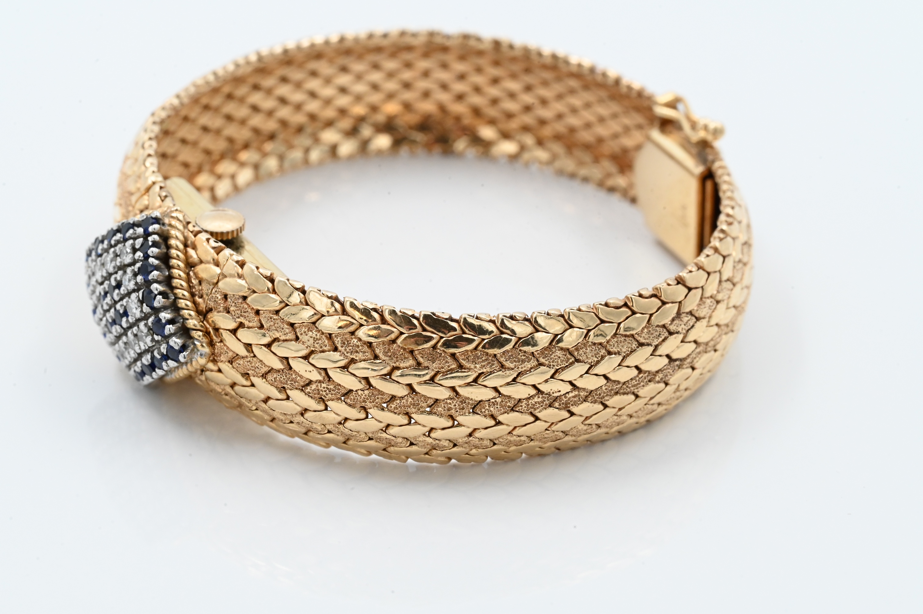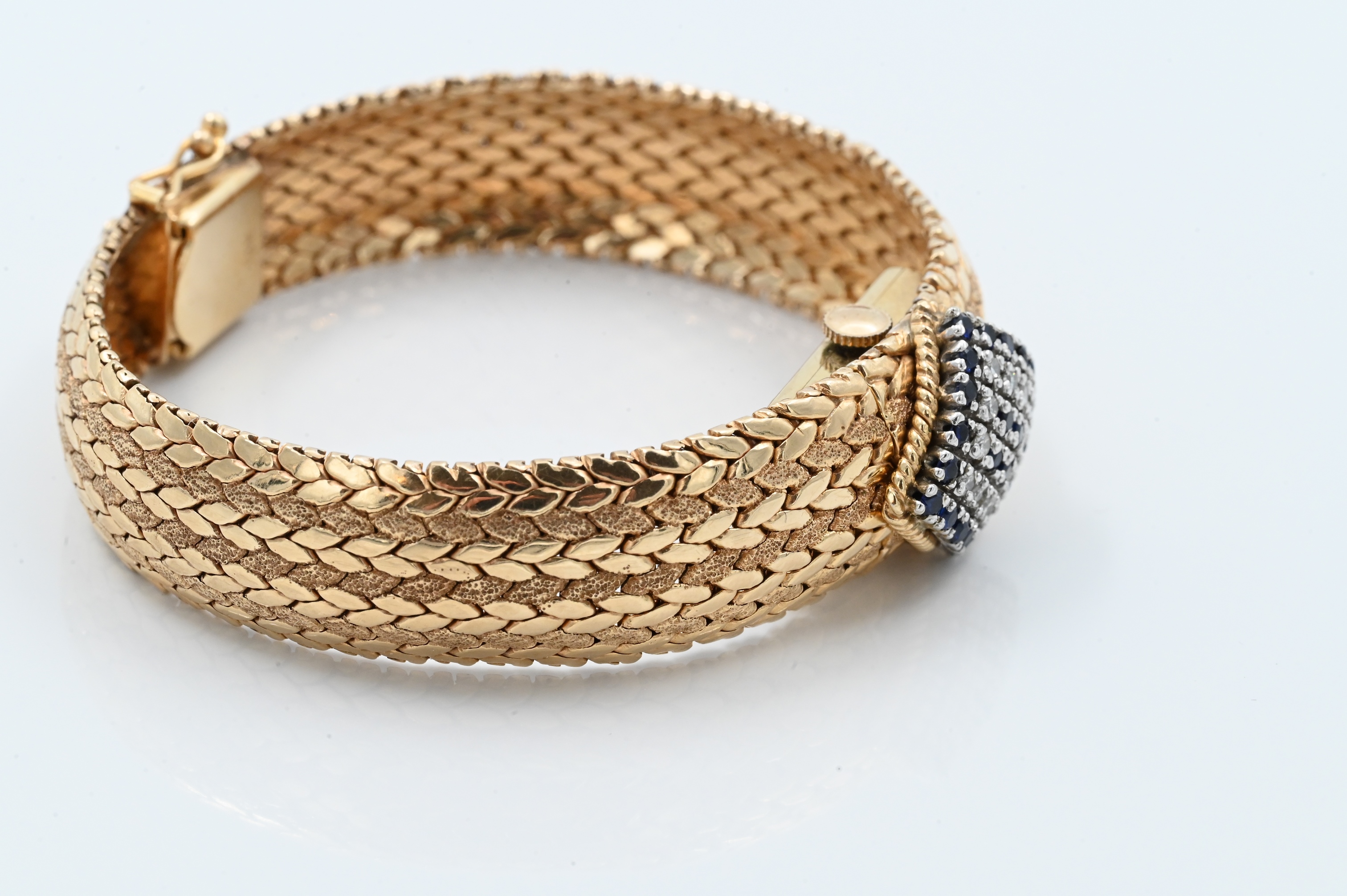 having diamond and sapphire sloped cover with woven band marked 14K gold, dial marked Apex 17 jewel