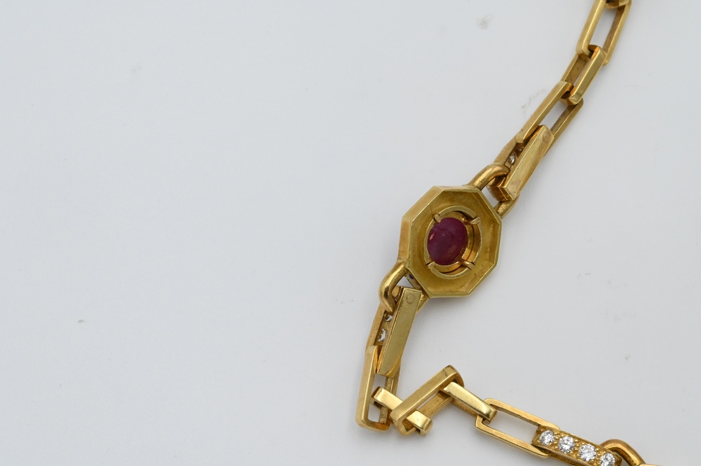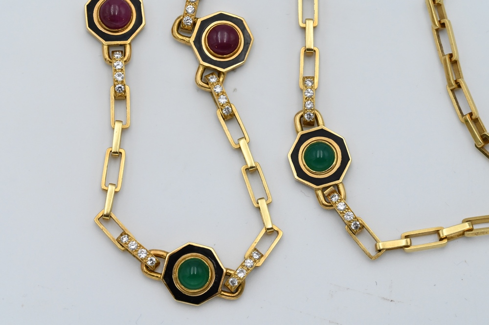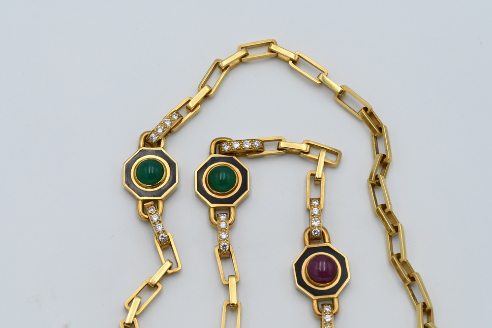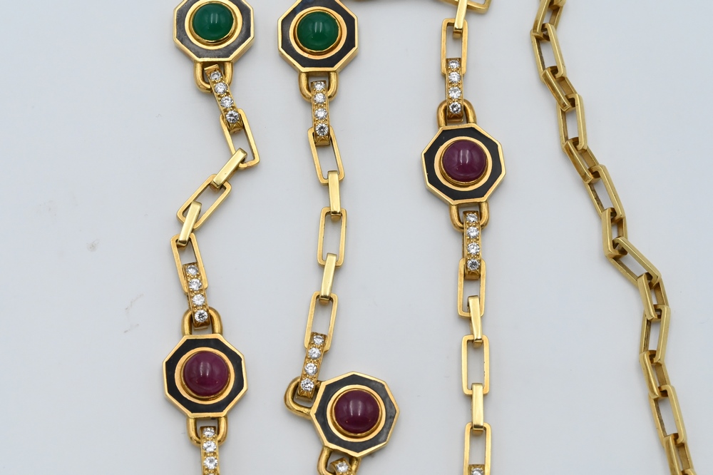 Lot 173: 18 Karat Yellow Gold Necklace, mounted with seven medallions, mounted with pink sapphires, green stones, and diamonds on nearest lin…