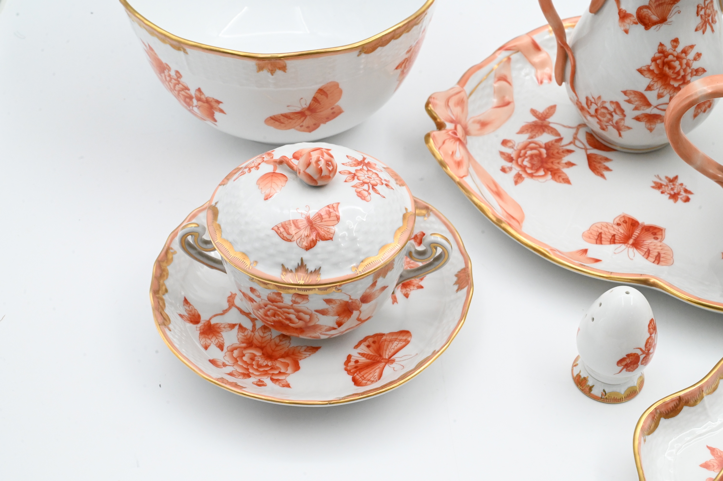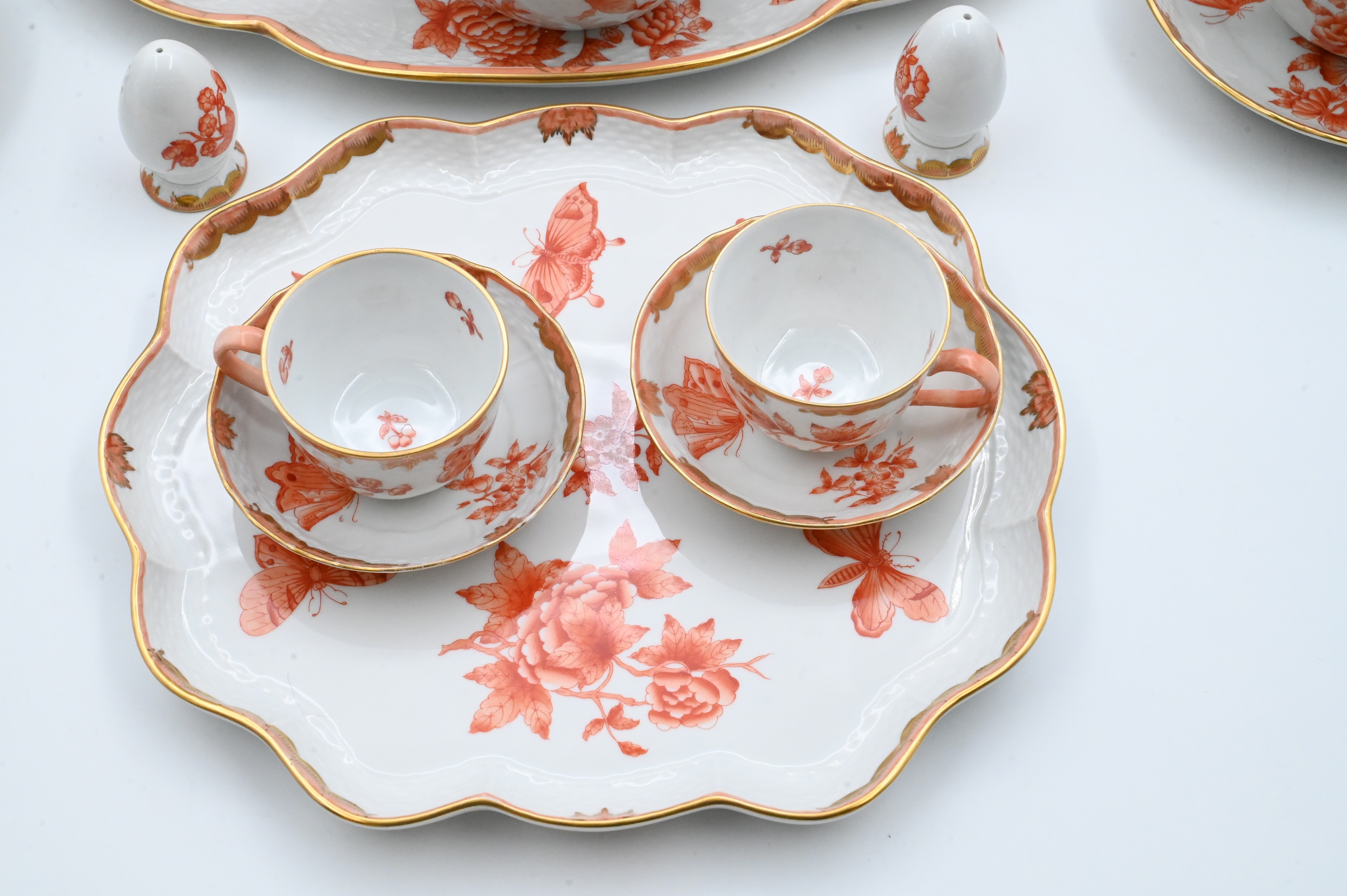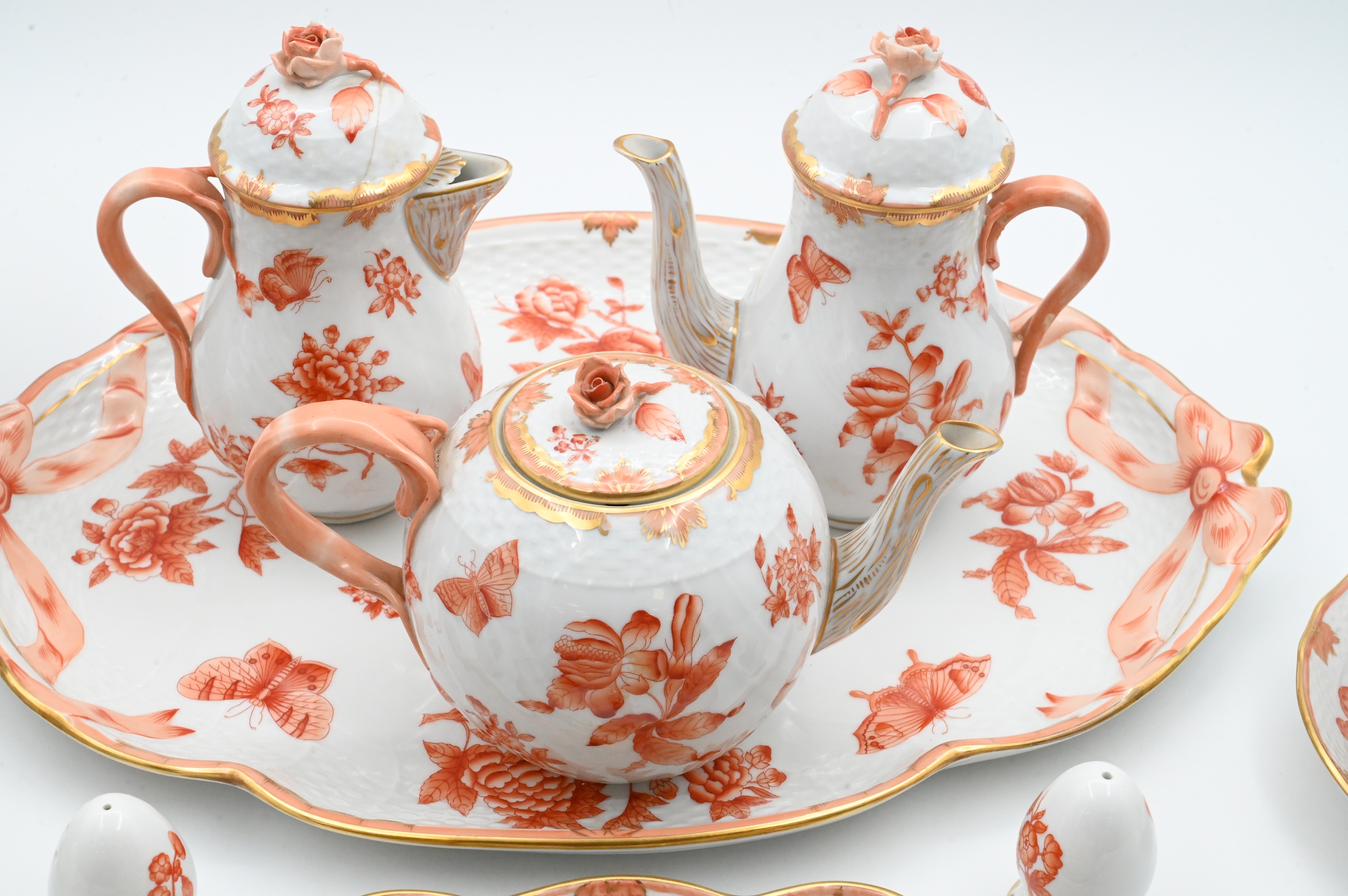 or Apponyi Orange pattern, each piece hand-painted with rust floral sprays and gilt foliate borders, many with applied rose finials, to include 10 cups, 10 saucers, teapot, coffee pot, chocolate pot, covered sugar, and creamer; 7 bread and butters, covered dish, 15 covered pot-de-crème cups, 26 underplates and 16 egg shaped salt and pepper shakers along with 4 additional serving pieces