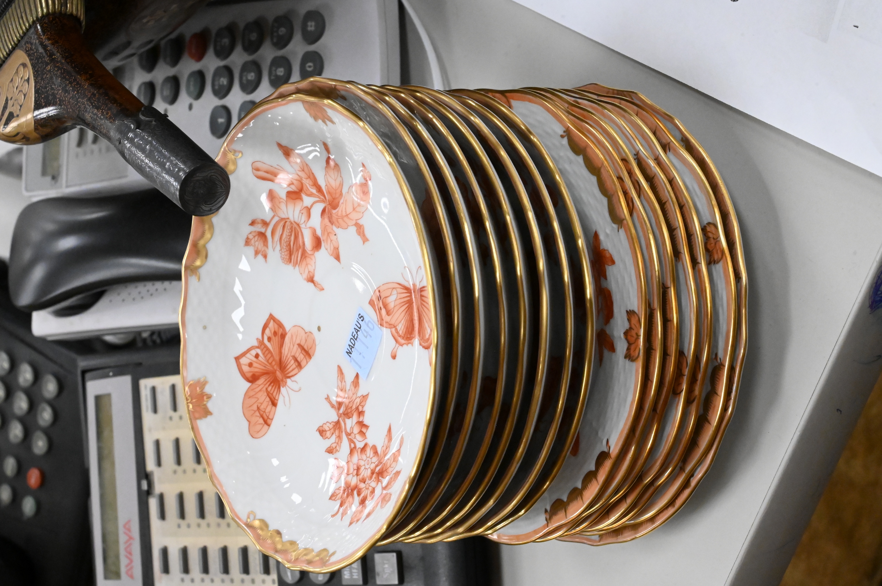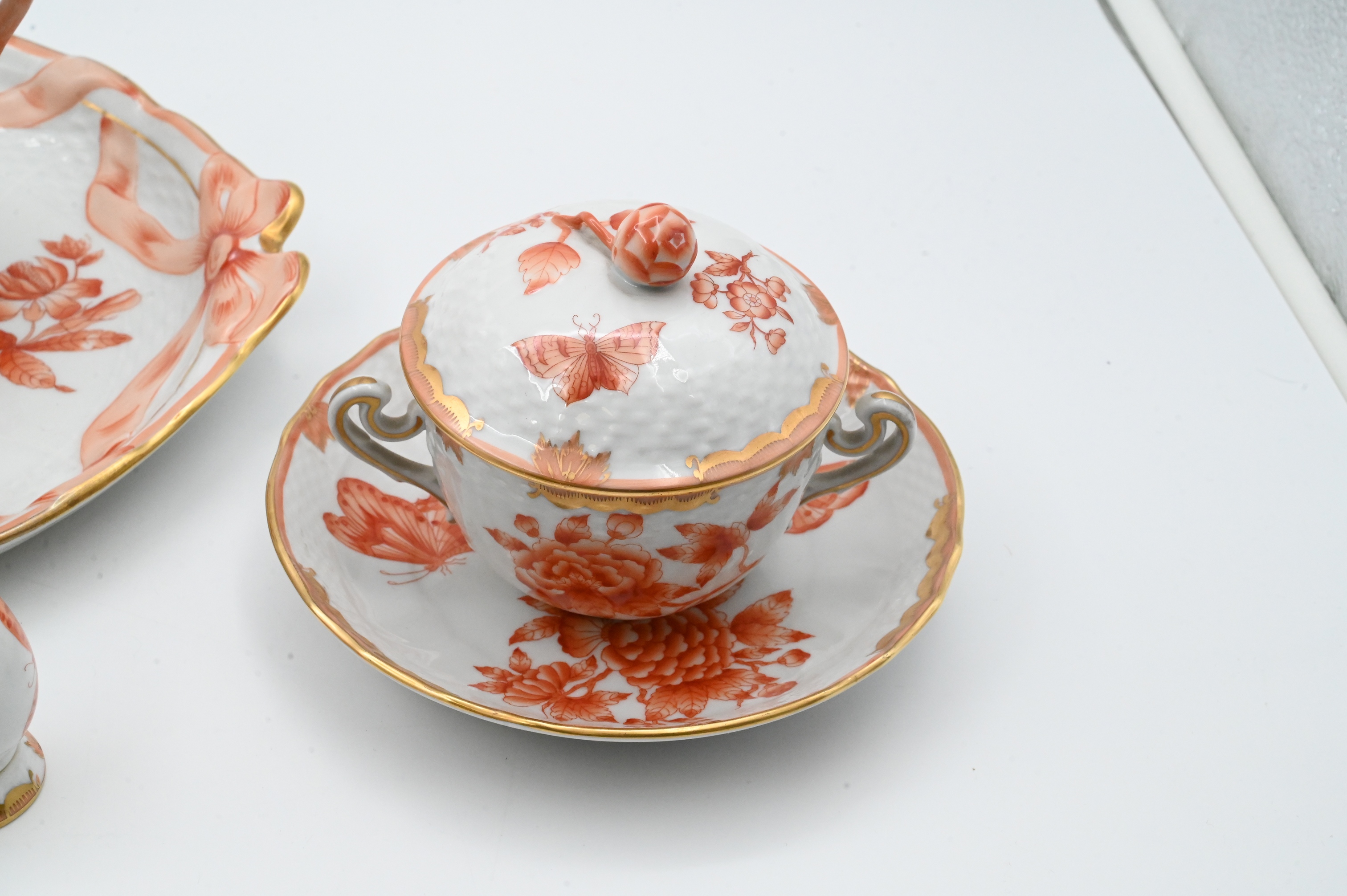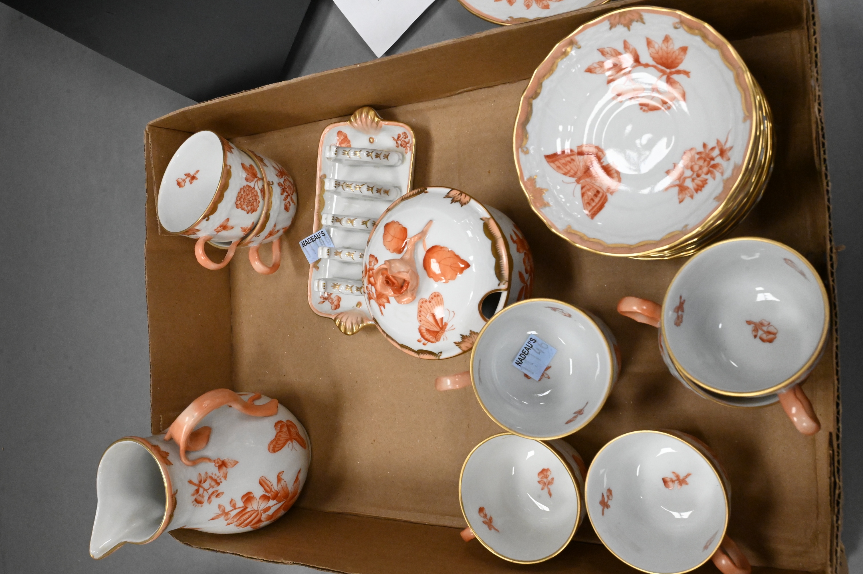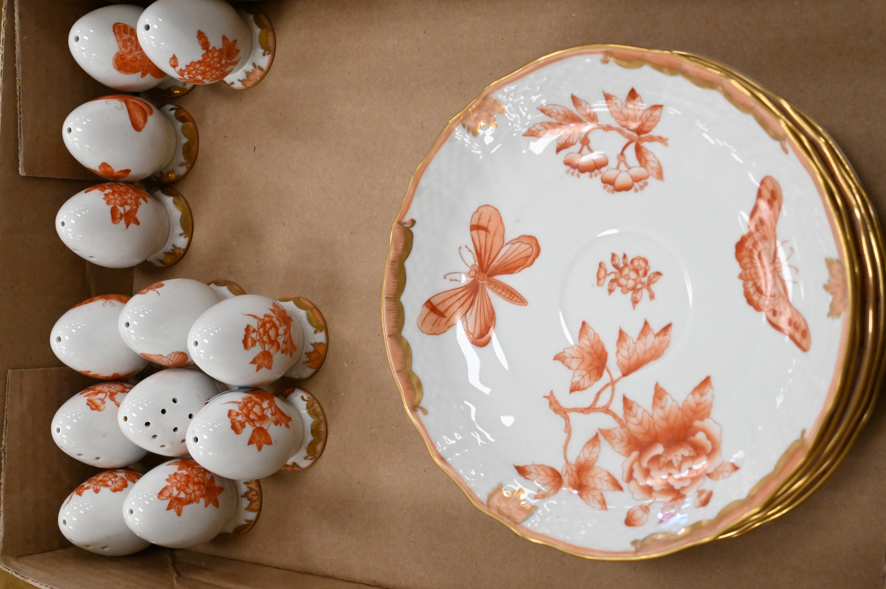 or Apponyi Orange pattern, each piece hand-painted with rust floral sprays and gilt foliate borders, many with applied rose finials, to include 10 cups, 10 saucers, teapot, coffee pot, chocolate pot, covered sugar, and creamer; 7 bread and butters, covered dish, 15 covered pot-de-crème cups, 26 underplates and 16 egg shaped salt and pepper shakers along with 4 additional serving pieces