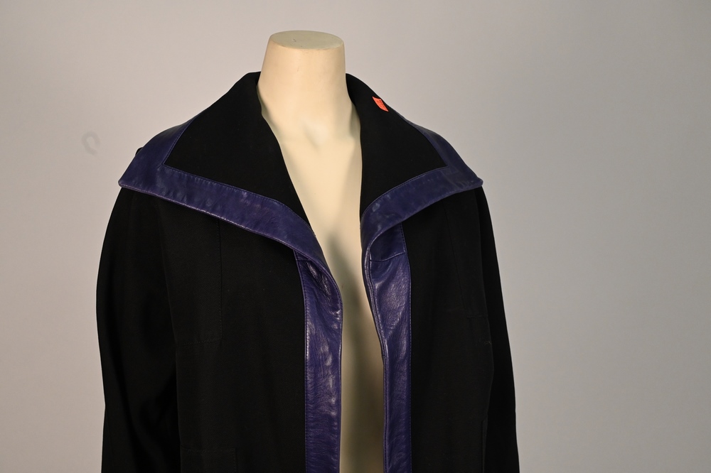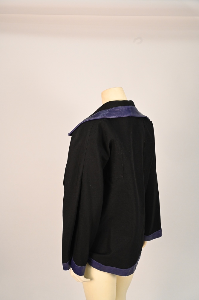 Lot 173: Bottega Veneta Black Leather Trimmed Coat, having blue leather trim and side pockets, size 44/14, condition consistent with wear, no…