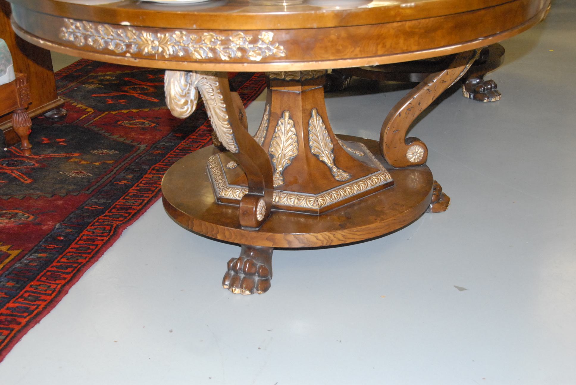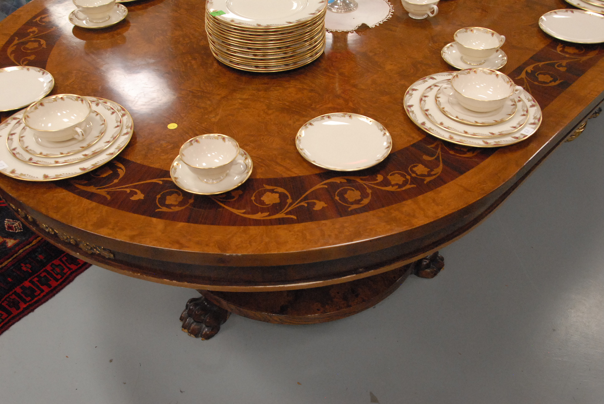 Burlwood double pedestal conference table with gilt metal decoration and paw feet.