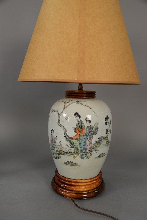 Chinese porcelain Famille Rose covered jar with three painted Guanyin figures by a tree on one side and signed on the back, made into table lamp. vase ht. 11 in. total ht. 28 in.