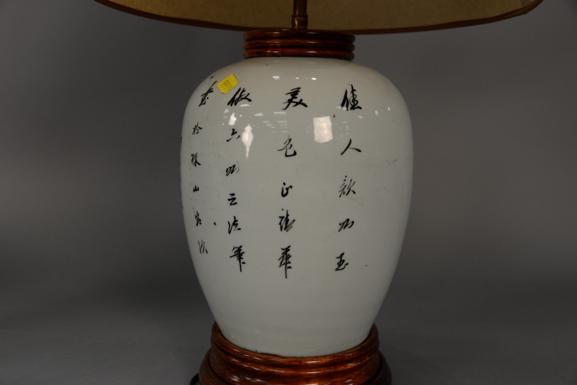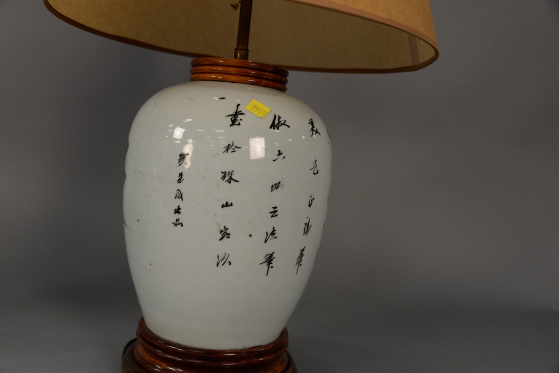 Lot 173: Chinese porcelain Famille Rose covered jar with three painted Guanyin figures by a tree on one side and signed on the back, made into table lamp. vase ht. 11 in. total ht. 28 in.