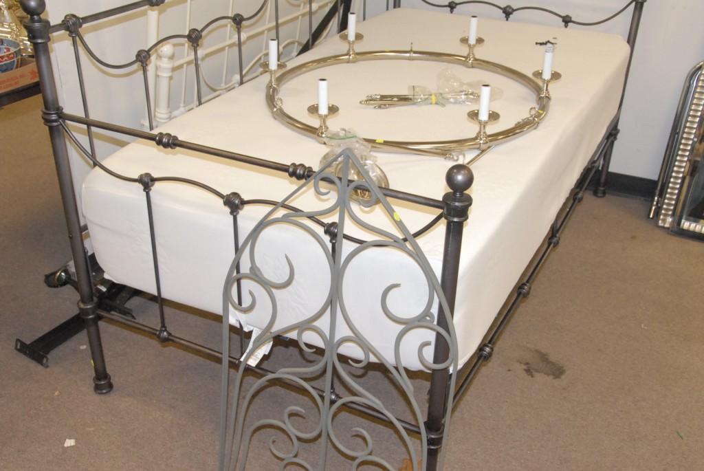 Contemporary chrome hanging light, iron grate, white contemporary double sized bed with rails and daybed with Tempur-Pedic type mattress.