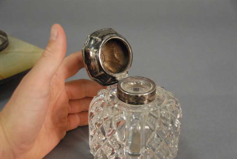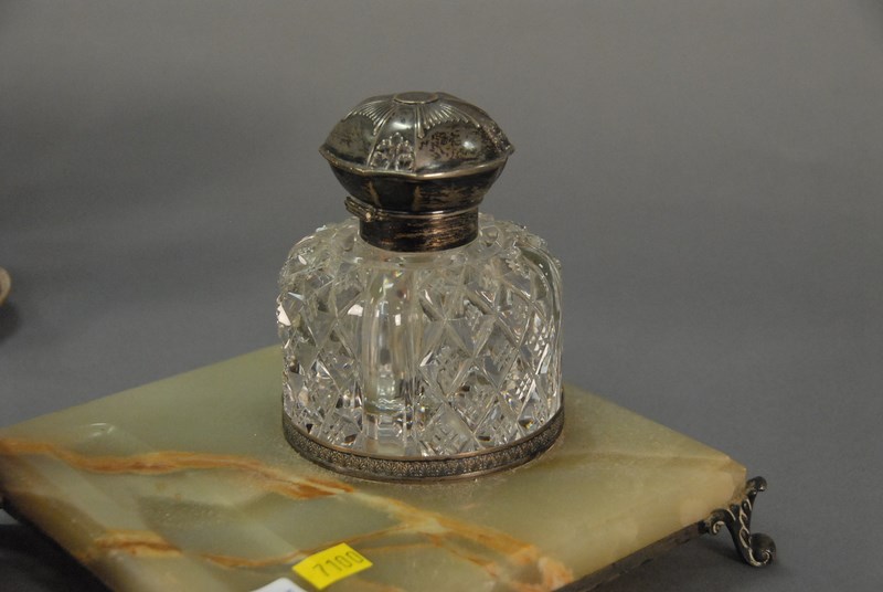 Lot 173: Crystal inkwell with sterling silver top on onyx base, inkwell: ht. 5in. base: ht. 2 in. top: 8 x 8.