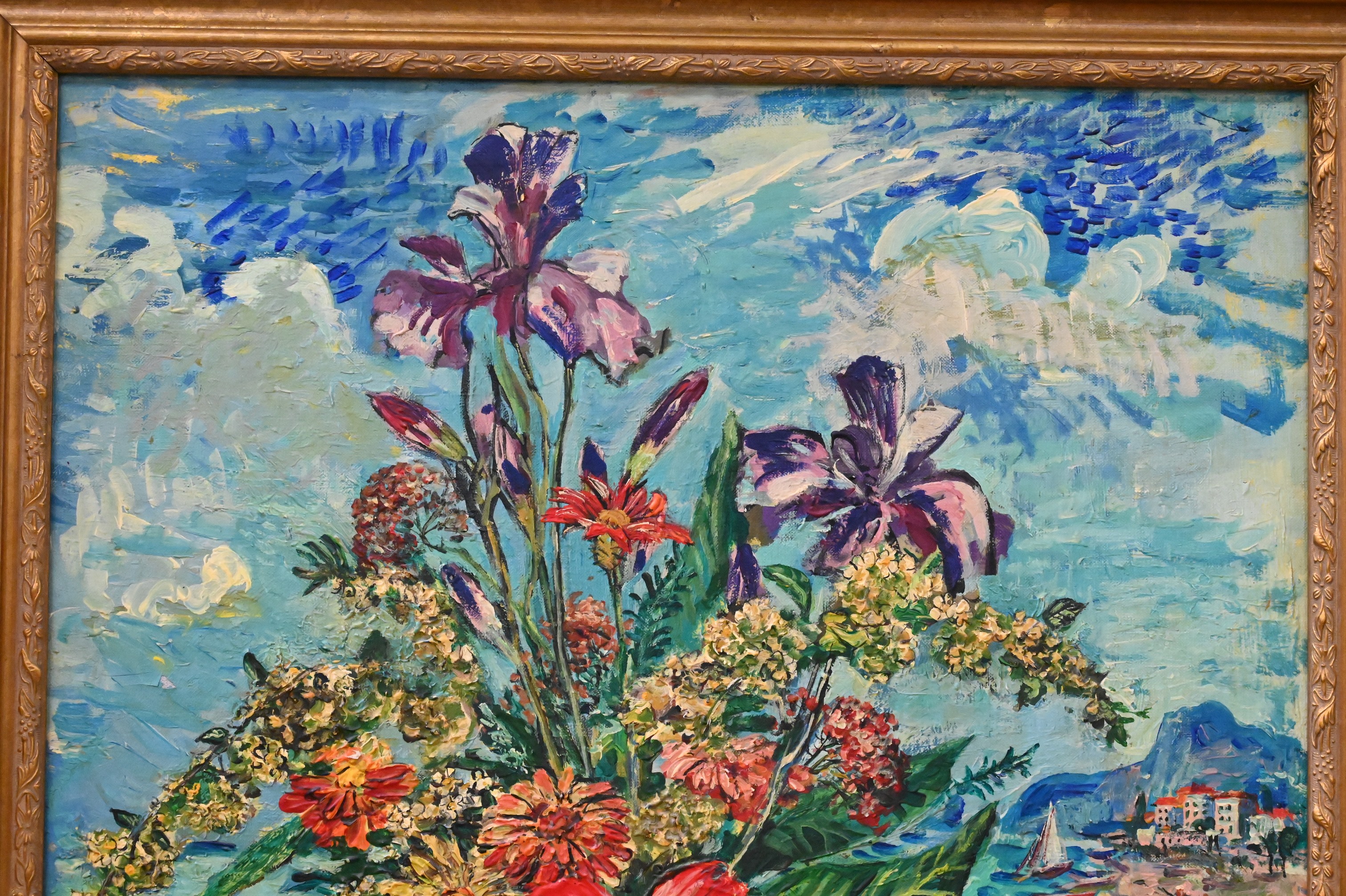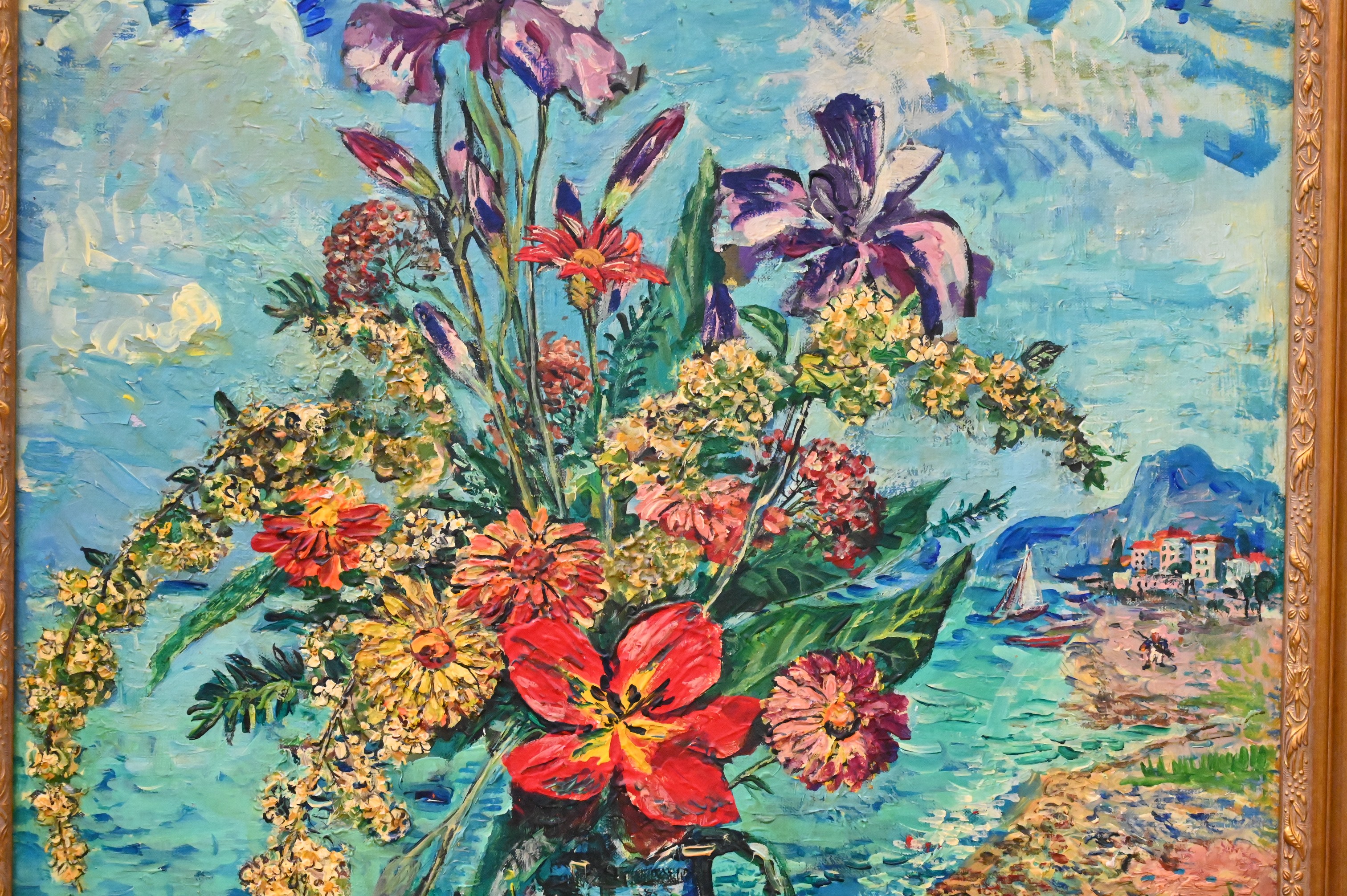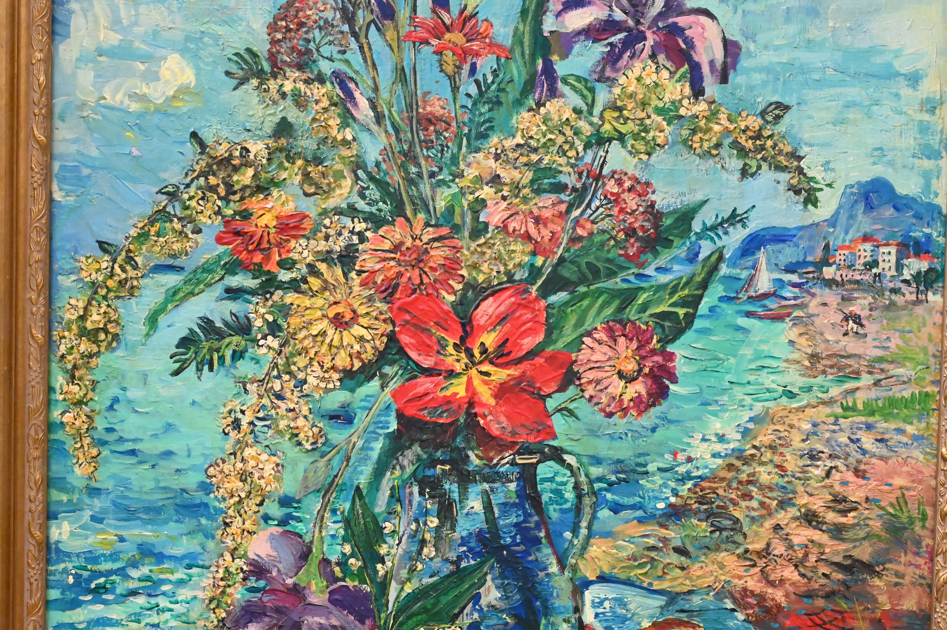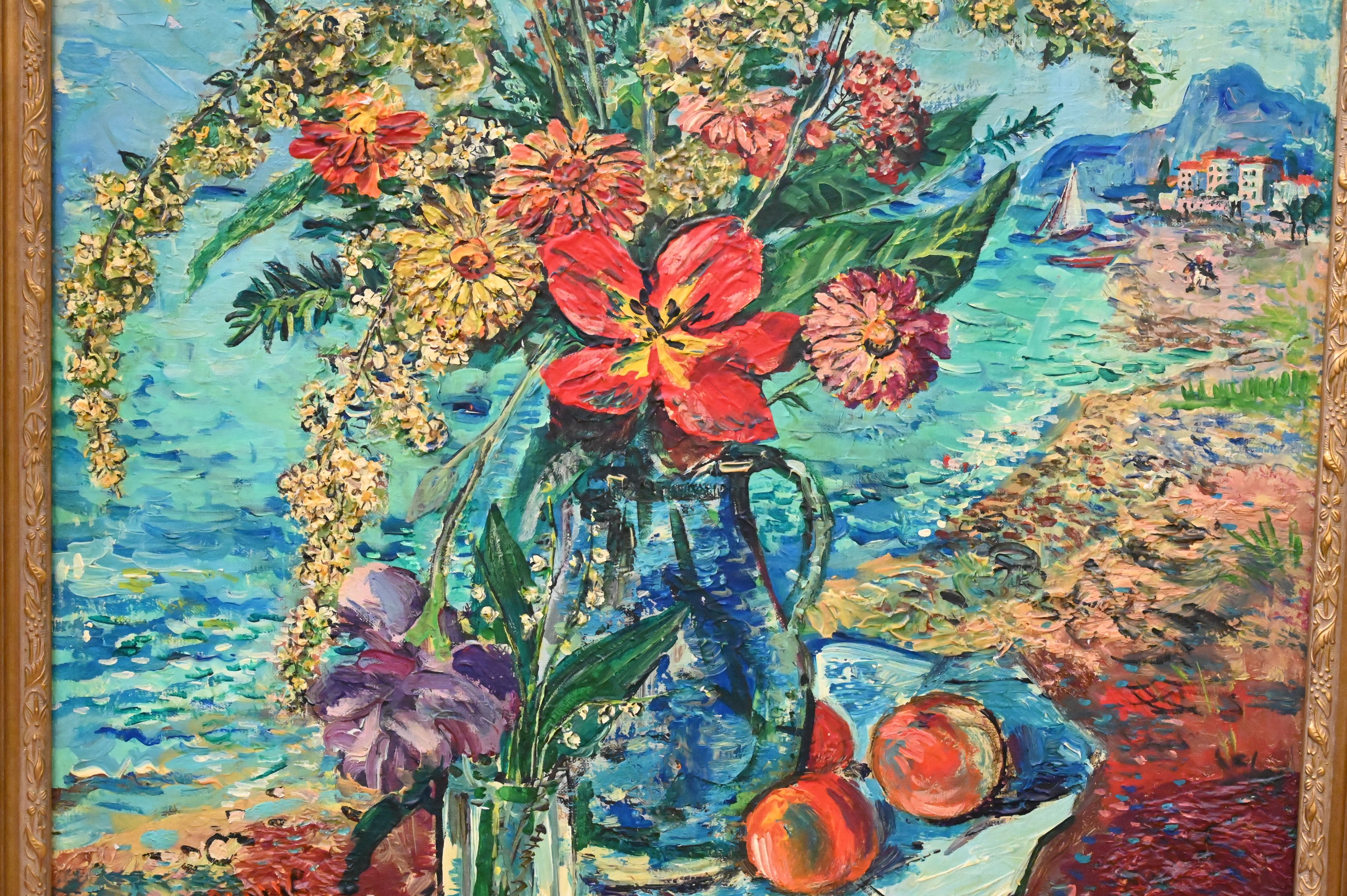 Still life of flowers, on a beach with a coastal city background, 1945