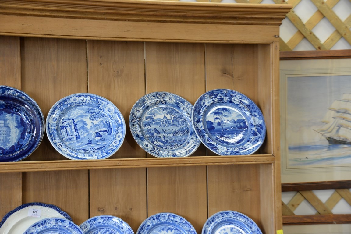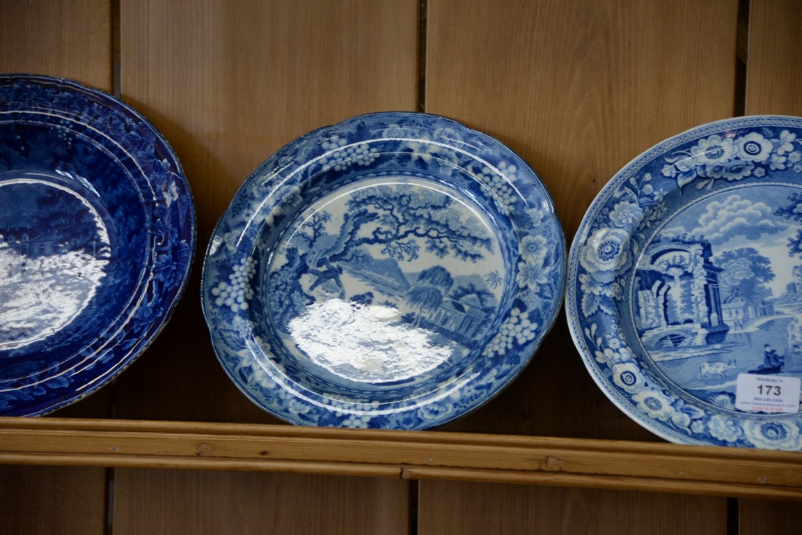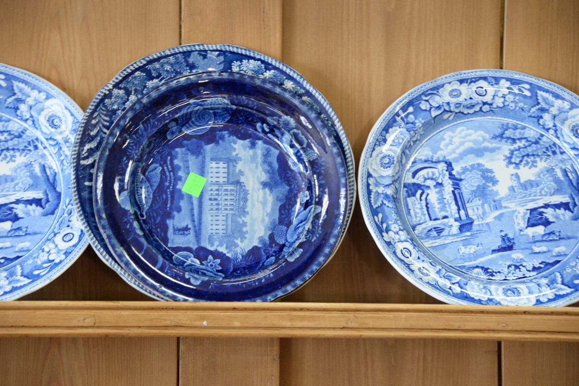 Lot 173: Eight Historic blue Staffordshire plates and bowls Marine Hospital Louisville Kentucky 3 crack, Vue De Chateau Ermenonville b…