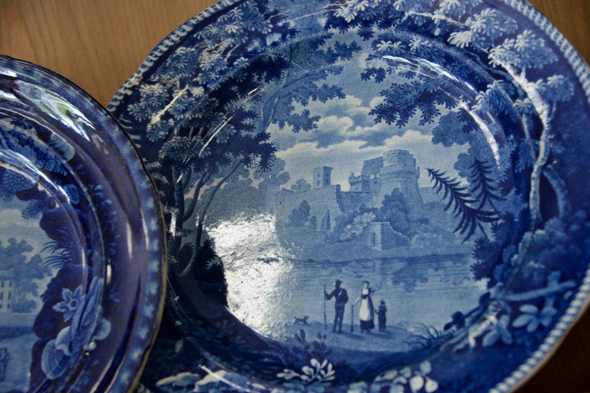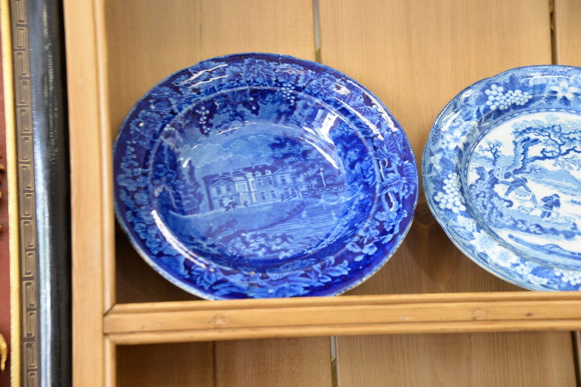 Eight Historic blue Staffordshire plates and bowls Marine Hospital Louisville Kentucky 3 crack, Vue De Chateau Ermenonville bowl, italian Scenery Castle of Lavenza bowl, Hamilton Store plate, Adam’s Blenheim Oxfordshire, and three plates not marked. smallest: dia. 8 1/ 2in., largest: dia. 10 in.