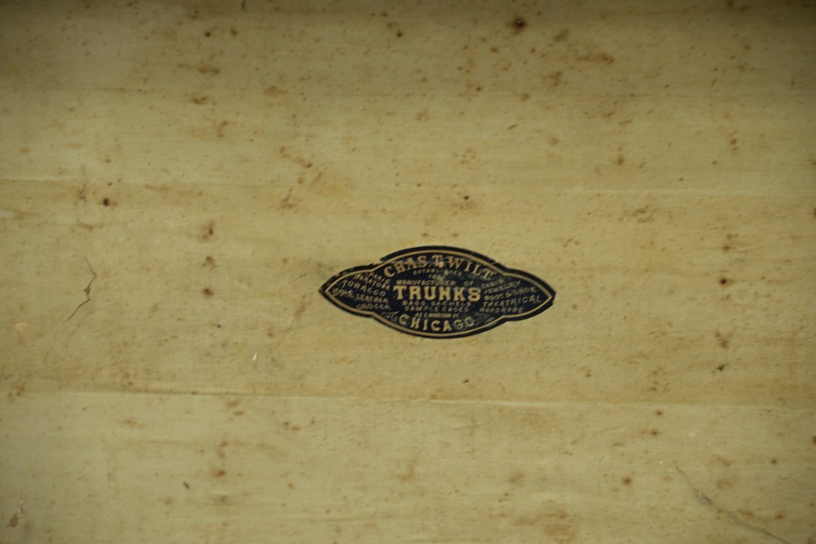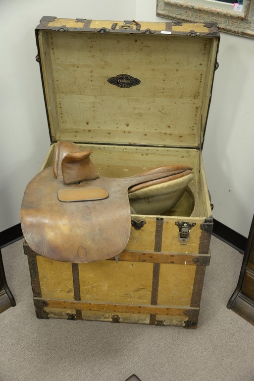English woman’s riding saddle in original trunk marked Chas. T. Wilt Chicago. trunk: ht. 29 in. wd. 28 in. dp. 21 in., saddle: lg. 23 in.