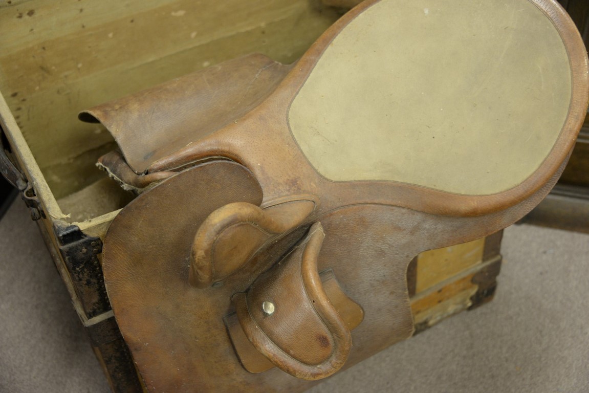 Lot 173: English woman’s riding saddle in original trunk marked Chas. T. Wilt Chicago. trunk: ht. 29 in. wd. 28 in. dp. 21 in., saddle: lg….