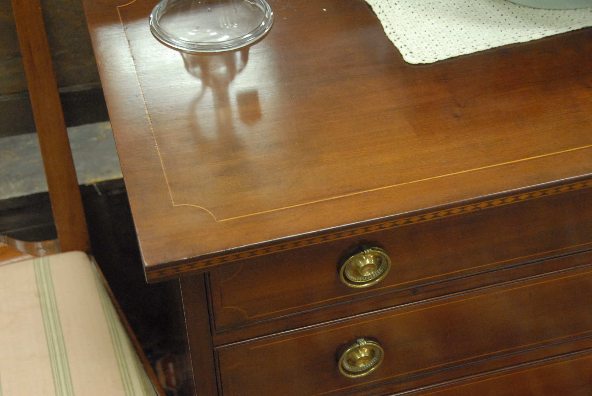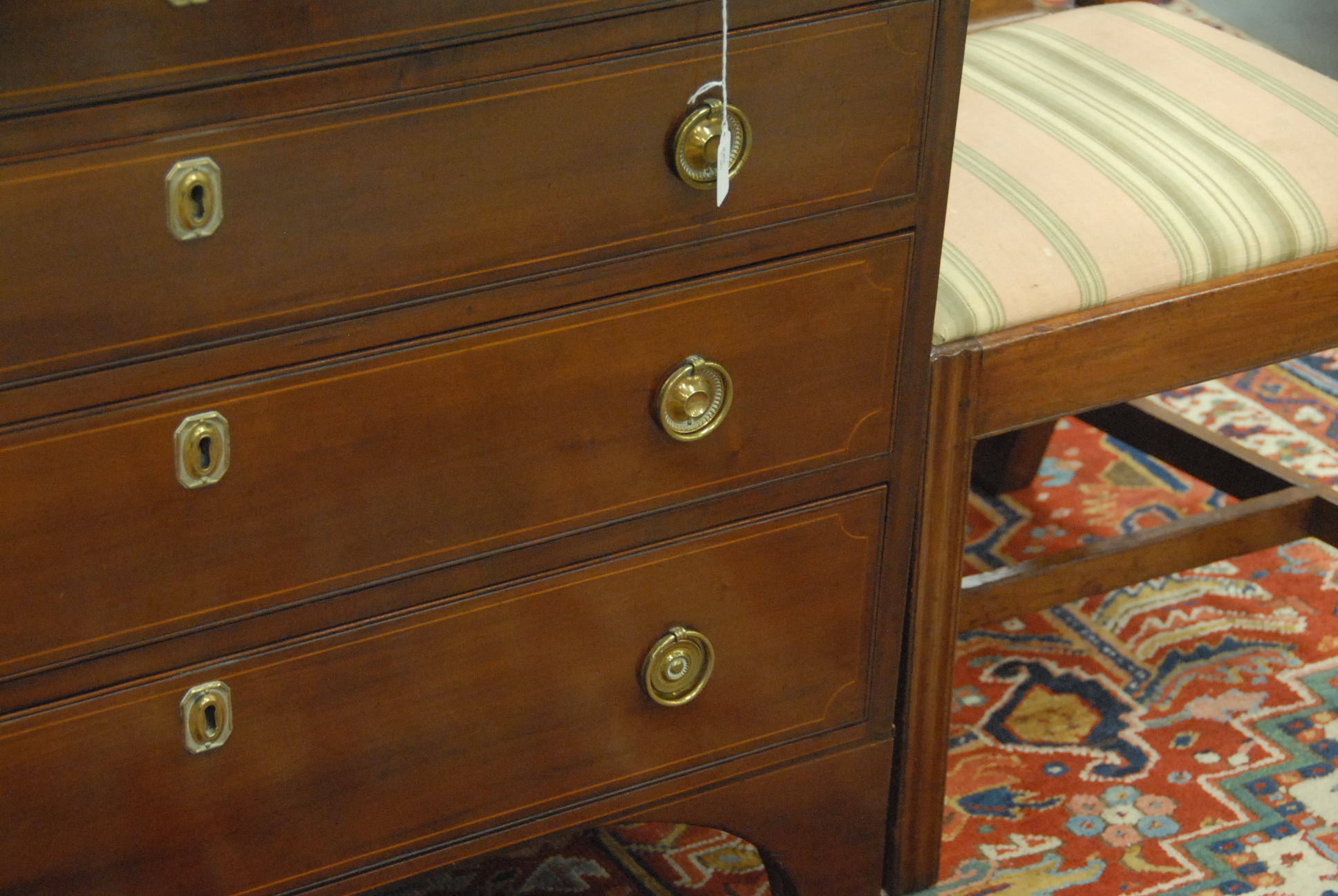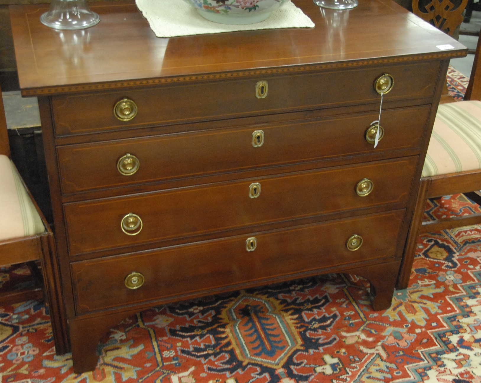 Lot 173: Federal cherry four drawer chest having diamond and line inlays and four graduated drawers all on unusual bracket base and original brasses, pine and chestnut secondary wood, circa 1780-1800. ht. 34 in. wd. 38 in. dp. 19 in. Provenanc