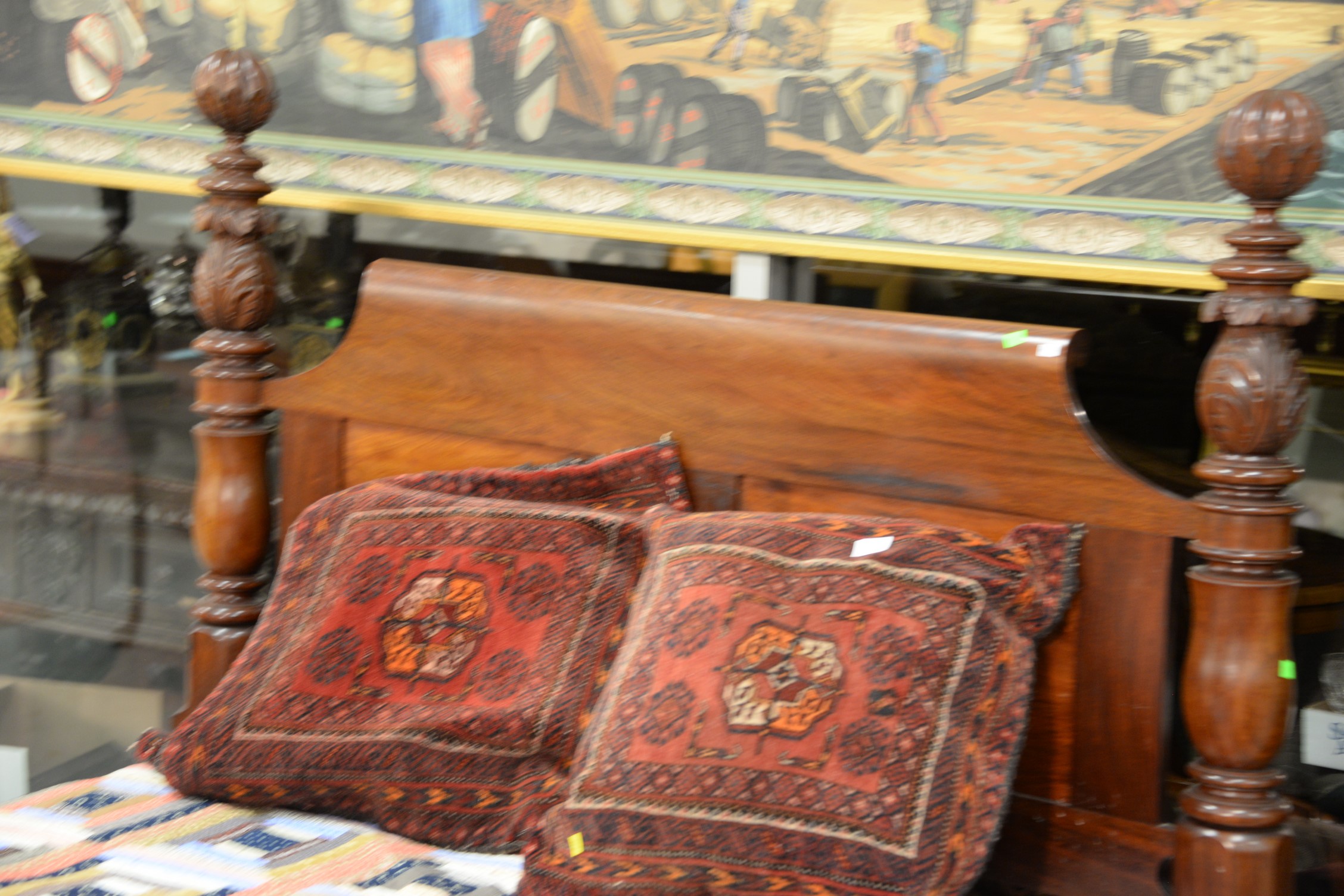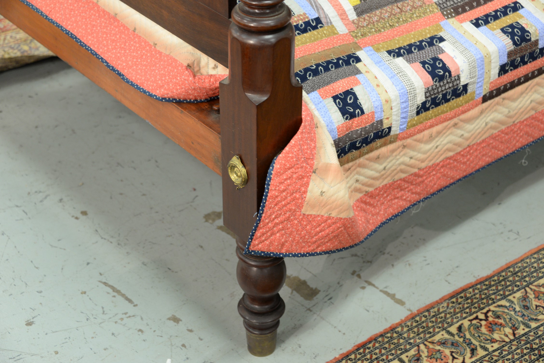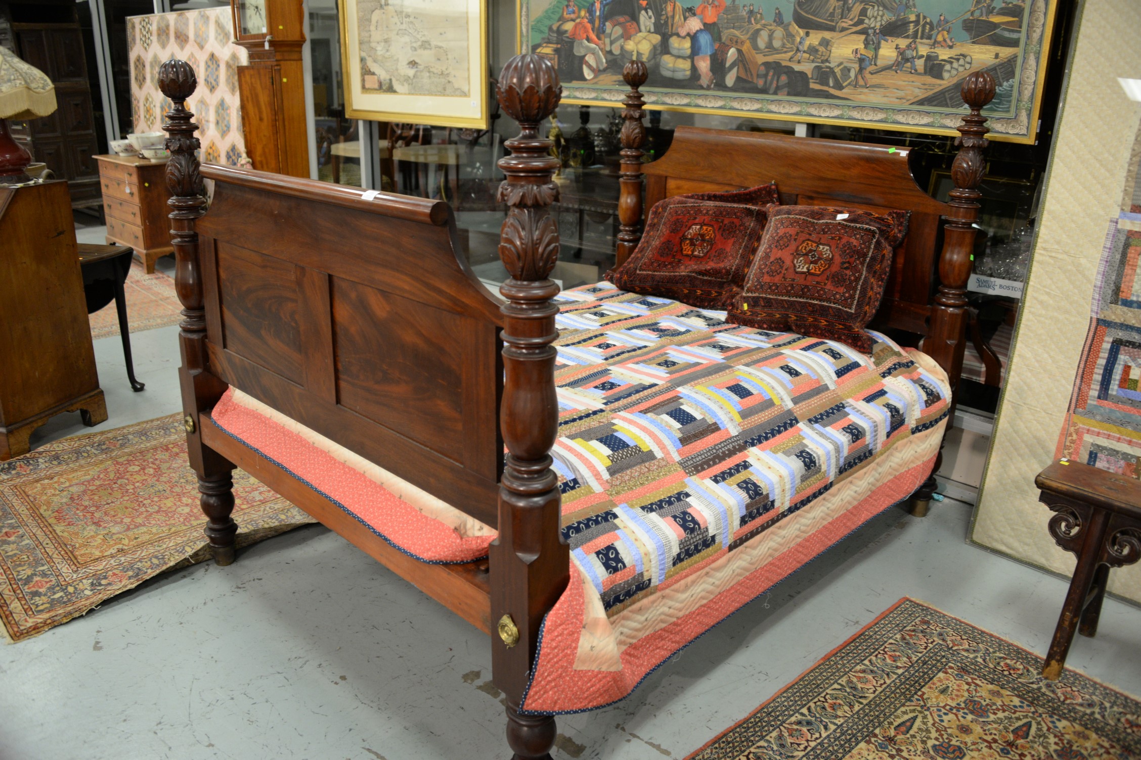 Lot 173: Federal mahogany four post rope bed with carved cannonball tops and acanthus carved posts. ht. 60 in. total lg. 80 in. total wd…