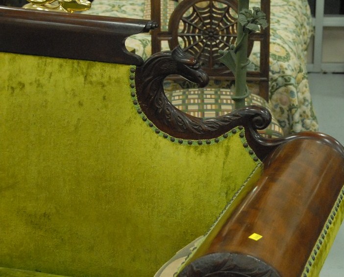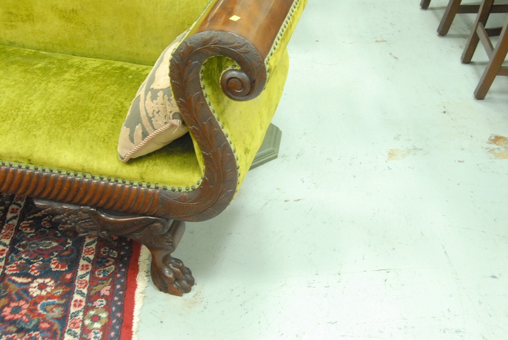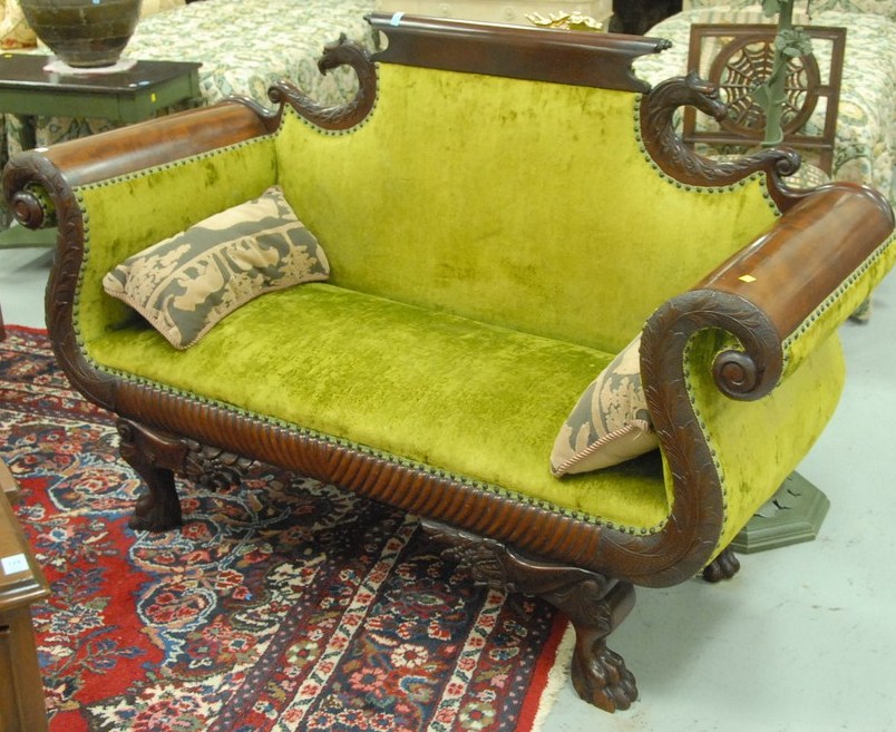 Lot 173: Federal style loveseat with rolled arms, paw feet, and bird’s heads on back small chips on toes, ht. 42in. lg. 65in.
