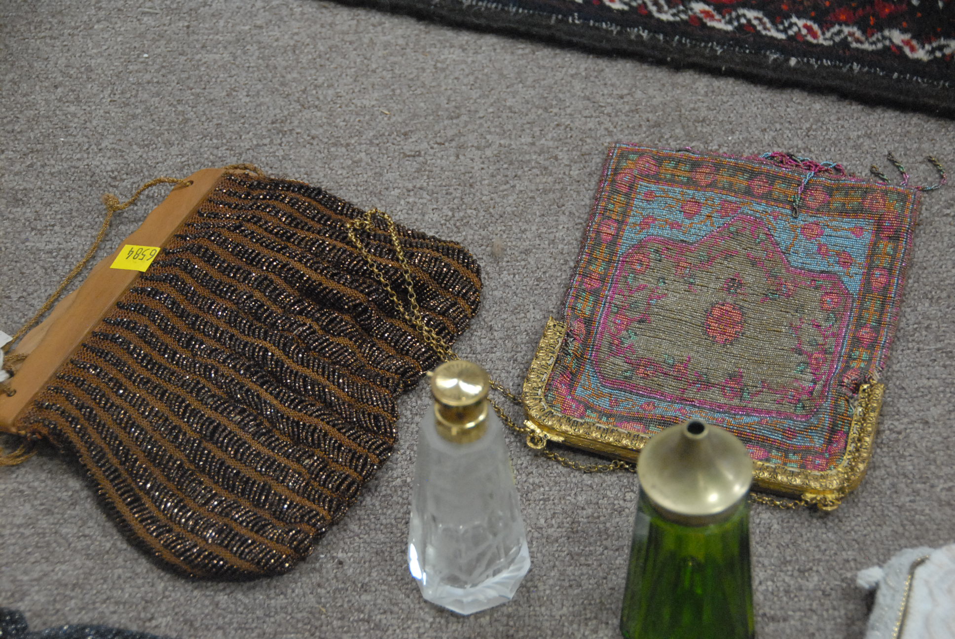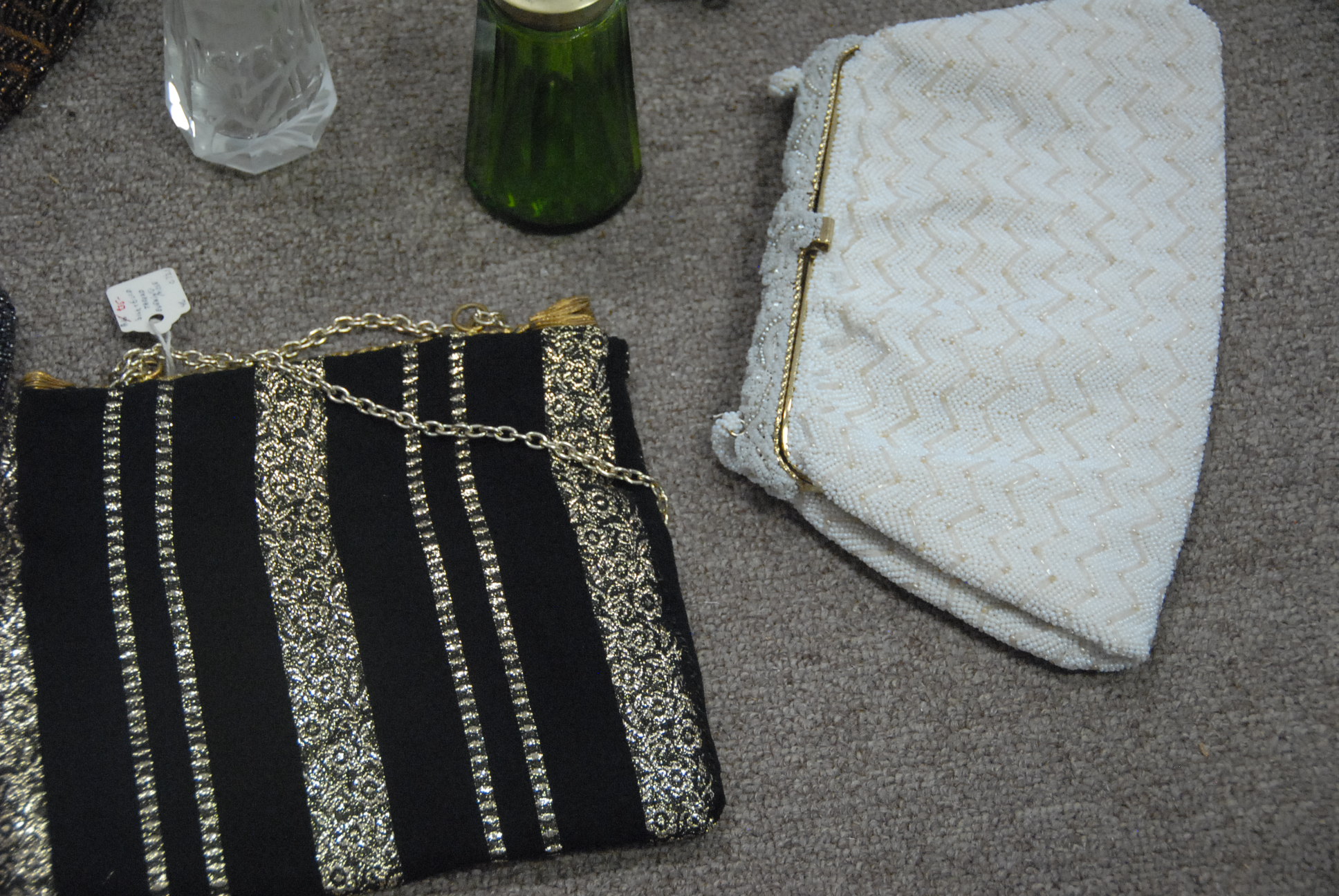 Lot 173: Group lot of evening bags including beaded bags, a cologne bottle, and cut crystal pump perfume bottle with etched flowers.