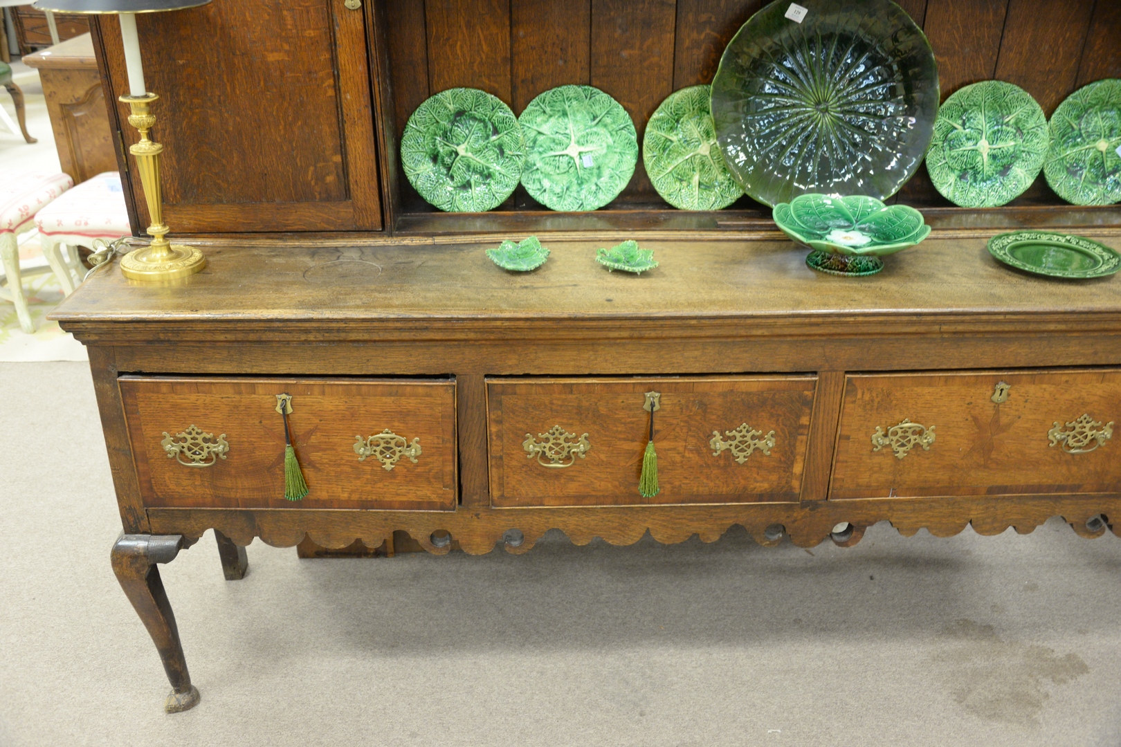 Large Oak Welsh Dresser, in two parts, legs spliced, height 89 1/2 inches, width 96 1/2 inches, depth 19 inches. Provenance: Christie’s, South Kensington, February 2000, Lot 189.