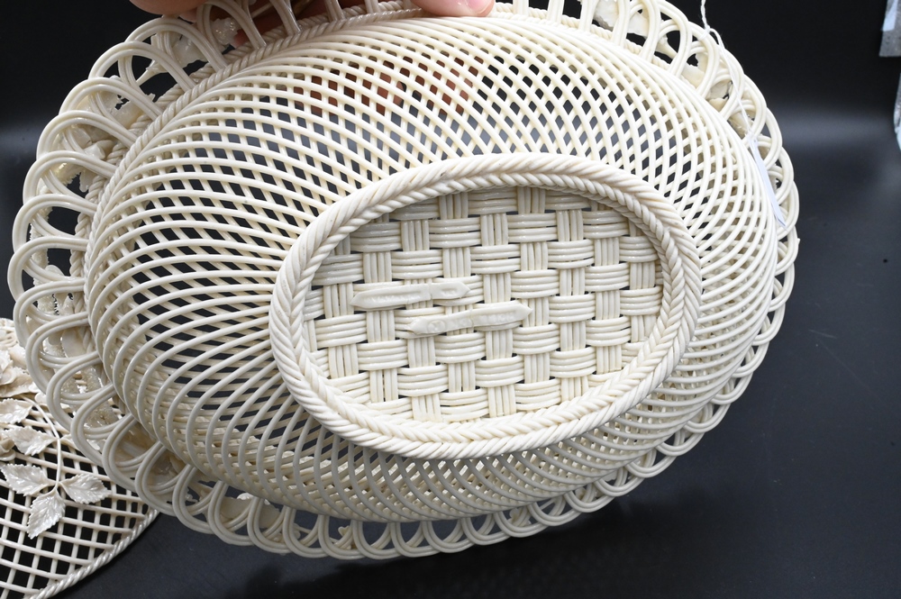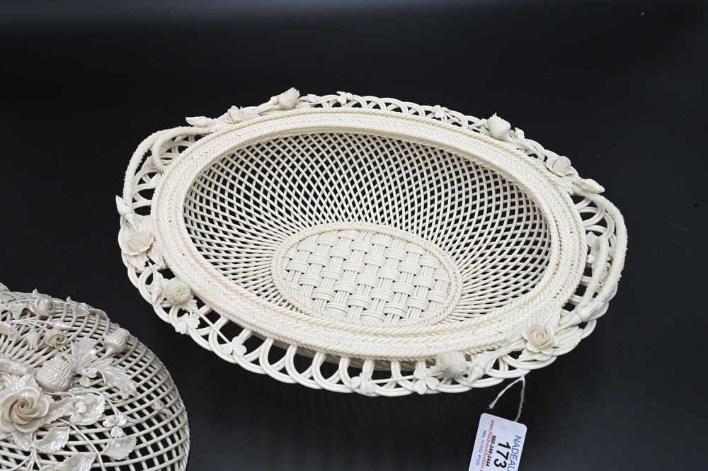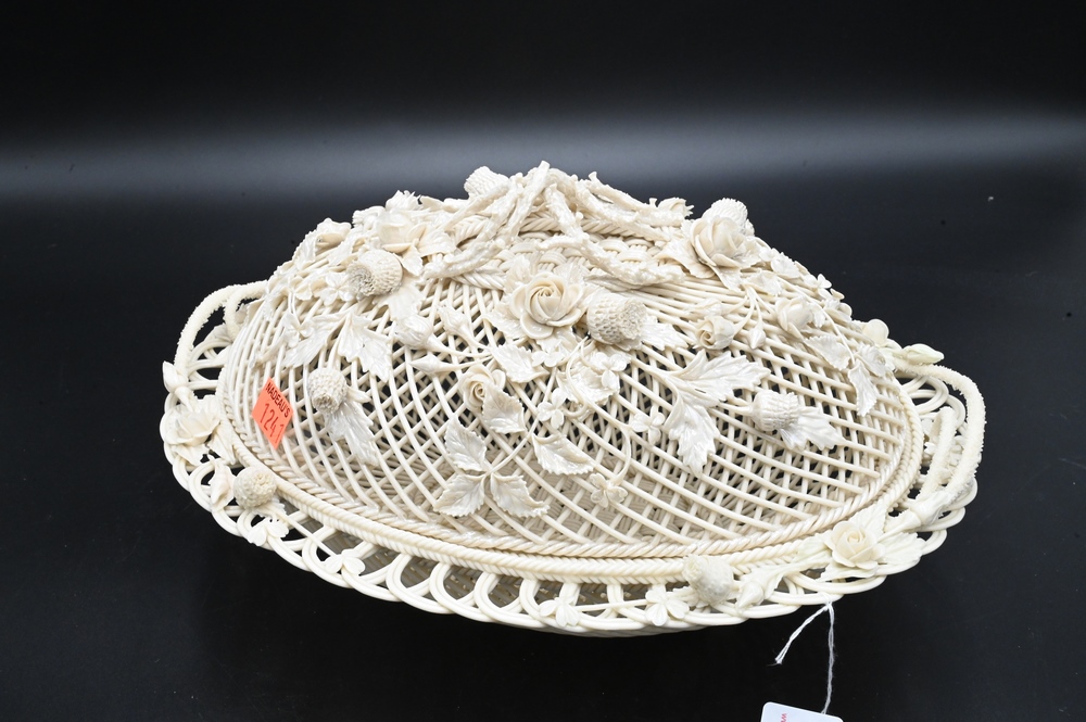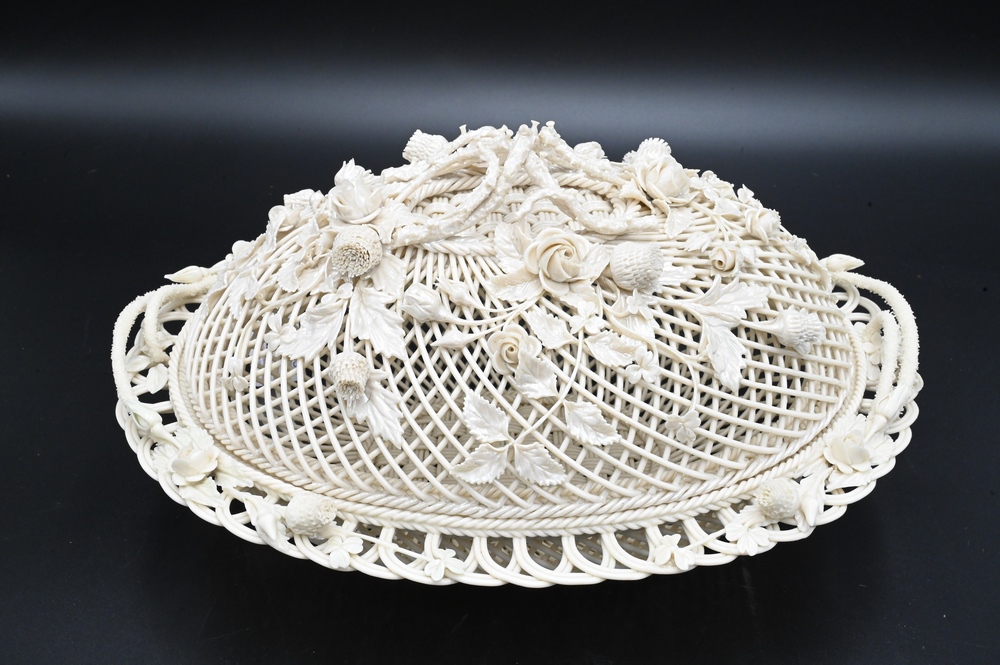 Lot 173: Large Oval Belleek Covered Basket, four strand, having reticulated cover and base with flower and leaf design, stick handles, impressed mark on bottom, height 7 inches, length 13 inches. Provenance: Collections of Norma Reilly, New Jersey.