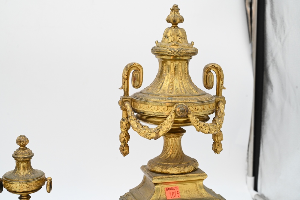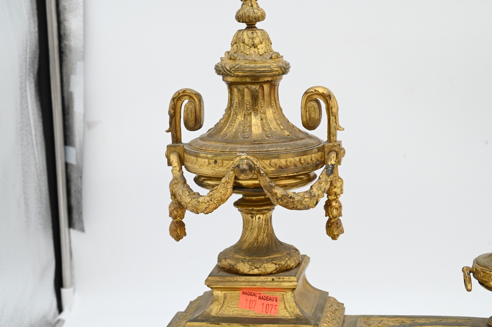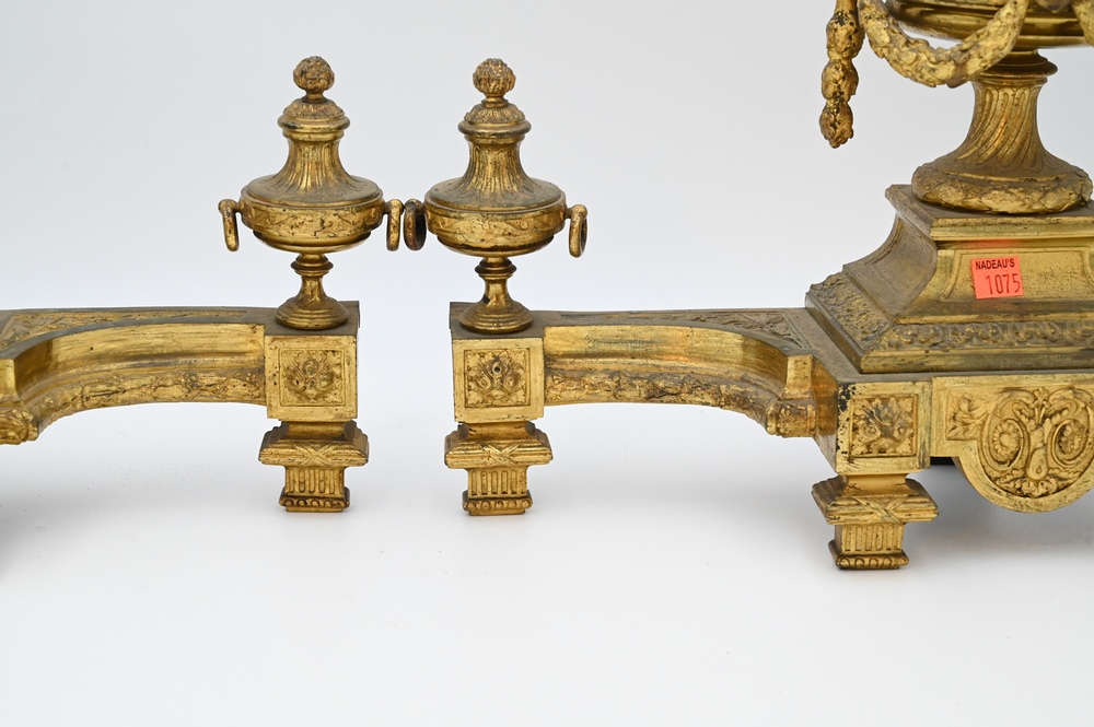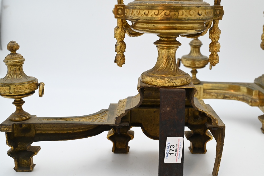 Pair of Gilt Bronze French Chenets, urn form with swags, height 15 inches.