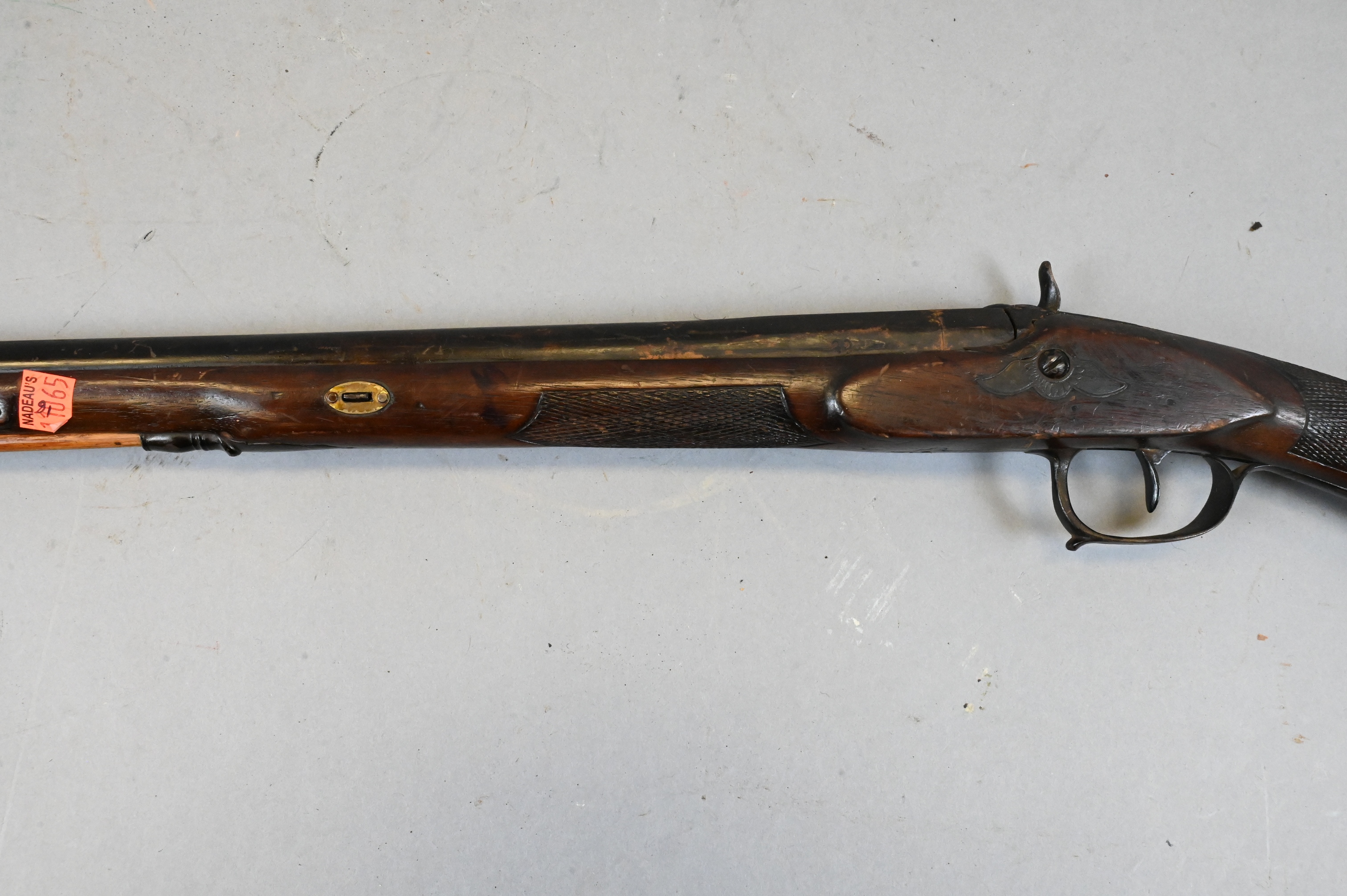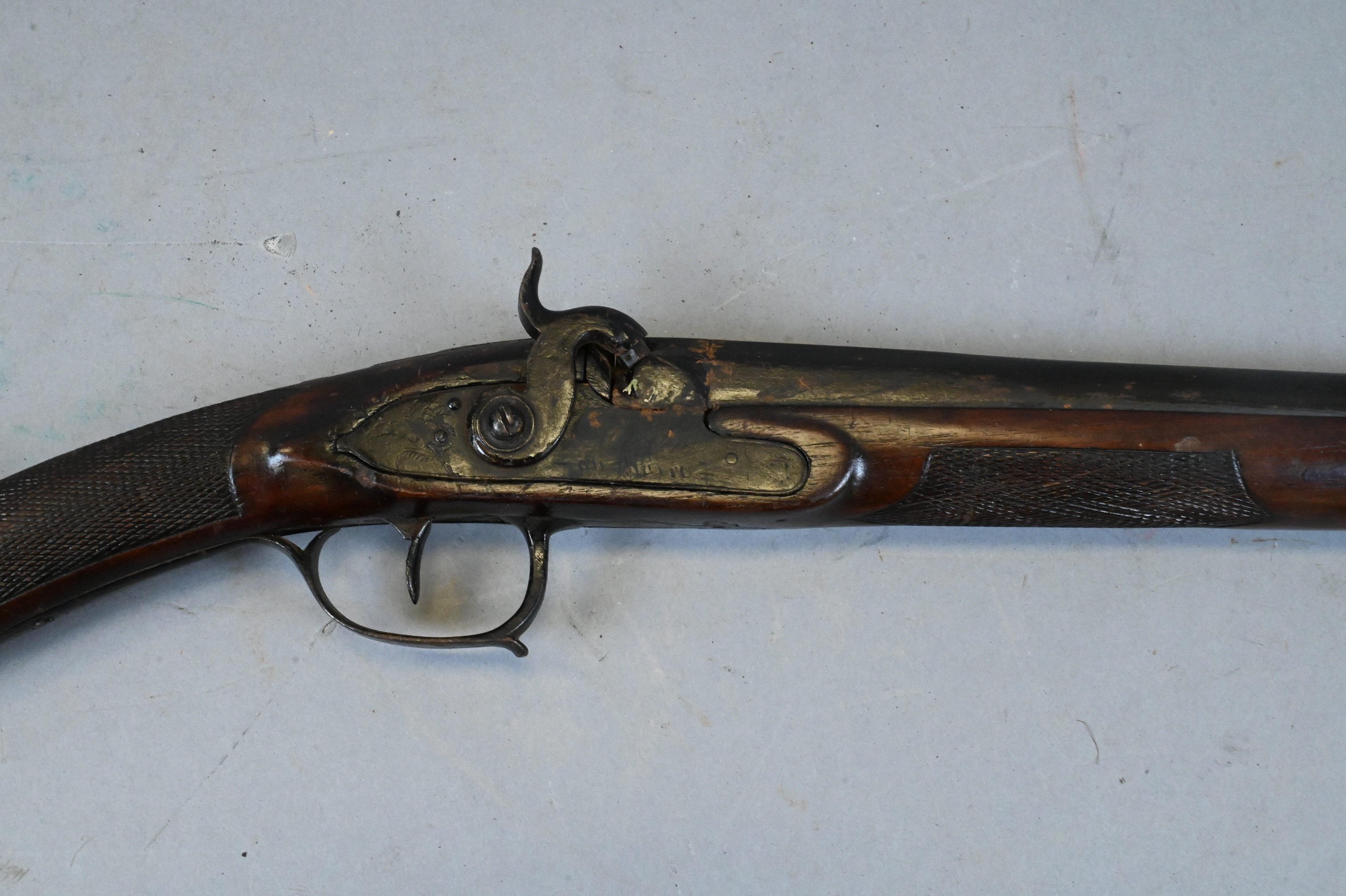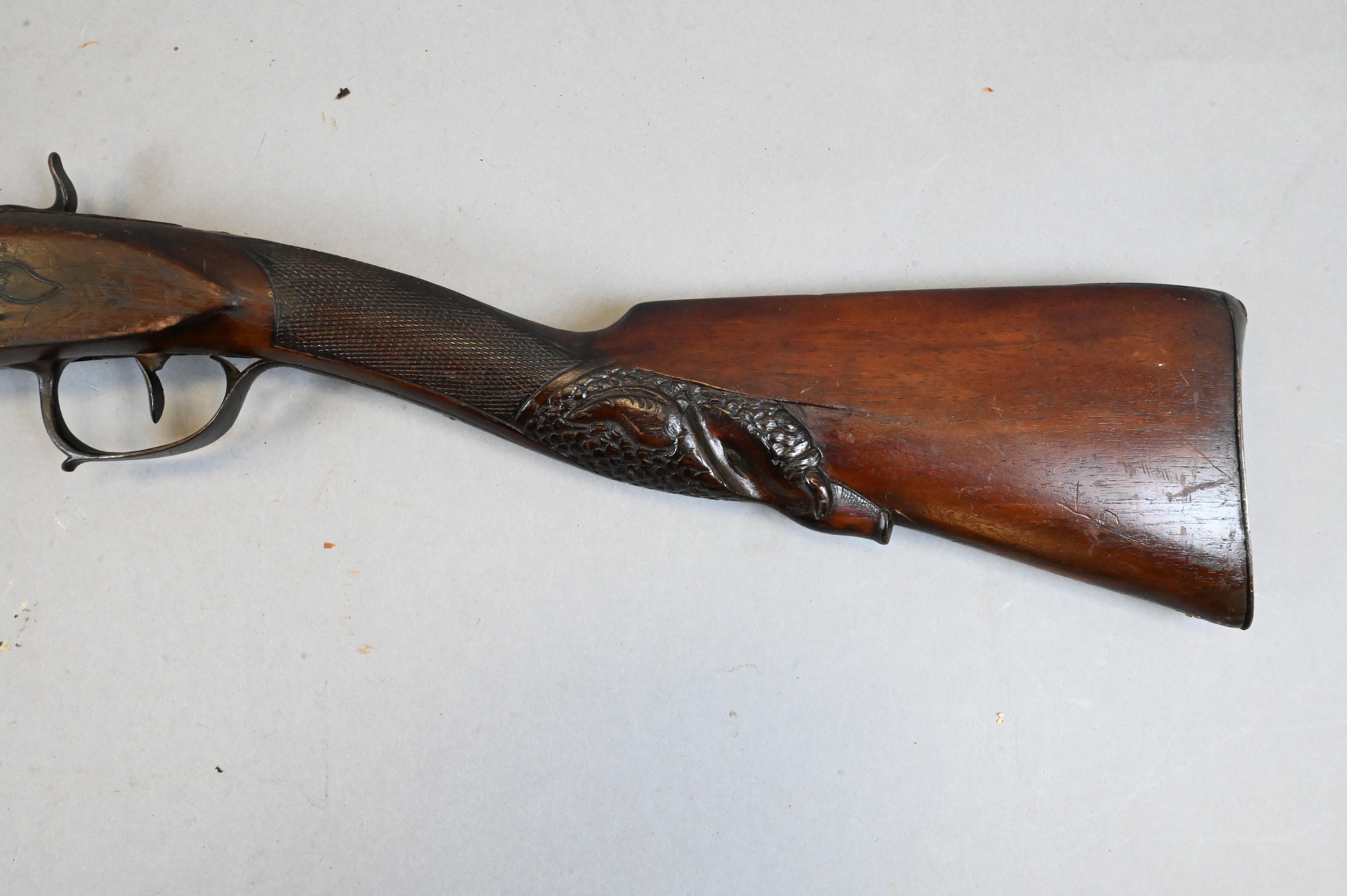 A percussion long gun with checkered walnut stock, the grip carved in relief with an animal’s head, possibly a boar with pronounced tusks. Fitted with iron mounts and percussion lock.