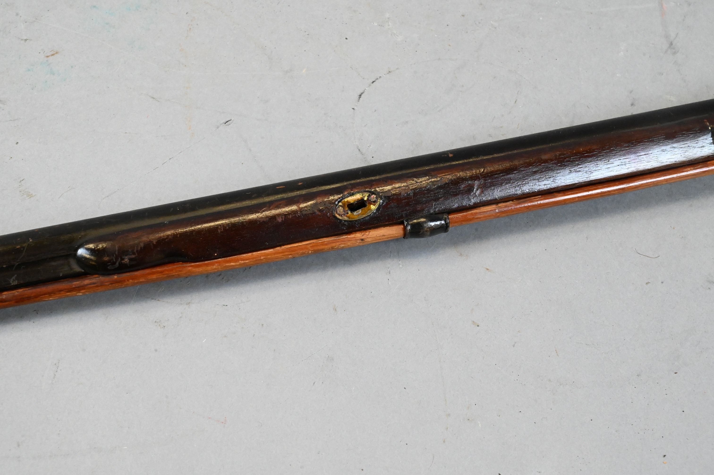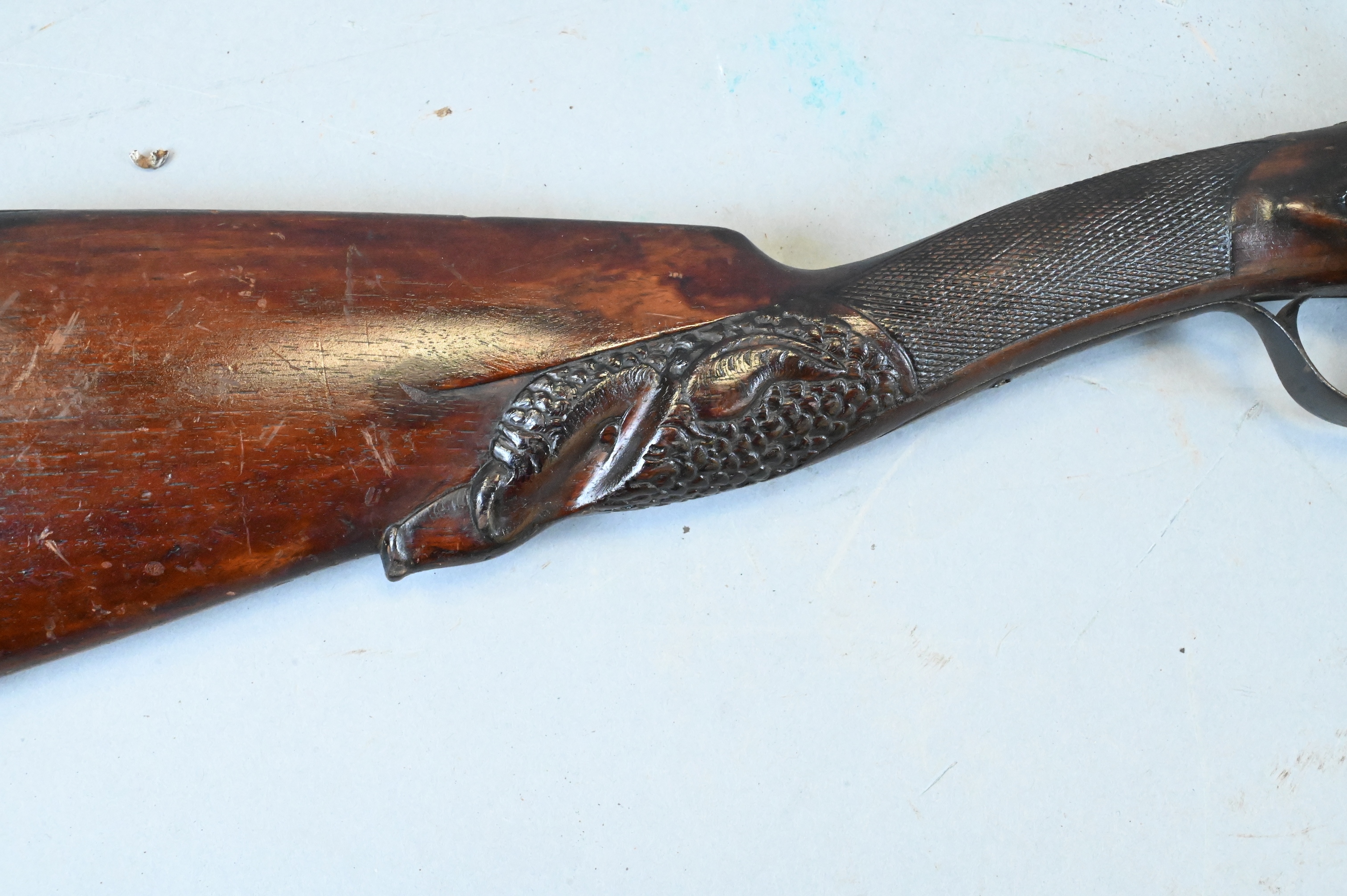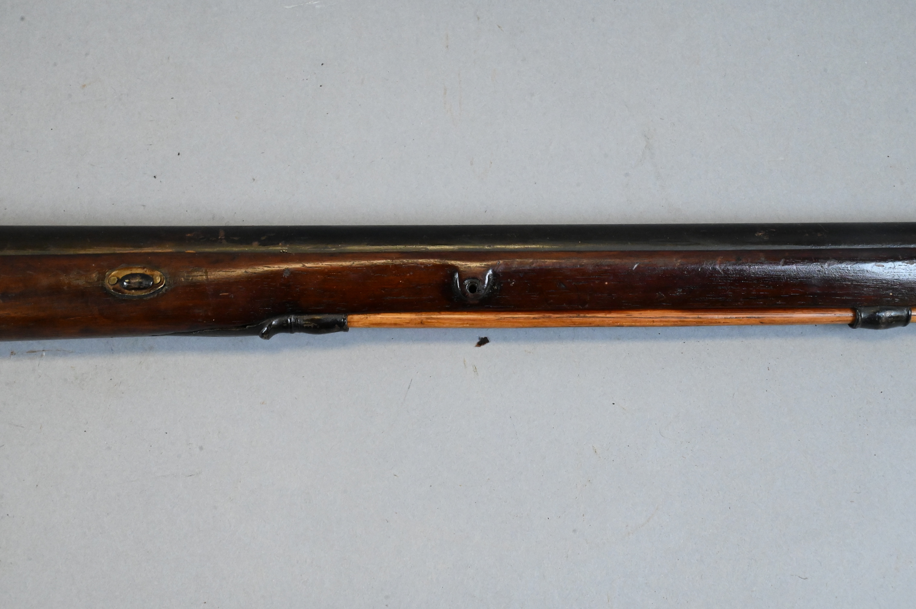 A percussion long gun with checkered walnut stock, the grip carved in relief with an animal’s head, possibly a boar with pronounced tusks. Fitted with iron mounts and percussion lock.